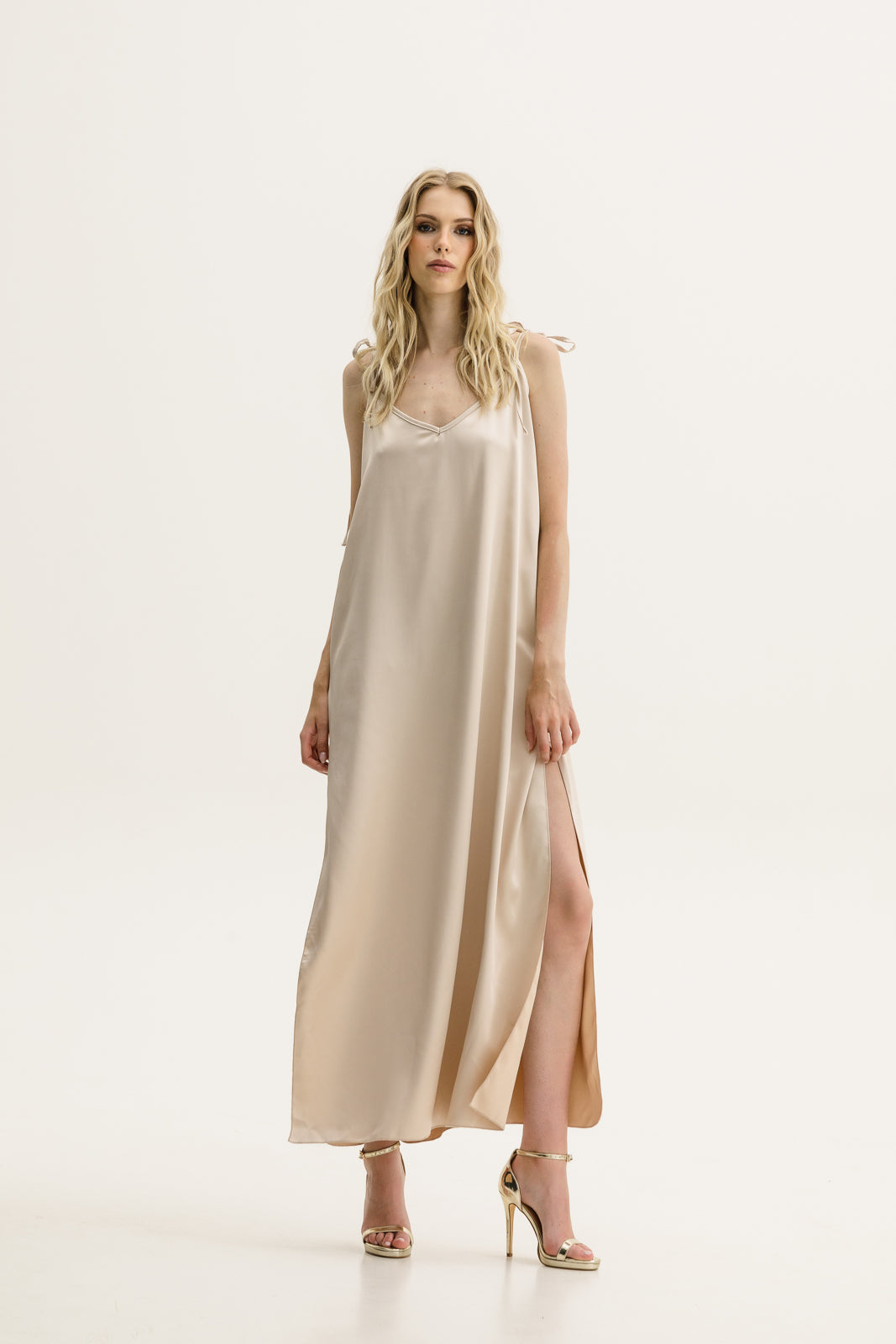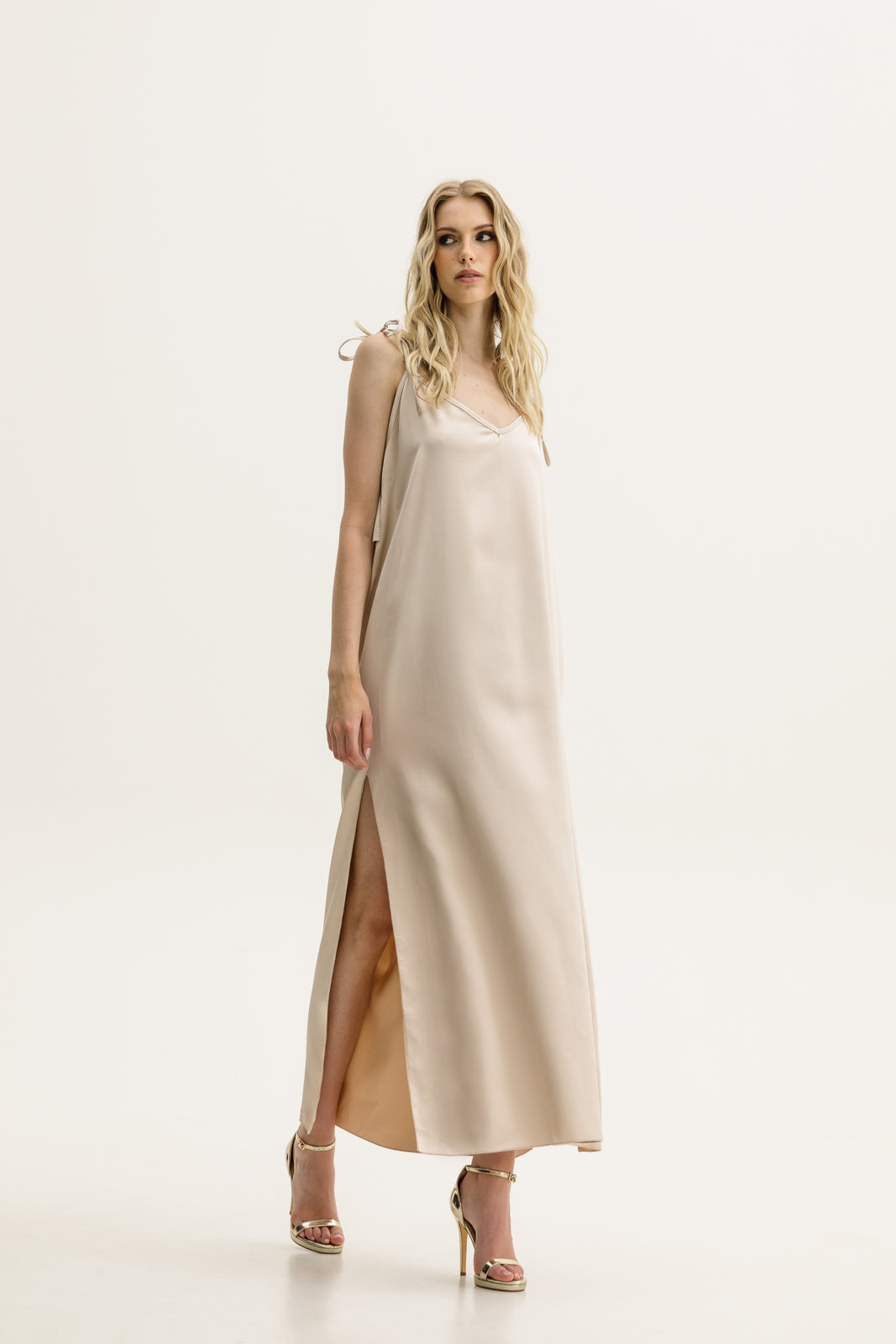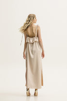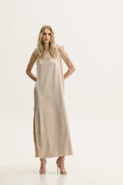 The Tarlo Dress in vanilla features a soft, flowing design with a light, feminine silhouette. Its subtle, elegant tone makes it perfect for various occasions, offering effortless style and versatility. Both sides slits and ruffled back detailing. Made in a satin, stunning fabrication is ideal for layering or wearing solo, this dress is a timeless addition to any wardrobe, with a flattering fit that moves gracefully with you.