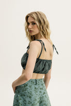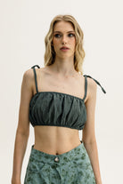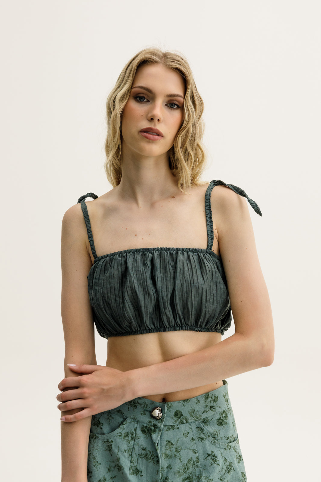 Delicate yet daring, this army green crop top is made from airy, pleated fabric that flows effortlessly over the body. The adjustable shoulder ties and elasticated edges create a soft bubble effect that flatters the silhouette. Easy to wear from day to night, it's a timeless summer piece with a modern edge.