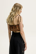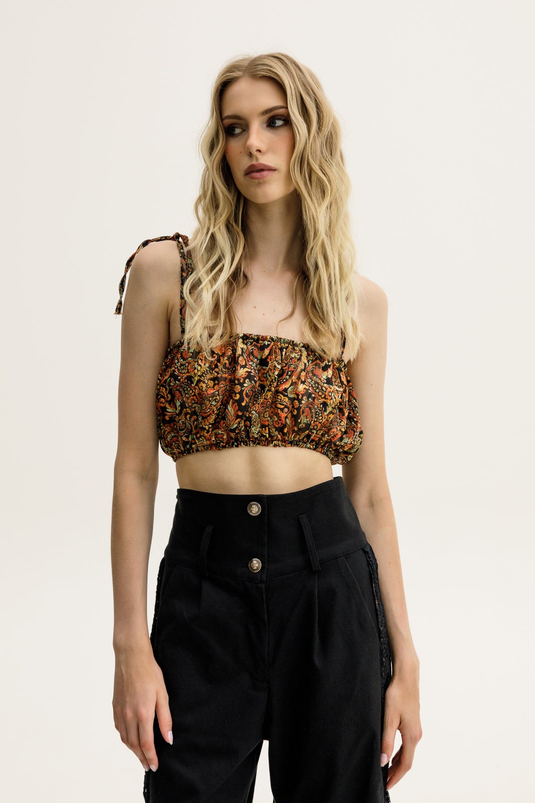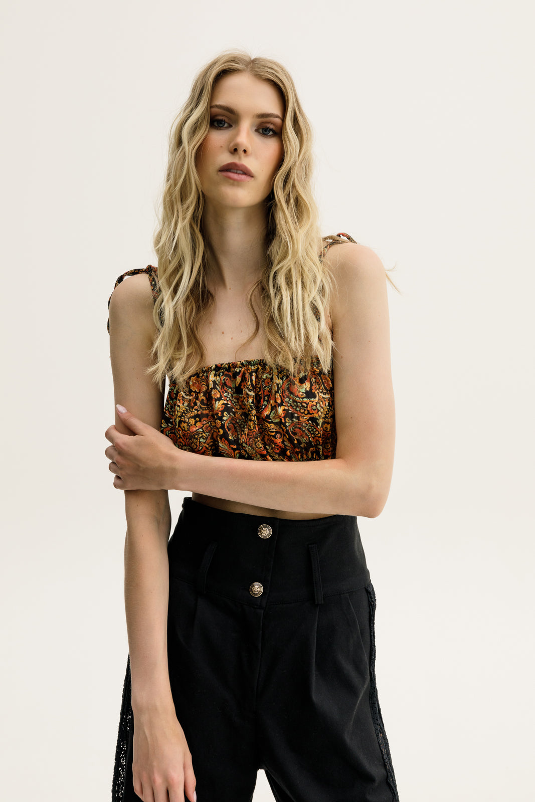 A moodier twist on the boho classic. This paisley tie-strap top comes in a rich burnt orange and black palette, bringing depth and texture to your summer lineup. With its signature gathered silhouette and shoulder ties, it’s both romantic and bold — just like the girl who wears it.