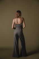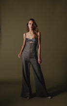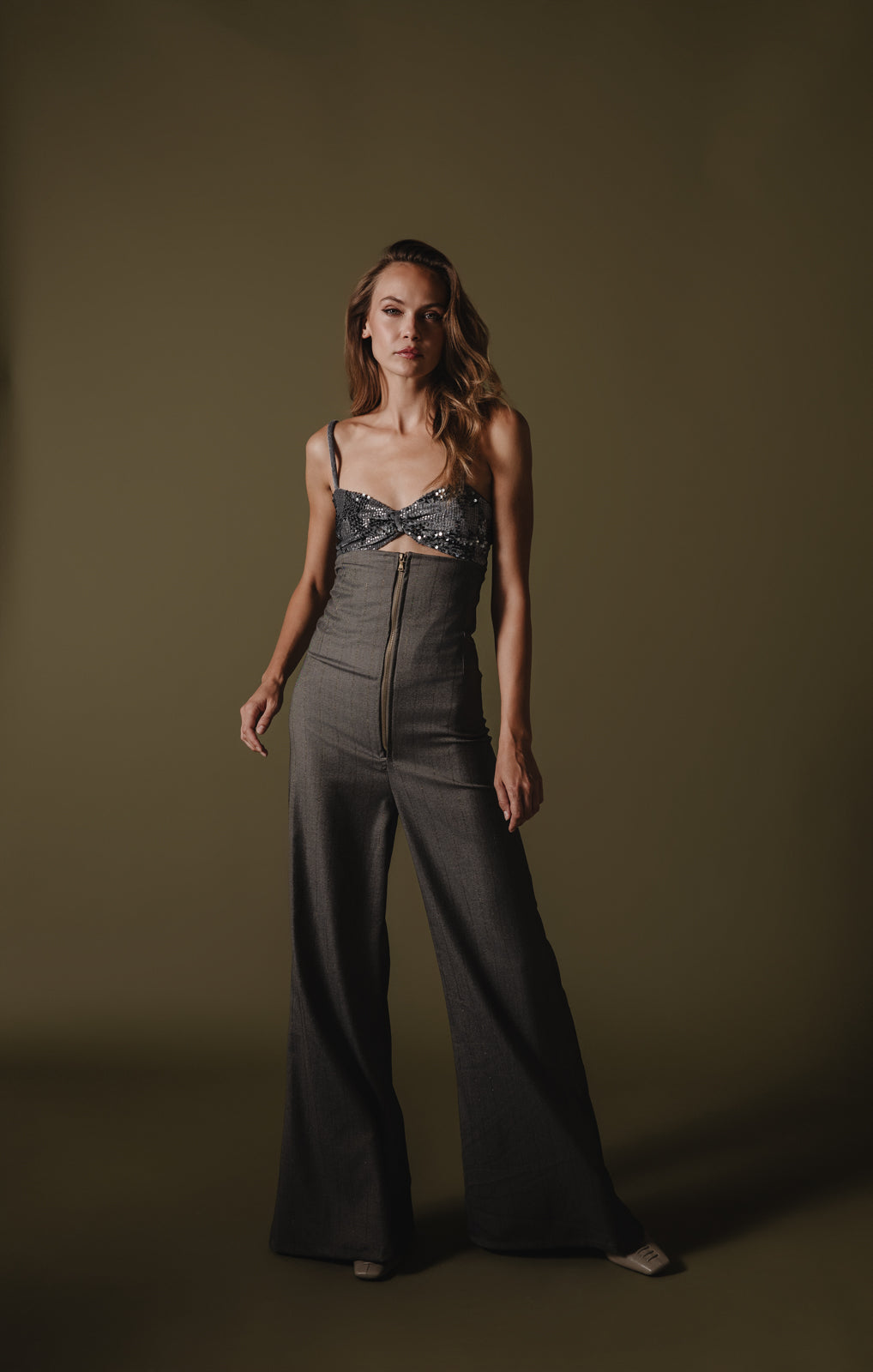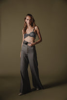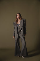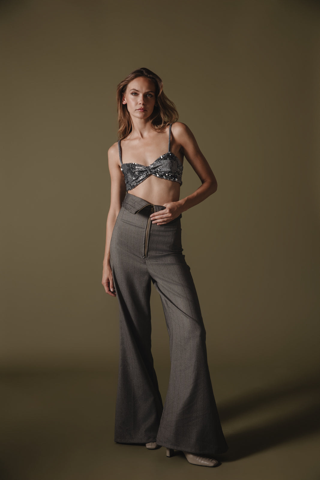 These high-waisted wide-leg pants feature a sleek, tailored fit with a front zipper closure for a modern, structured look. The subtle pinstripe pattern and elongating silhouette make them perfect for both professional and evening wear. Pair with a crop top, shirt or blazer for a chic, polished outfit that exudes sophistication and style.