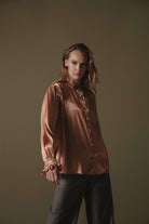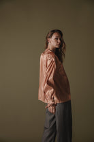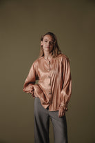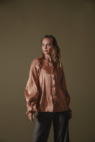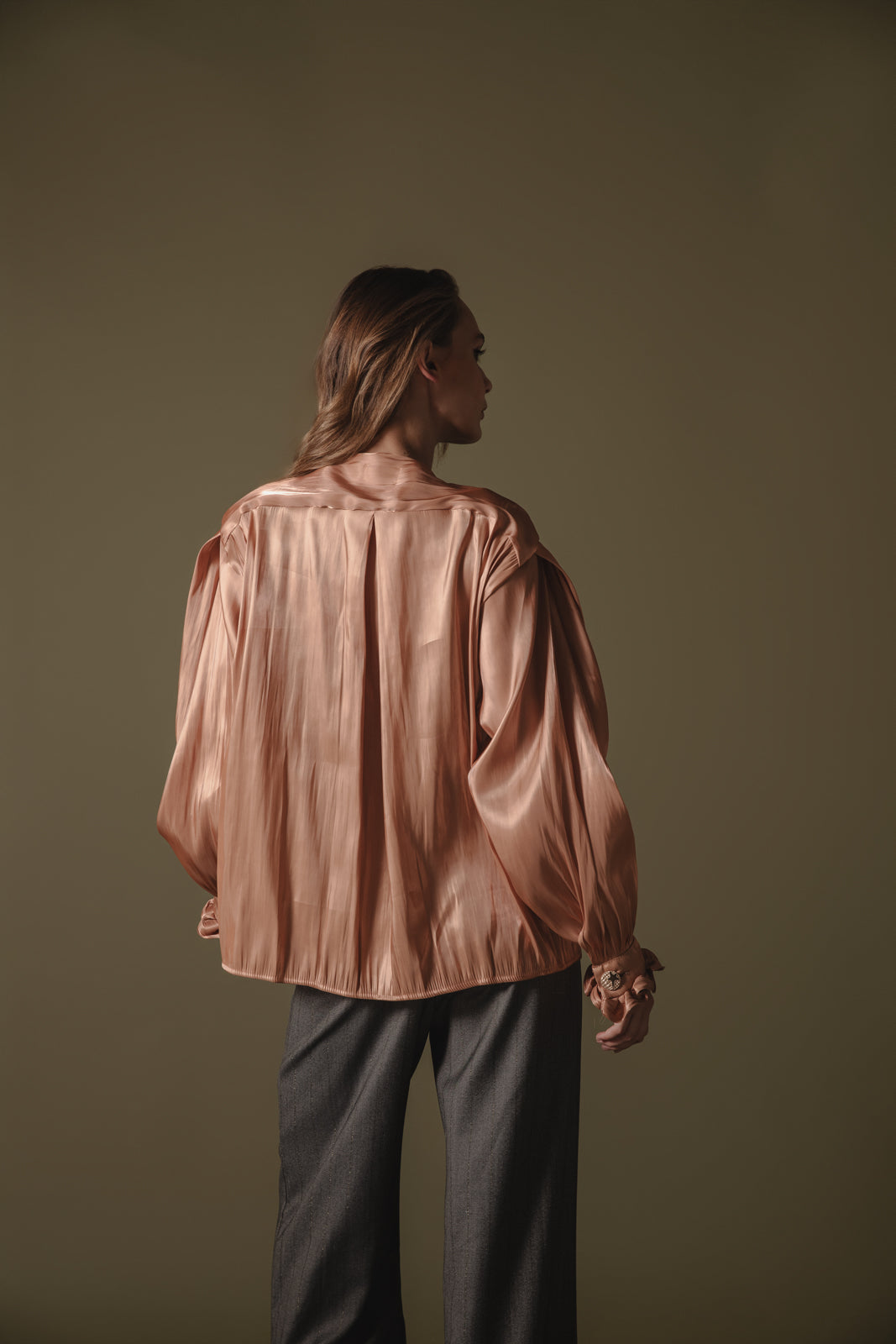 Indulge in elegance with this satin blouse in a soft peach hue. Designed with a relaxed fit, it features a row of unique statement buttons and gathered cuffs for a refined, feminine touch. The lustrous fabric adds a subtle sheen, making it a perfect choice for both professional and evening wear, effortlessly elevating any ensemble.