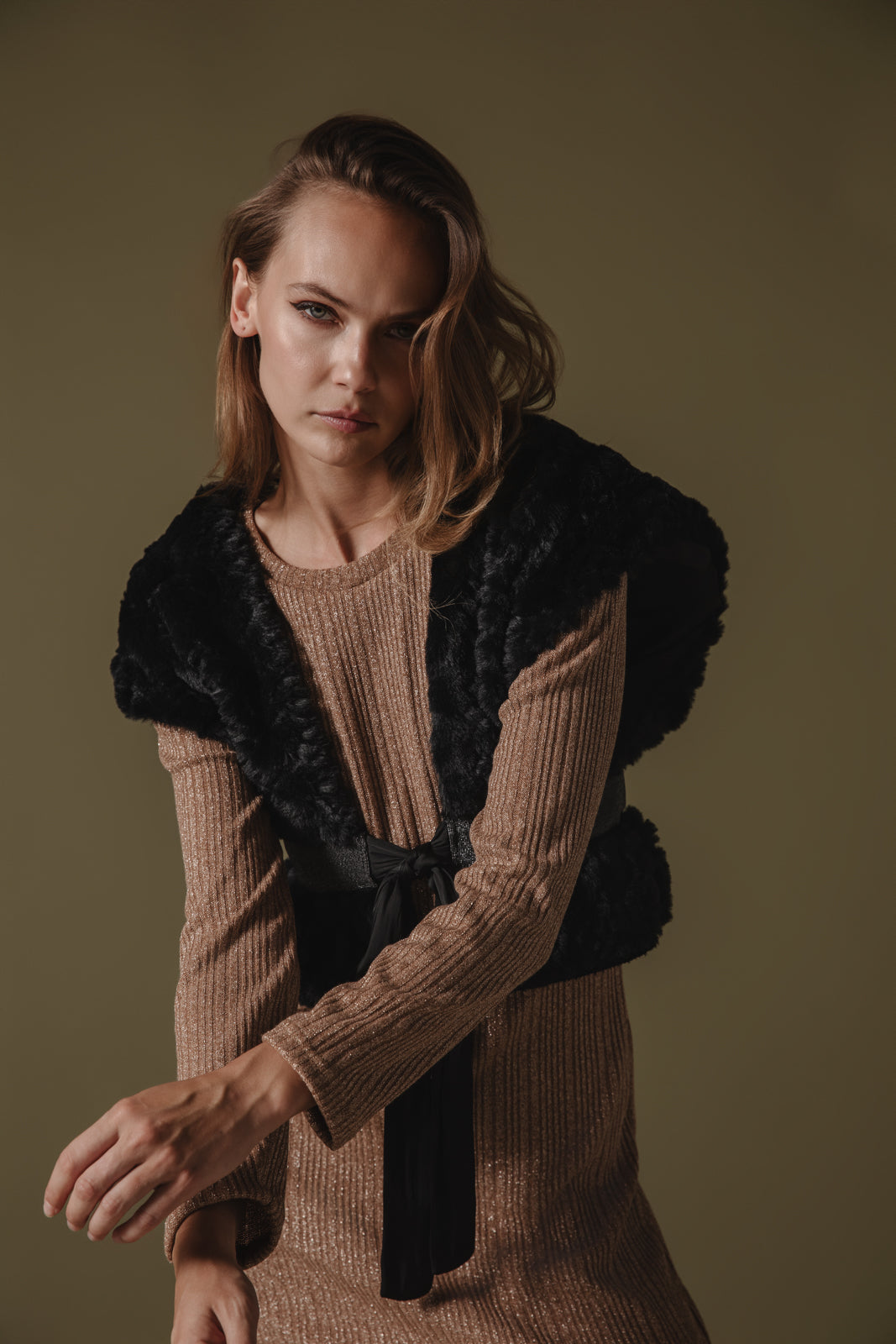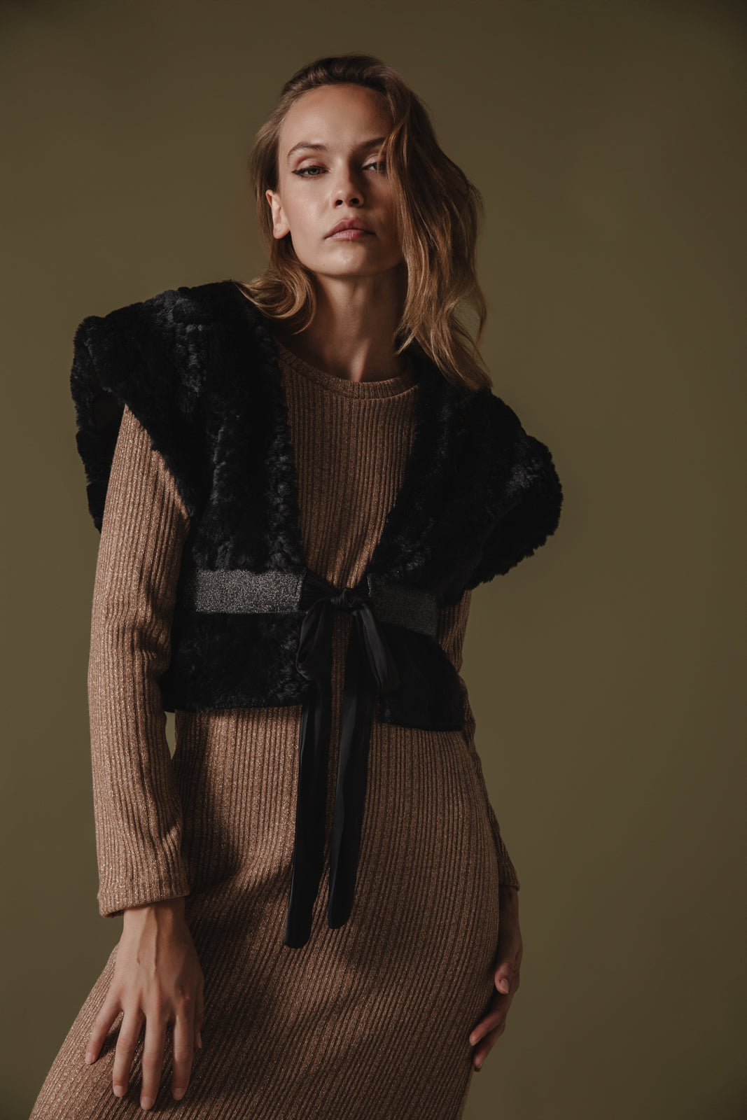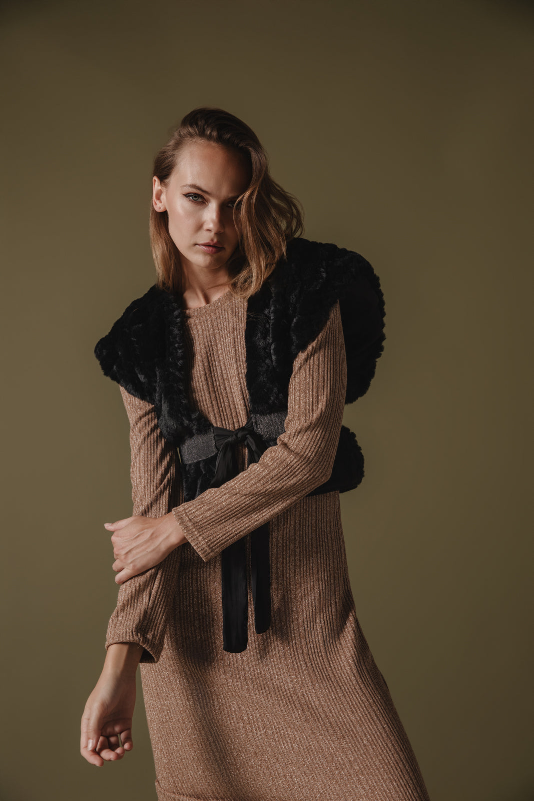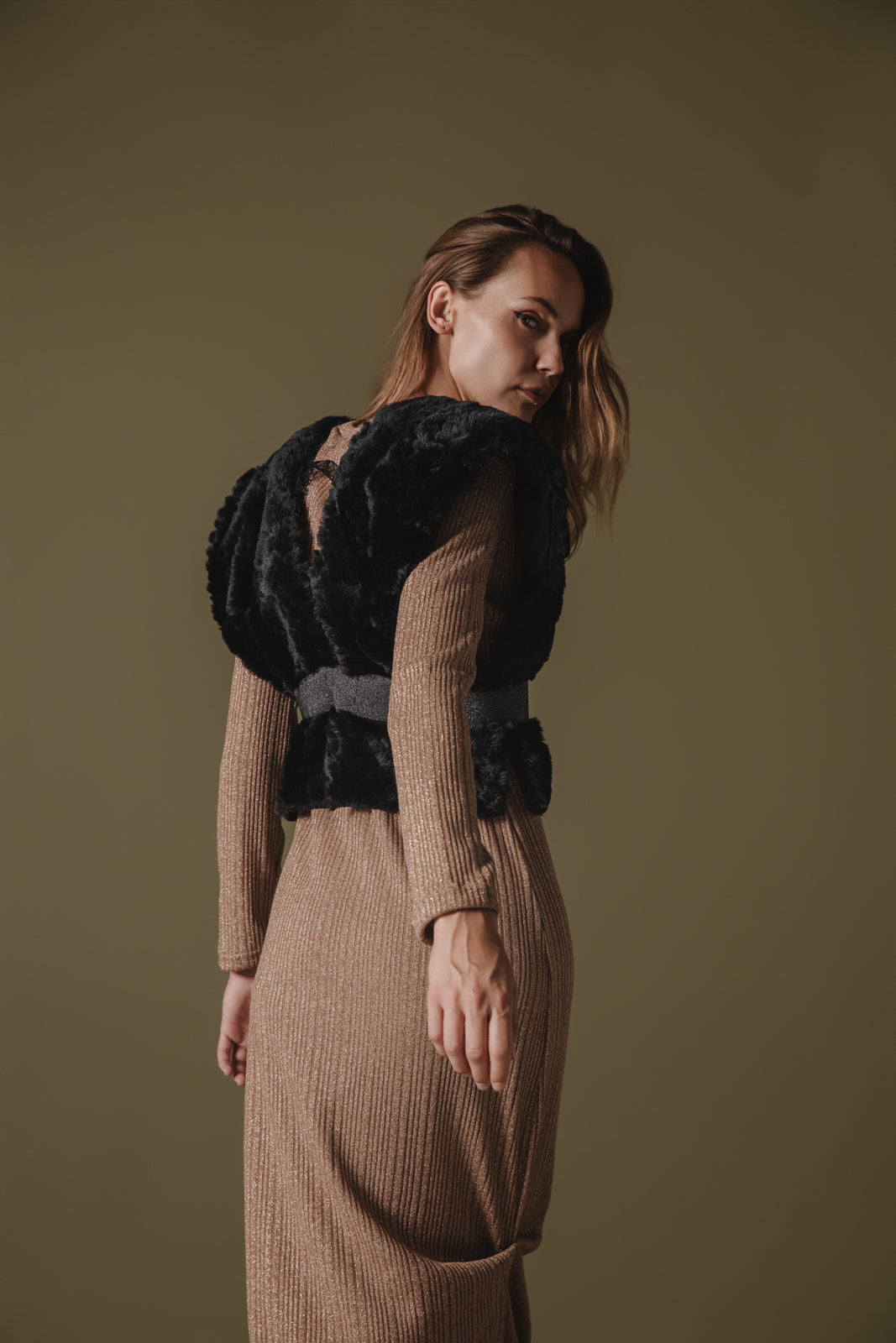 The Nokona Eco-Fur Vest in black features a luxurious, soft faux fur texture in a rich green shade. It has a sleeveless design with a slightly oversized fit, creating a cozy yet stylish silhouette. The vest is open-front, allowing for effortless layering, and has a plush, voluminous look that adds a touch of elegance to any outfit.