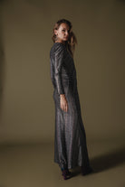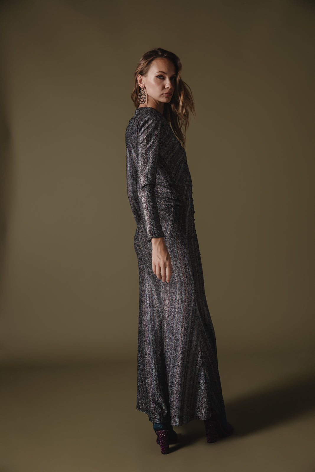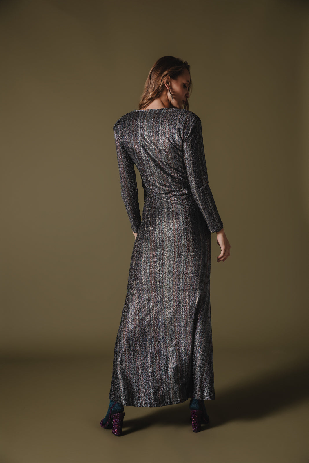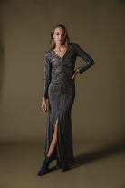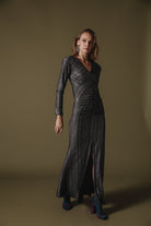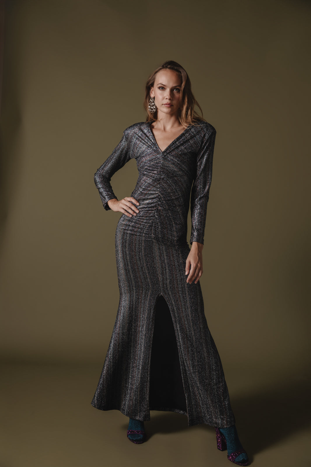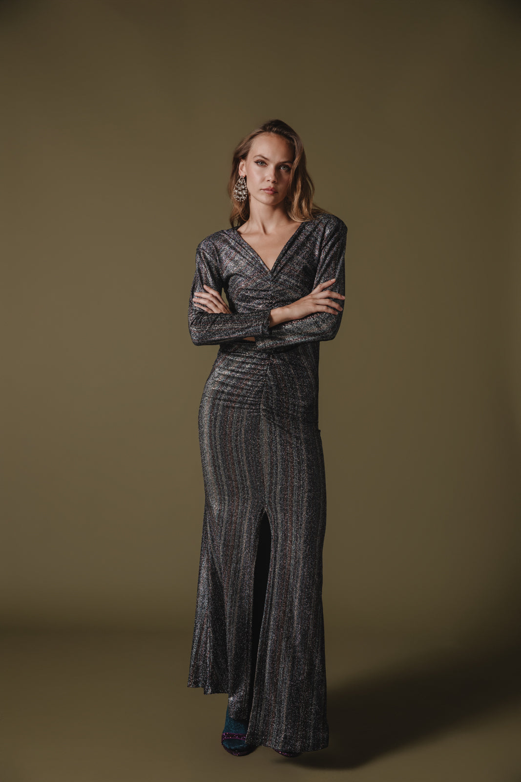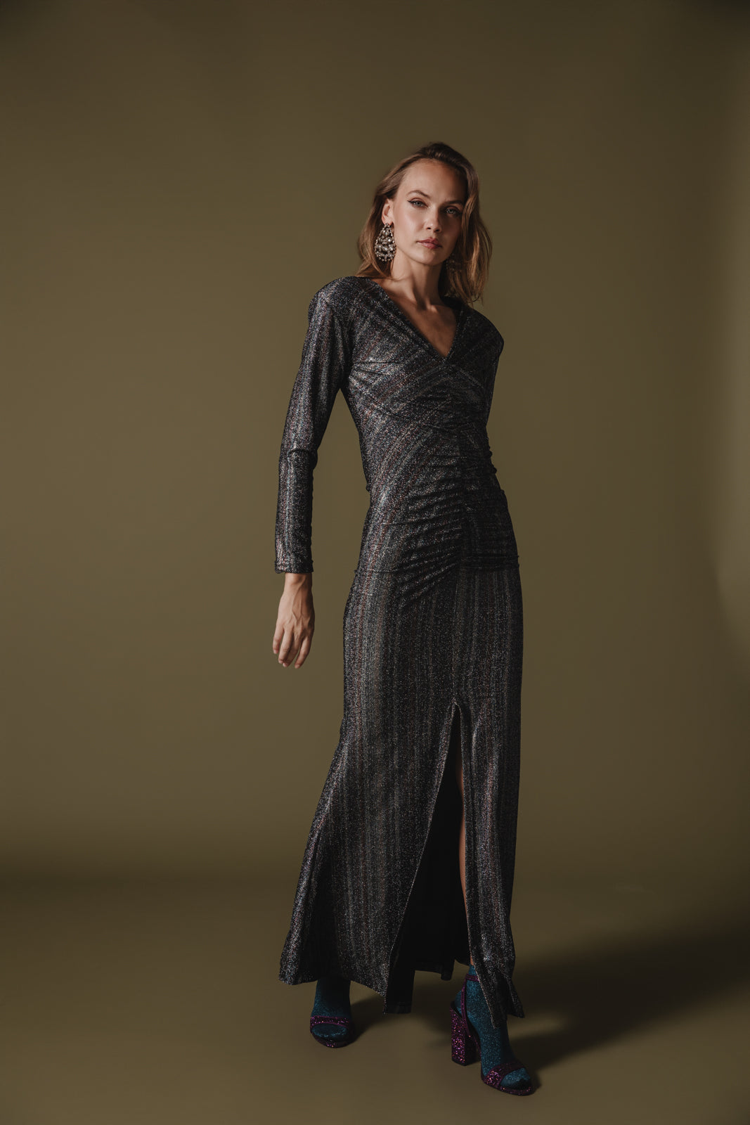 This is a stunning full-length metallic dress with long sleeves and a deep V-neckline. It features a flattering ruched design at the front and a thigh-high slit that adds an elegant touch. The shimmery fabric gives off a glamorous, evening-ready look, perfect for special occasions or formal events. Pair it with statement earrings for a complete chic ensemble.