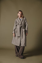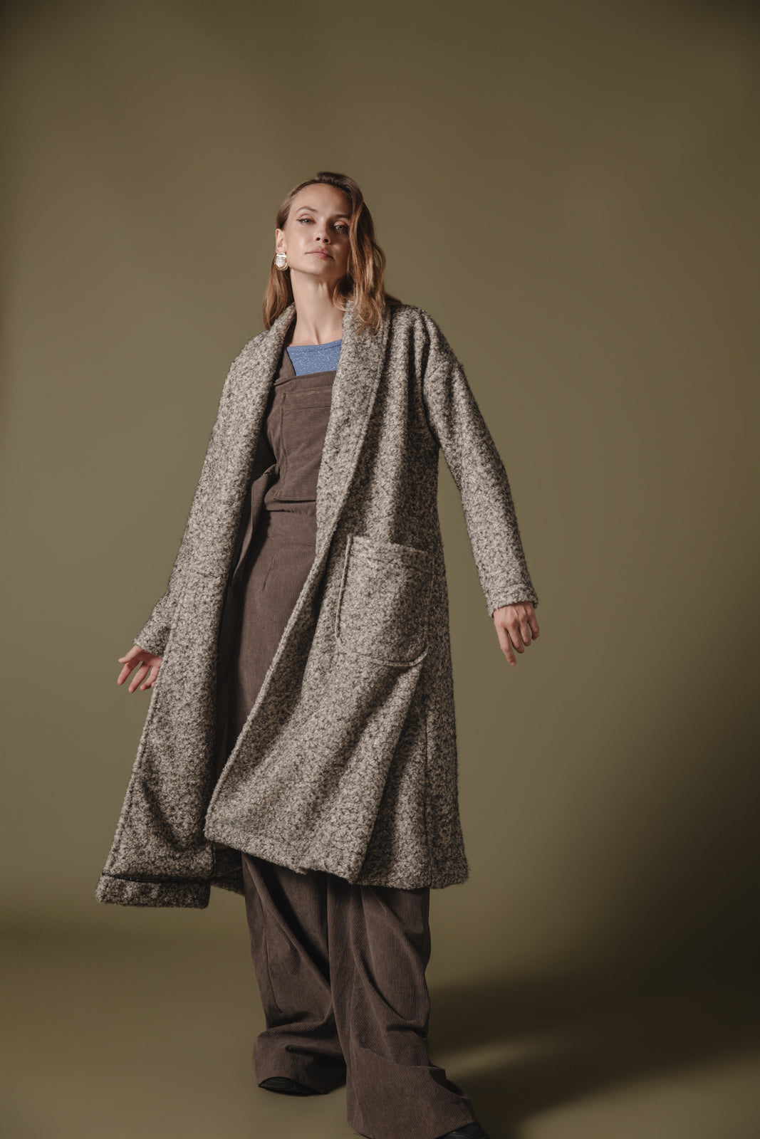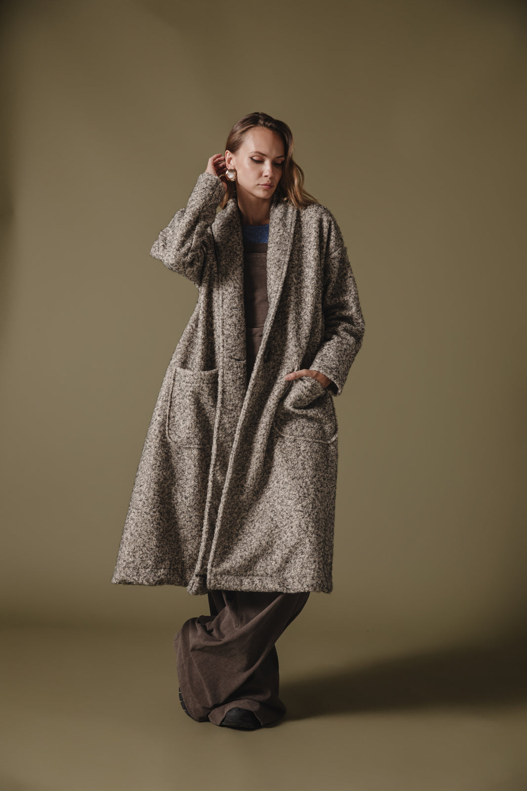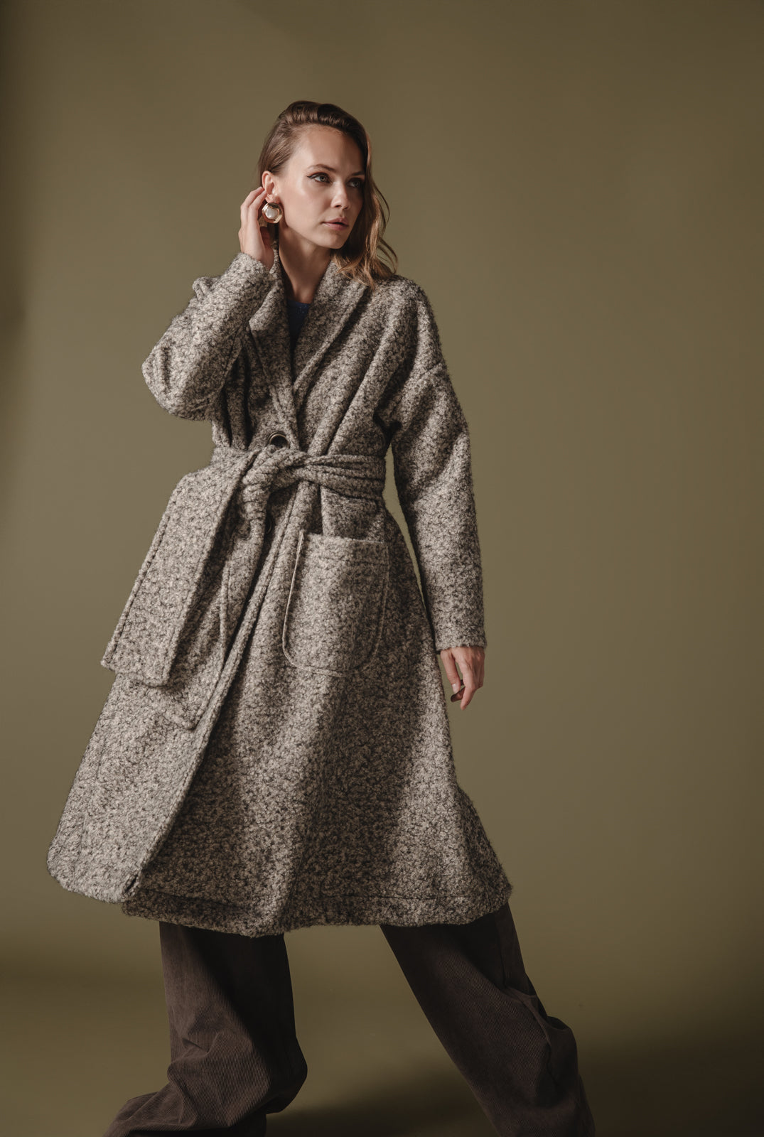 This coat features a long, oversized silhouette with a cozy, textured wool-blend fabric in a neutral grey hue. The design includes wide lapels, large front pockets, and a matching belt that ties at the waist for a flattering, adjustable fit. Ideal for layering, the coat offers both comfort and style, perfect for colder seasons. The minimalist design is versatile, complementing various outfits while keeping you warm and chic.