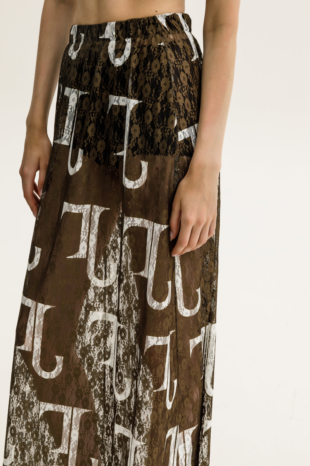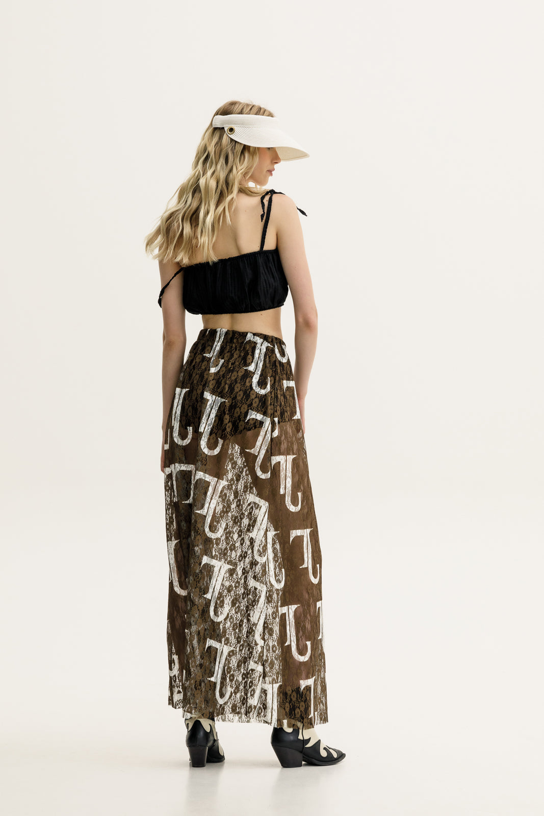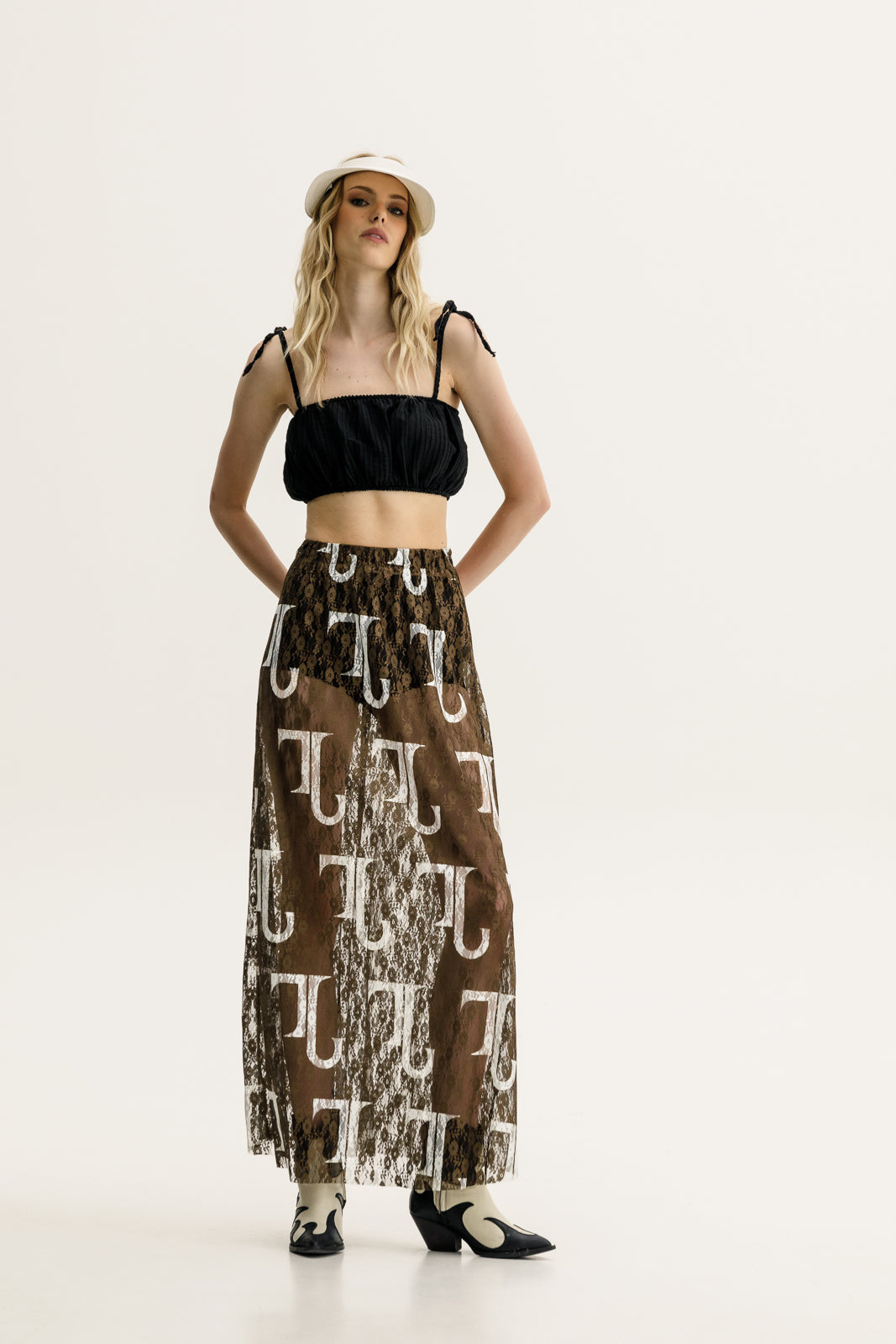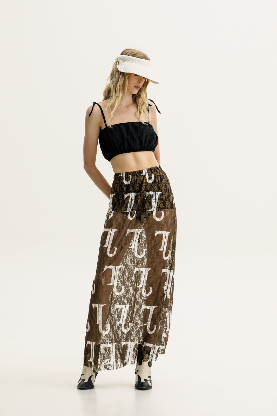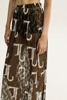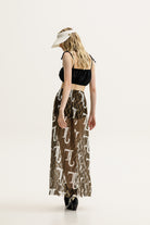 The Wabisa Maxi Skirt in army green combines bold style with delicate lace detailing and a subtle all-over logo pattern. Its maxi length and flowing silhouette create an elegant yet edgy vibe, perfect for elevating your day-to-night looks. This skirt blends streetwear influence with feminine charm.