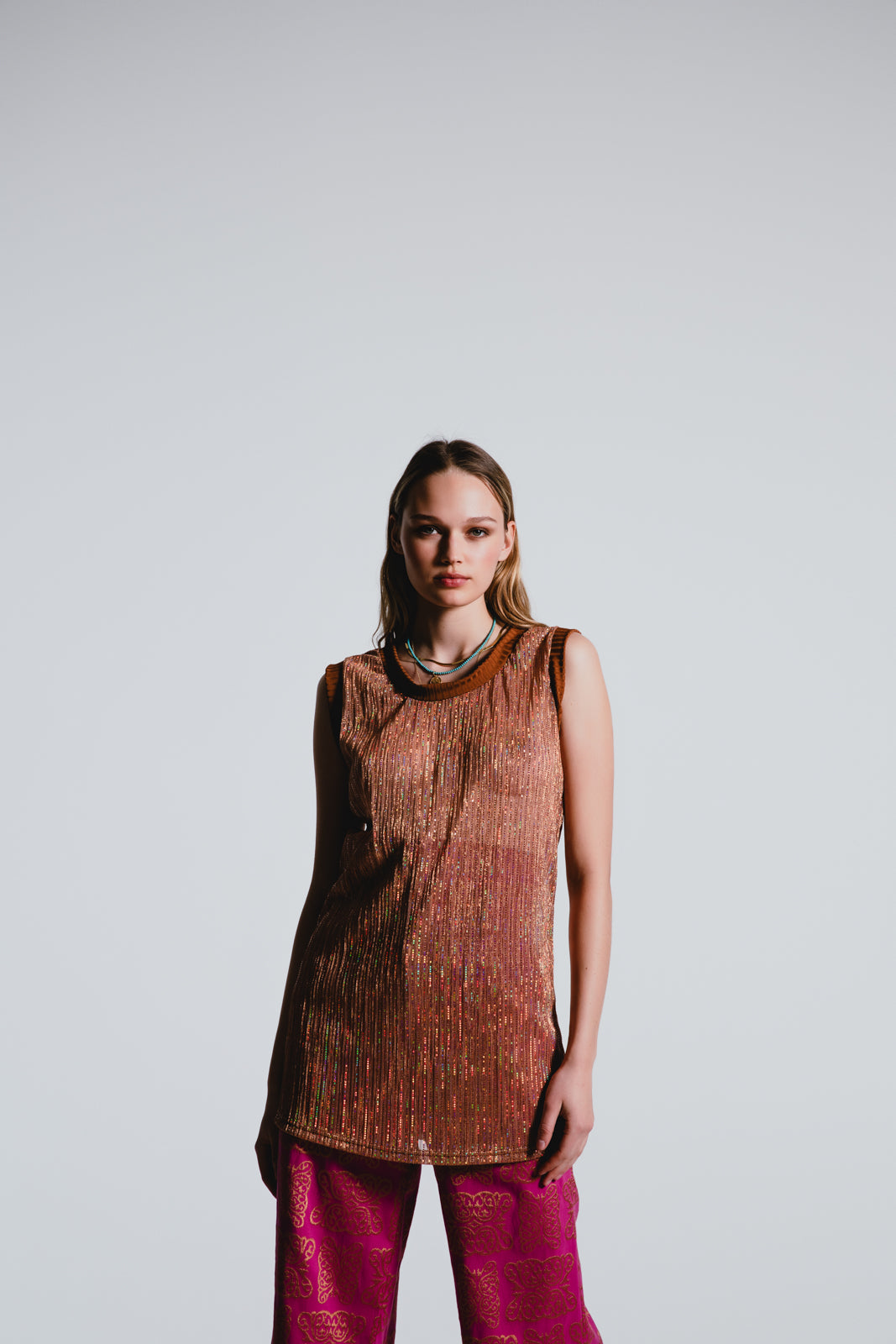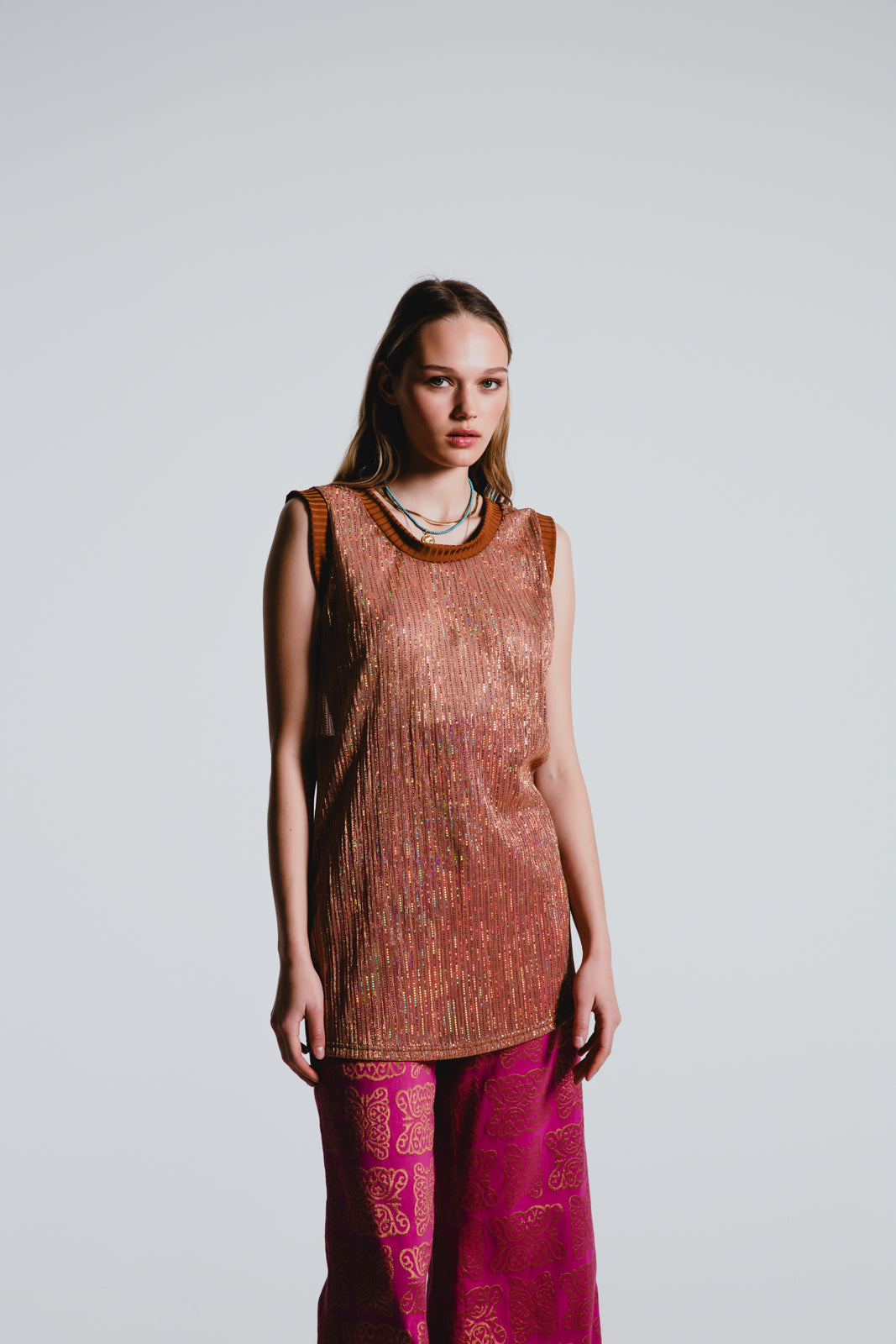 Glisten with every move in our Sequined Tank Top, a dazzling piece that perfectly balances glamour with wearable sophistication. Its shimmering cascade of sequins makes it an exquisite choice for any fashion-forward wardrobe.