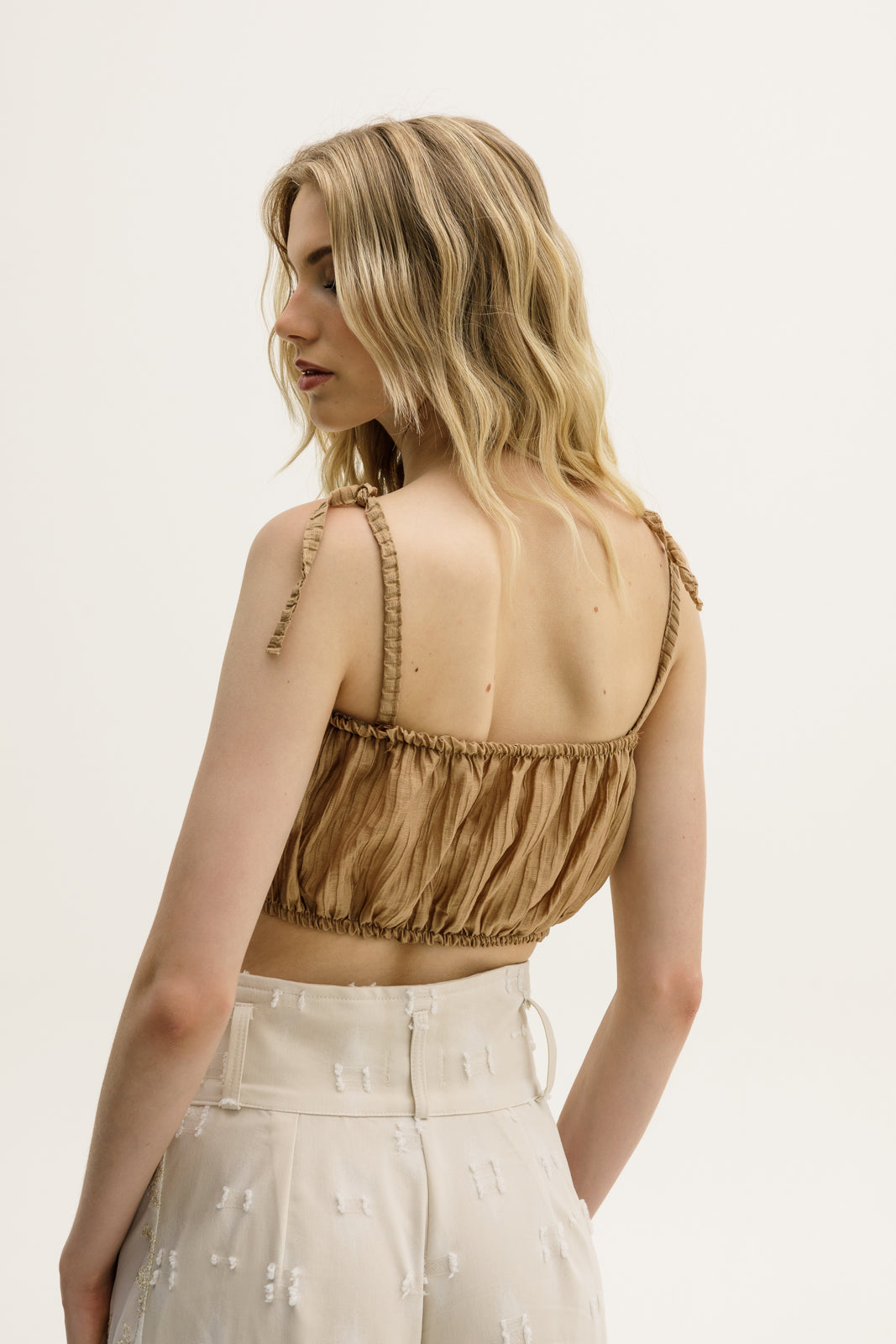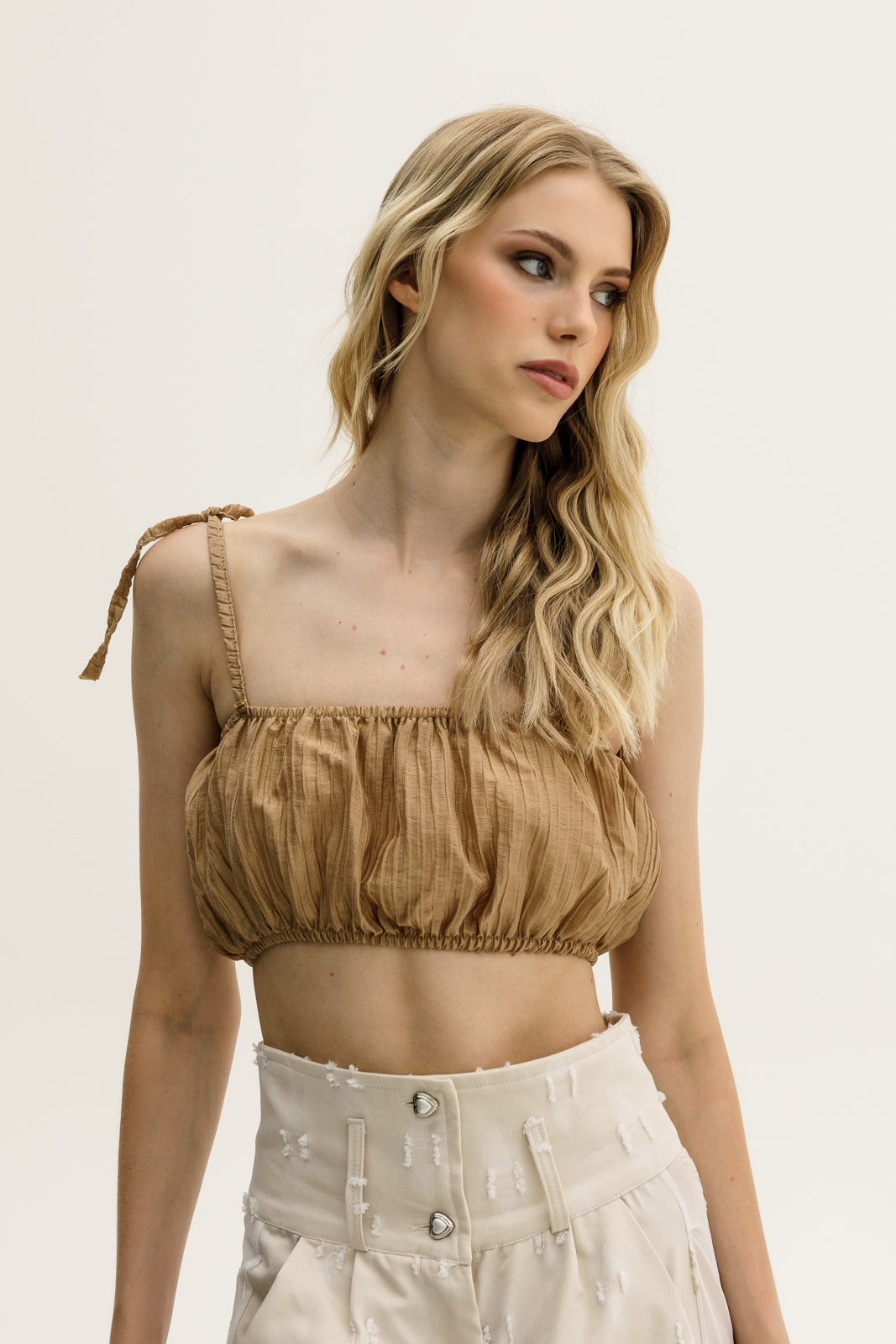 A breezy summer essential with a playful twist, this textured crop top is crafted from lightweight, crinkled fabric in a warm caramel tone. Featuring gathered elastic edges at the bust and hem for a softly voluminous silhouette, it ties at the shoulders for an adjustable, feminine fit. Perfect for pairing with high-waisted shorts, skirts, or trousers, it brings a laid-back yet elevated feel to your seasonal wardrobe.