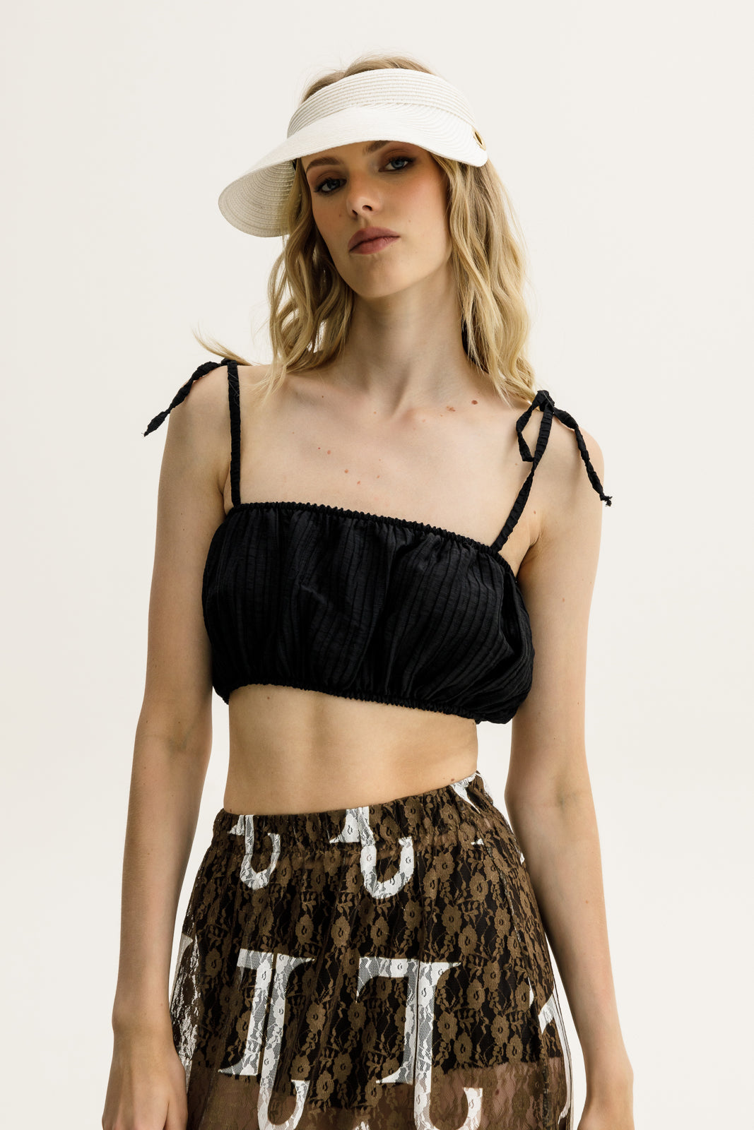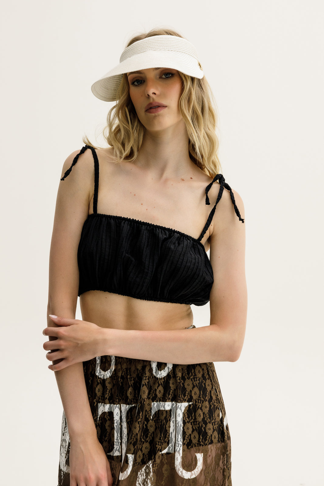 The ultimate staple with a twist. This black crop top in lightweight pleated fabric offers effortless styling with a touch of elegance. Featuring adjustable tie straps and soft gathering at the bust and hem, it’s made to fit beautifully and pair with everything — from denim and tailoring to bold prints and sheer textures.