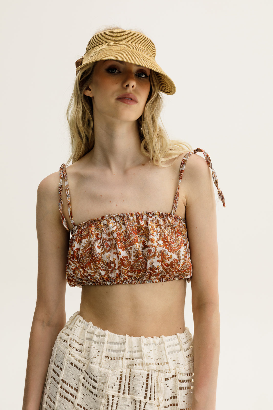 Sun-kissed and bohemian. This paisley crop top in warm terracotta and ivory tones brings a nostalgic charm to your summer look. The airy fabric, gathered details, and tie straps create a carefree silhouette — perfect for seaside escapes or sunset strolls.