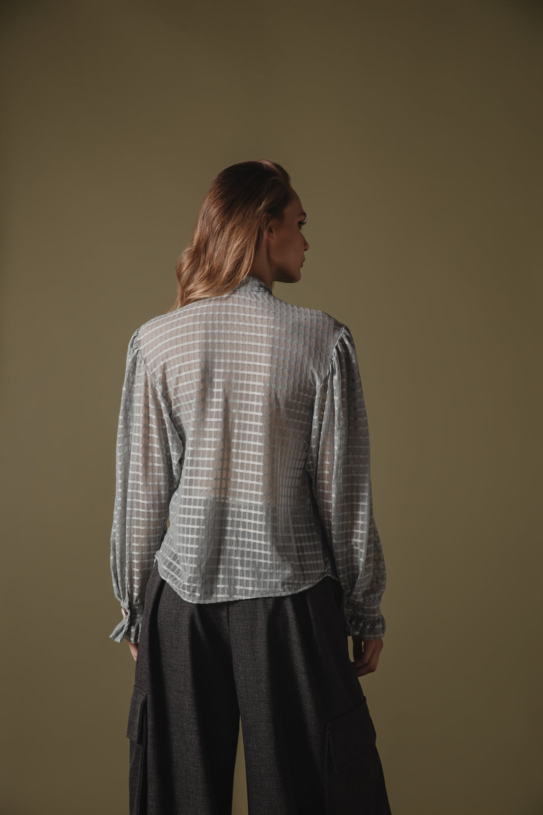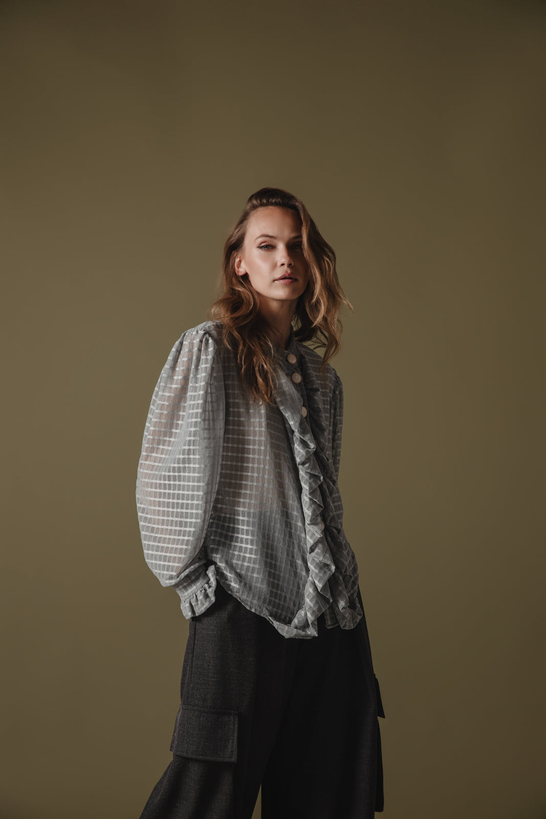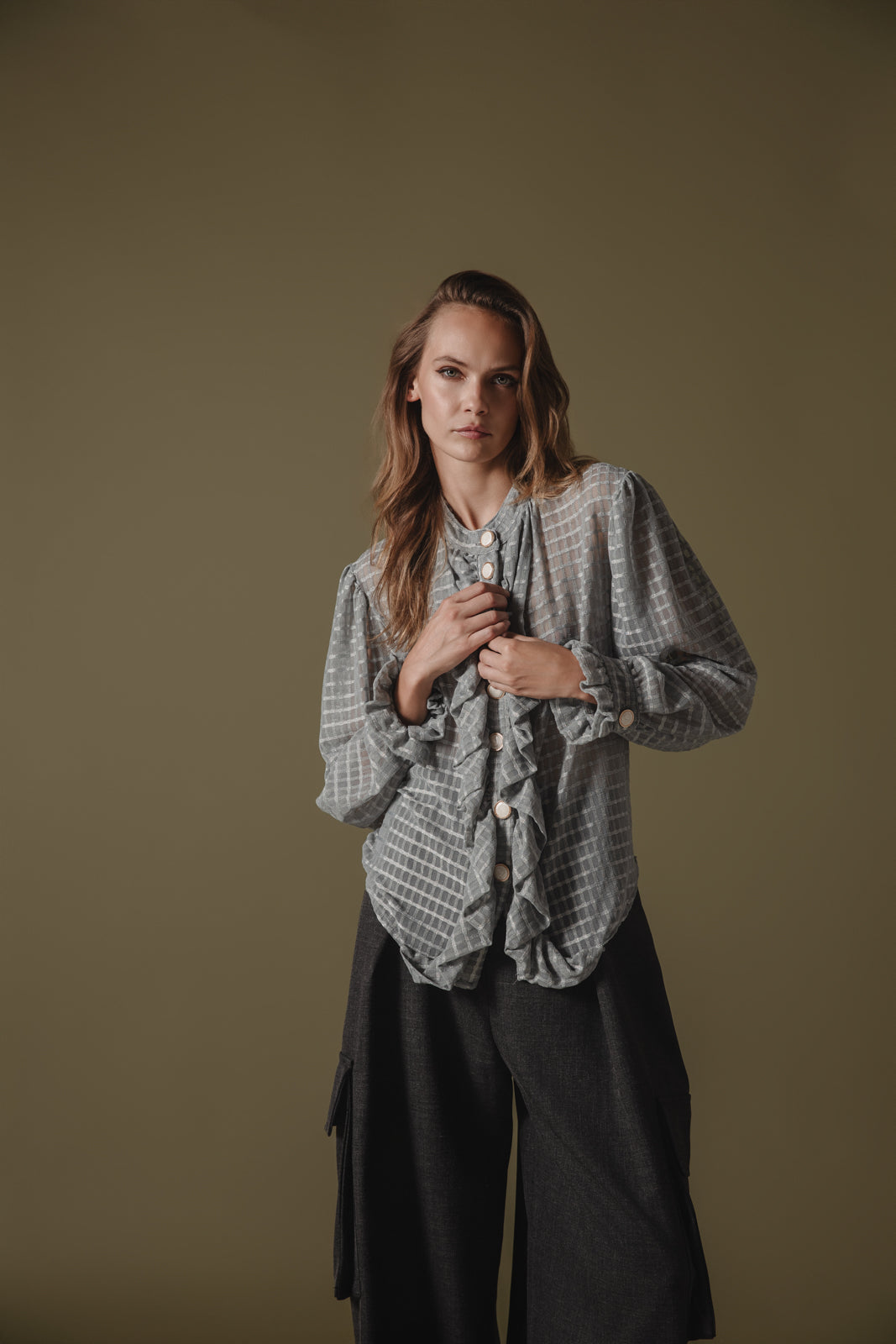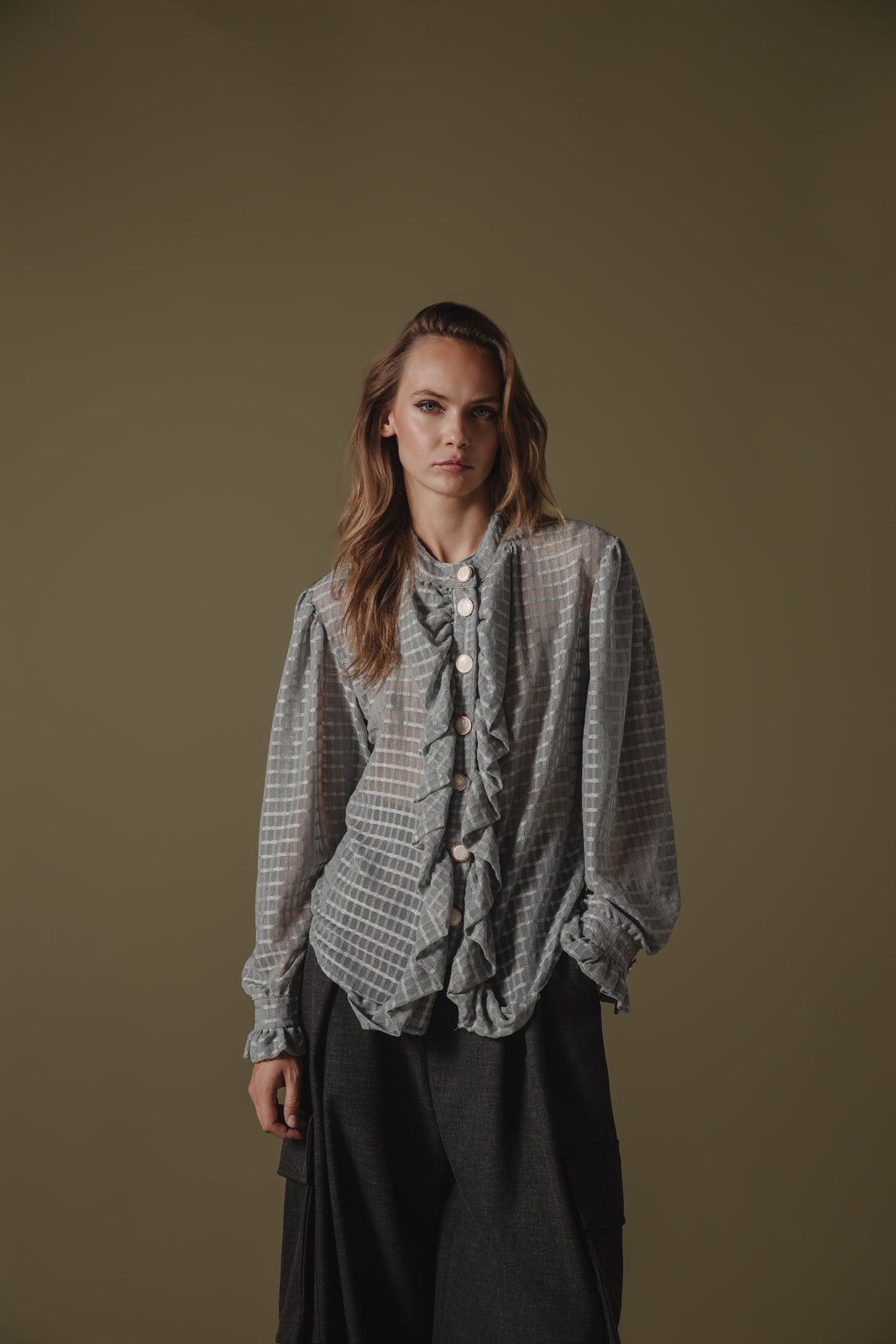 This ruffled shirt features a light, semi-sheer fabric with a subtle grid pattern. The design is voluminous, with puffed, long sleeves that add a touch of drama to the piece. The front is adorned with a cascading ruffle along the button placket, which is fastened with large, decorative buttons. The fabric and overall silhouette create a soft and feminine look, blending elegance with a modern, relaxed fit.