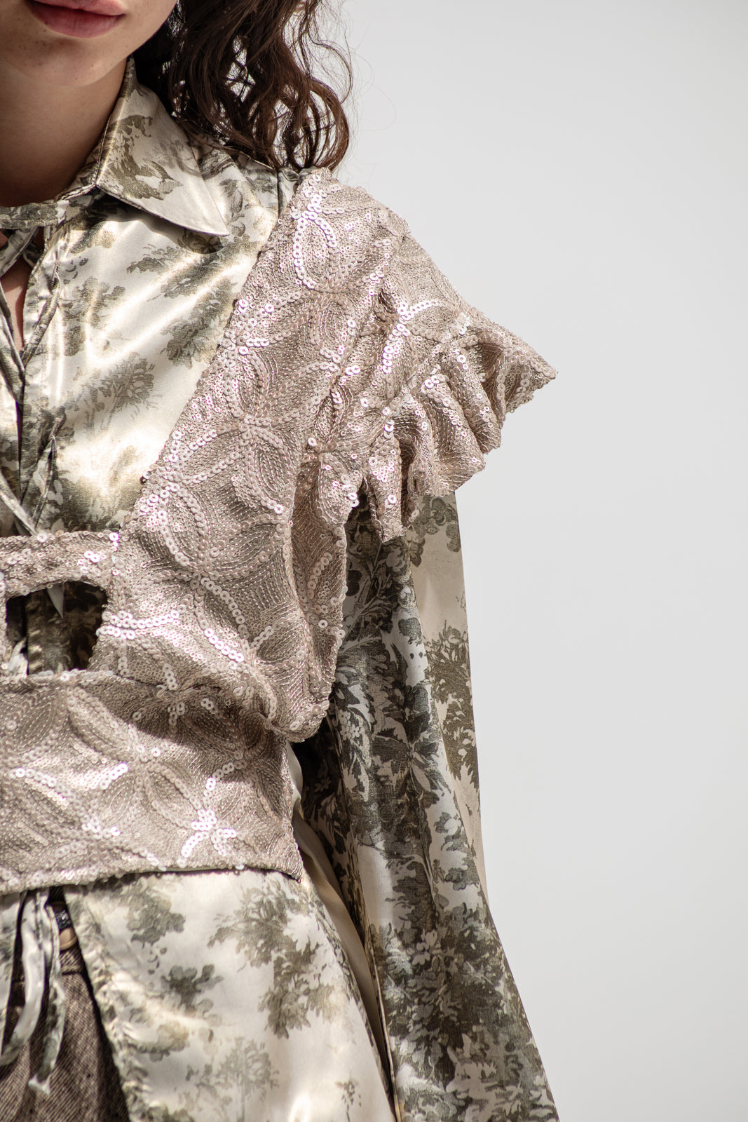 Crafted from embroidered lace with tone-on-tone sequin detailing, featuring ruffled shoulders, open back cross-straps, and satin side ties for an adjustable fit.