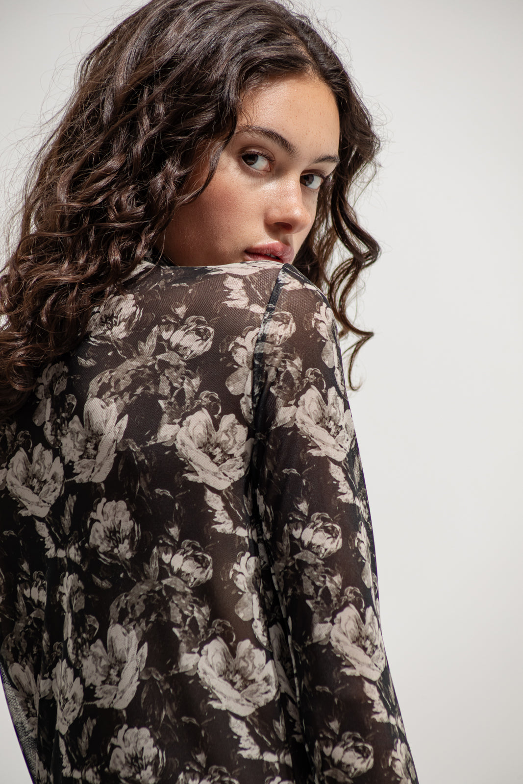 The mesh floral dress hugs the body with soft transparency and vintage-inspired florals in sepia and black.