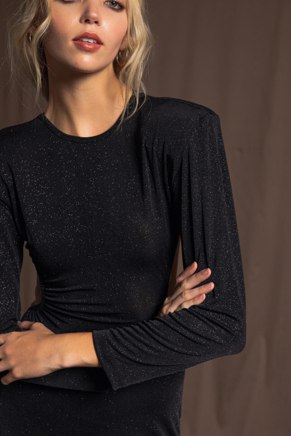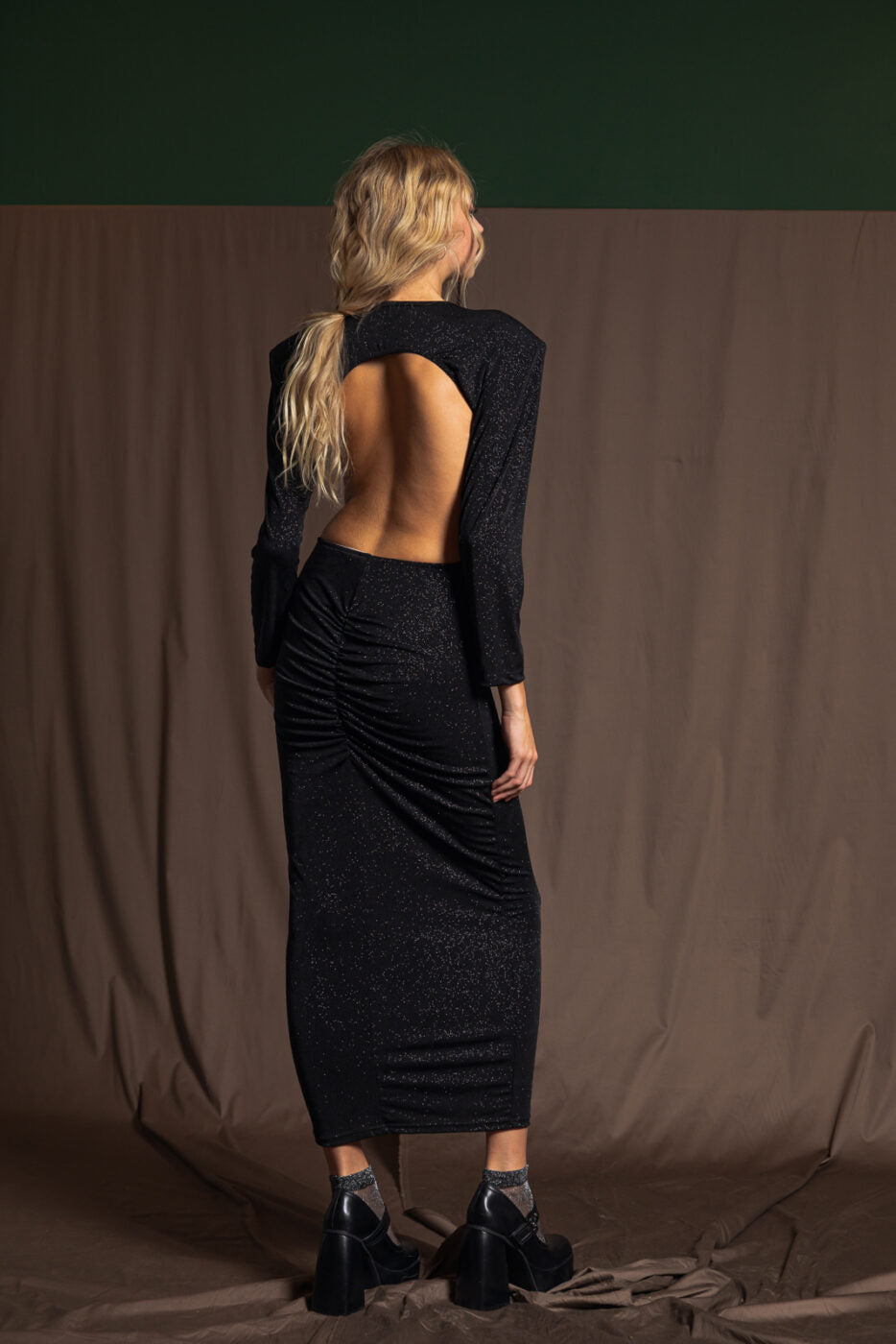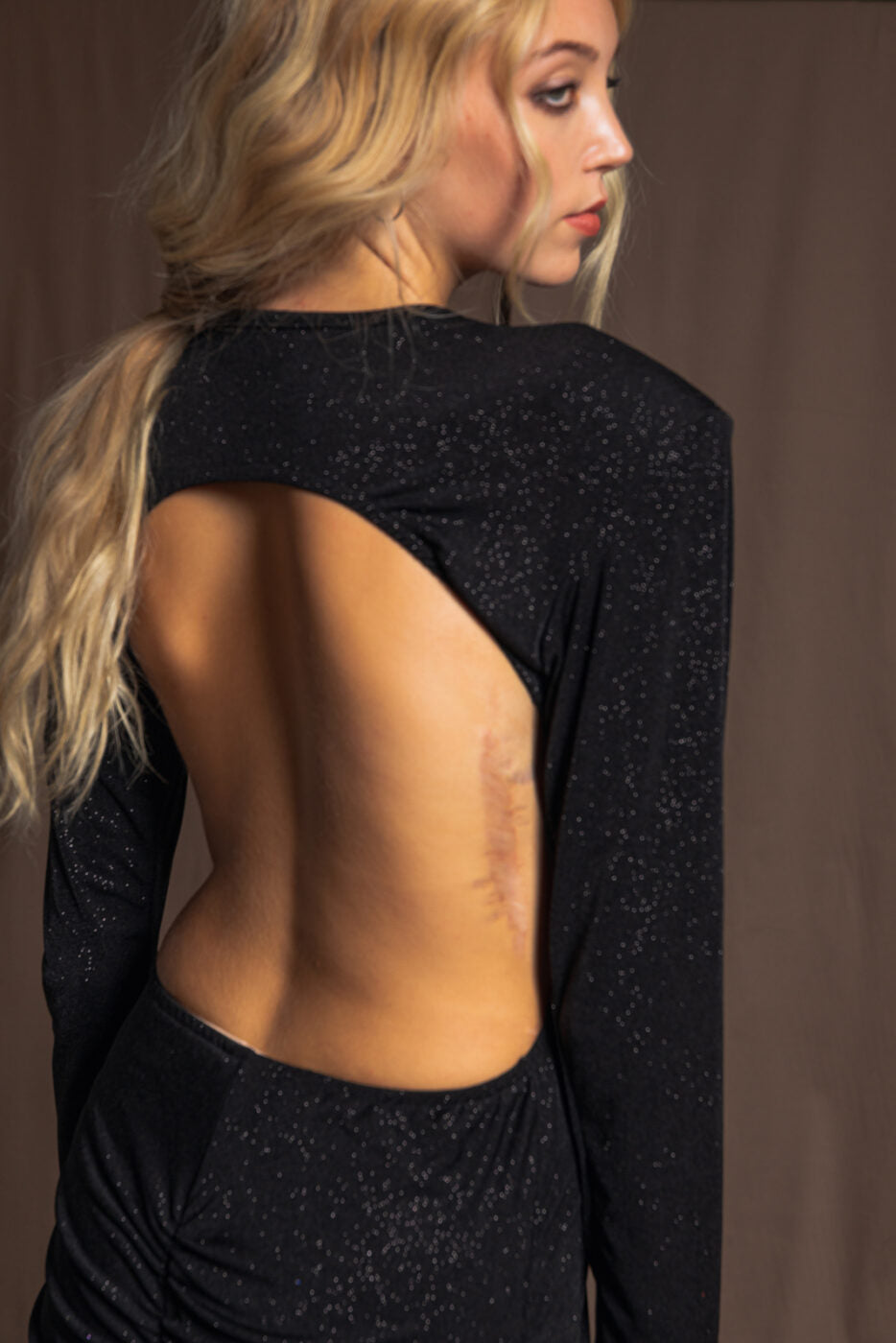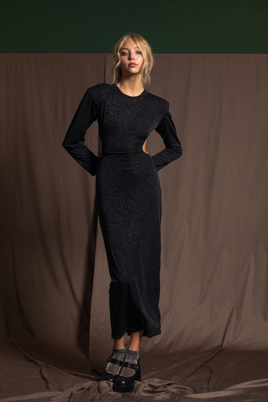 Turn heads in this stunning maxi dress featured in a gorgeous glitter fabrication with long sleeves, cutouts at sides, and super exposed back for an added special touch. Classic, feminine, A-line fit and scoop neckline.