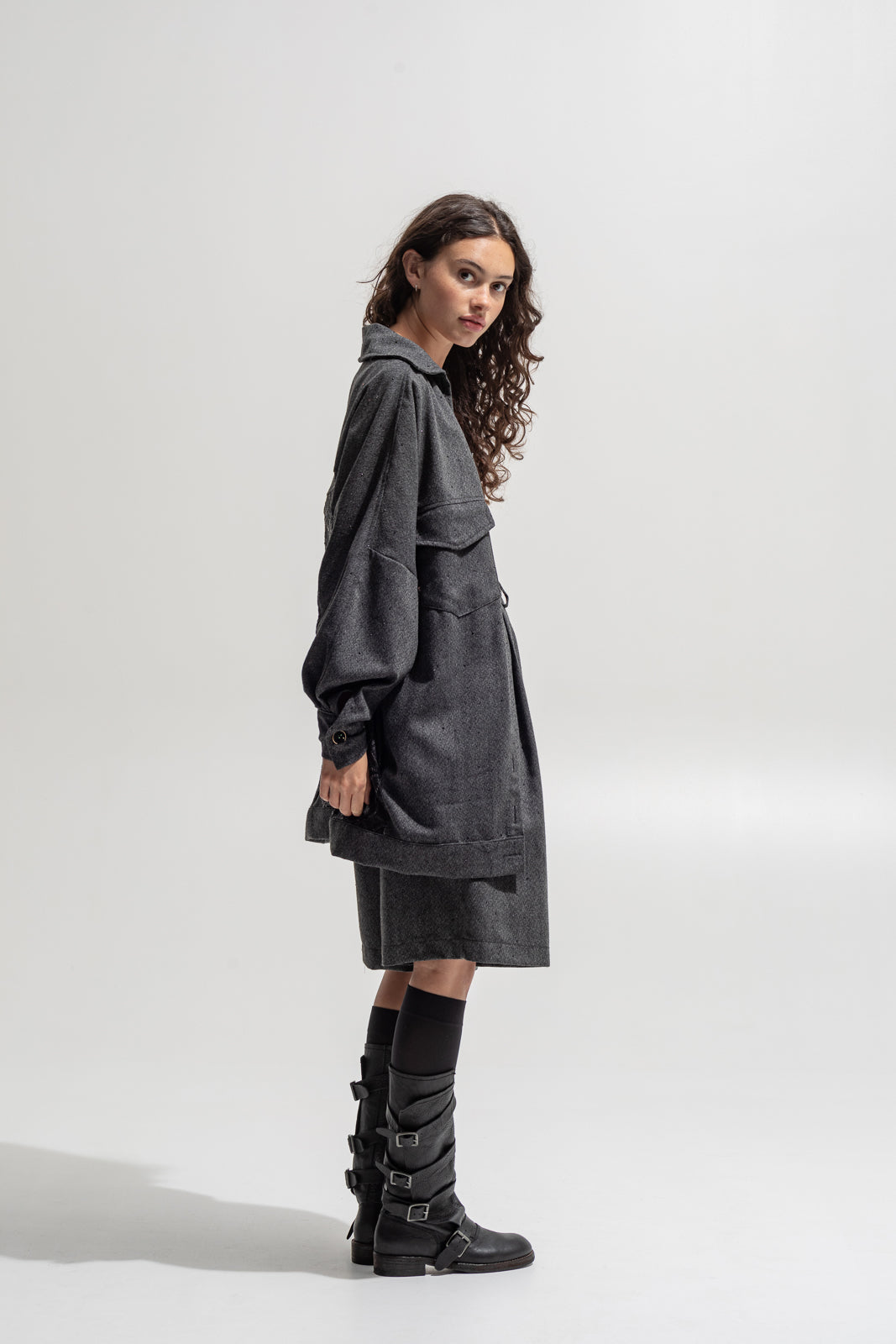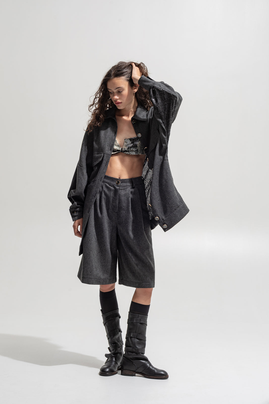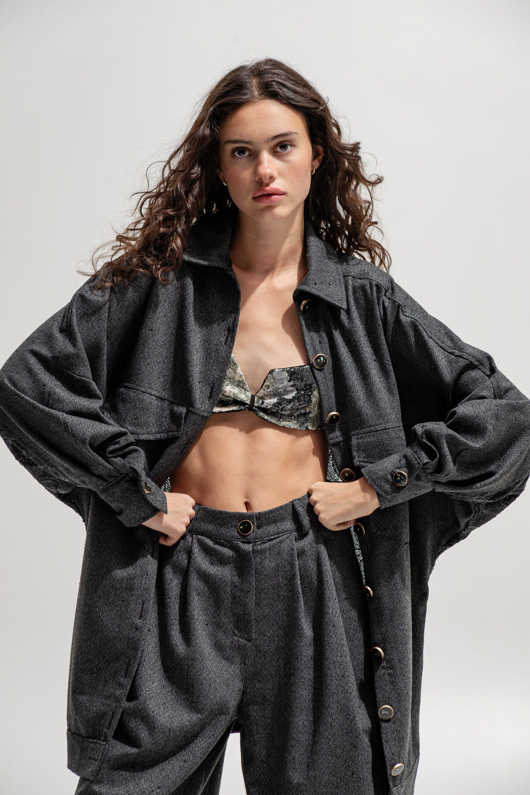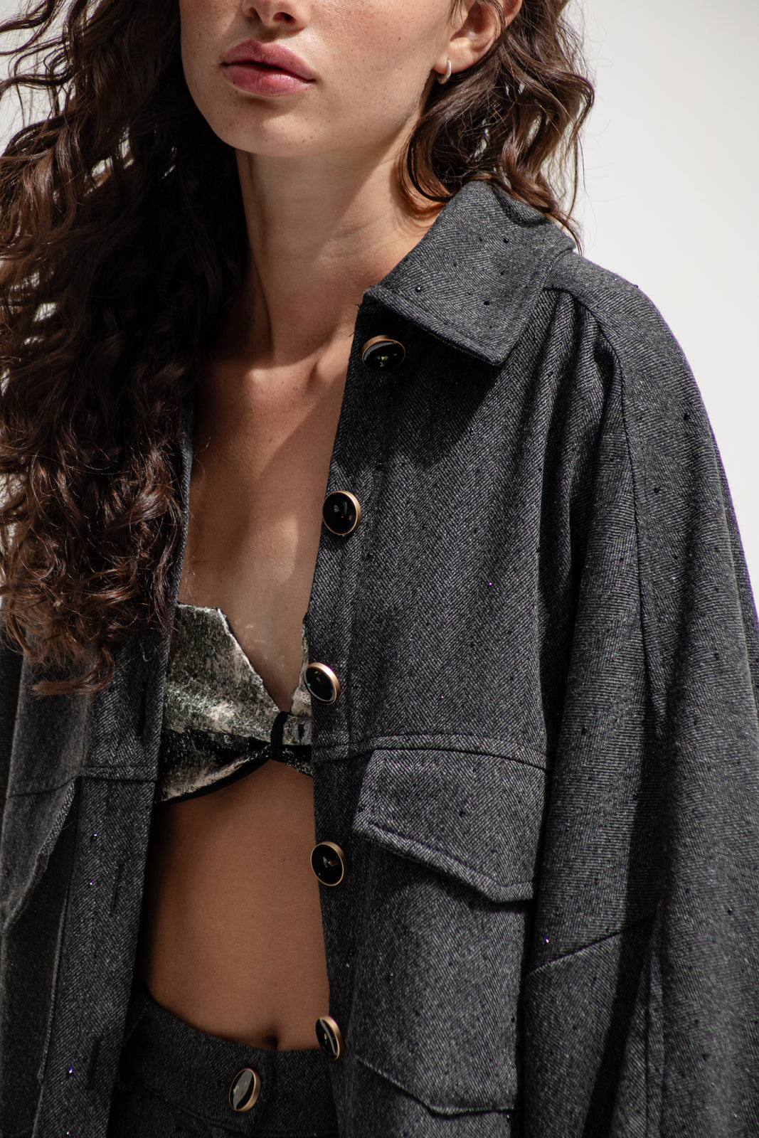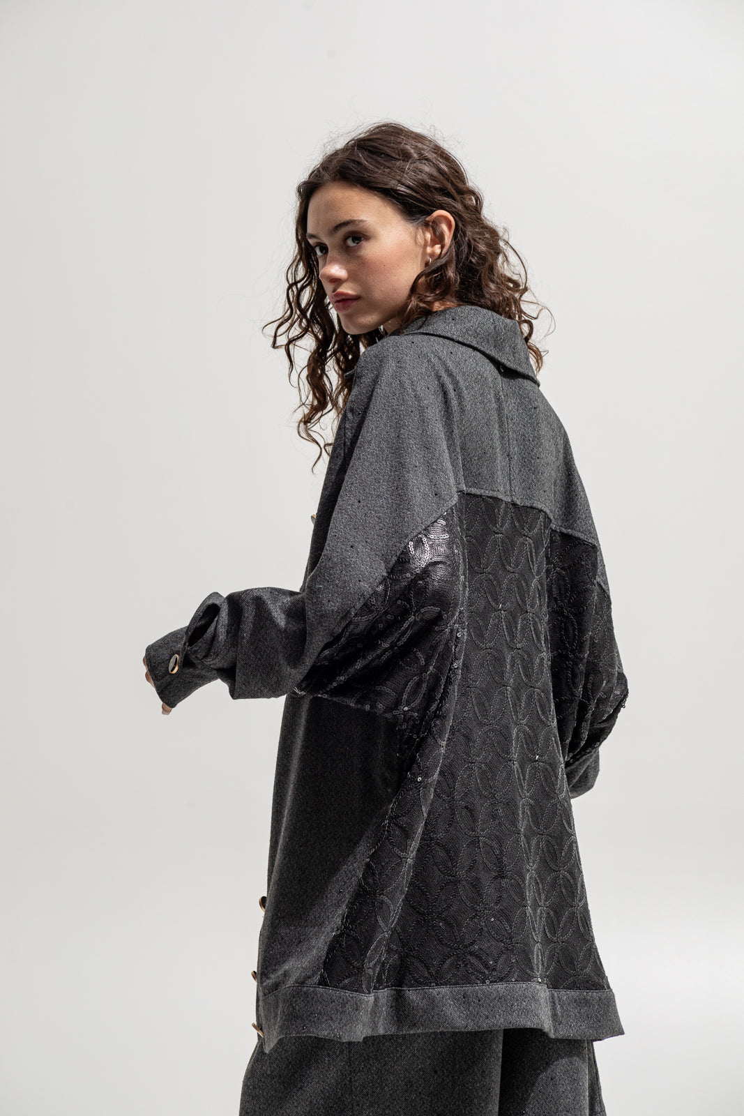 This oversized shirt-jacket merges masculine structure with a feminine twist — crafted from soft wool-blend fabric in a deep charcoal tone and detailed with a jacquard sequined back panel for contrast. Its relaxed silhouette, utility pockets and bold metallic buttons give it a powerful yet effortless edge.