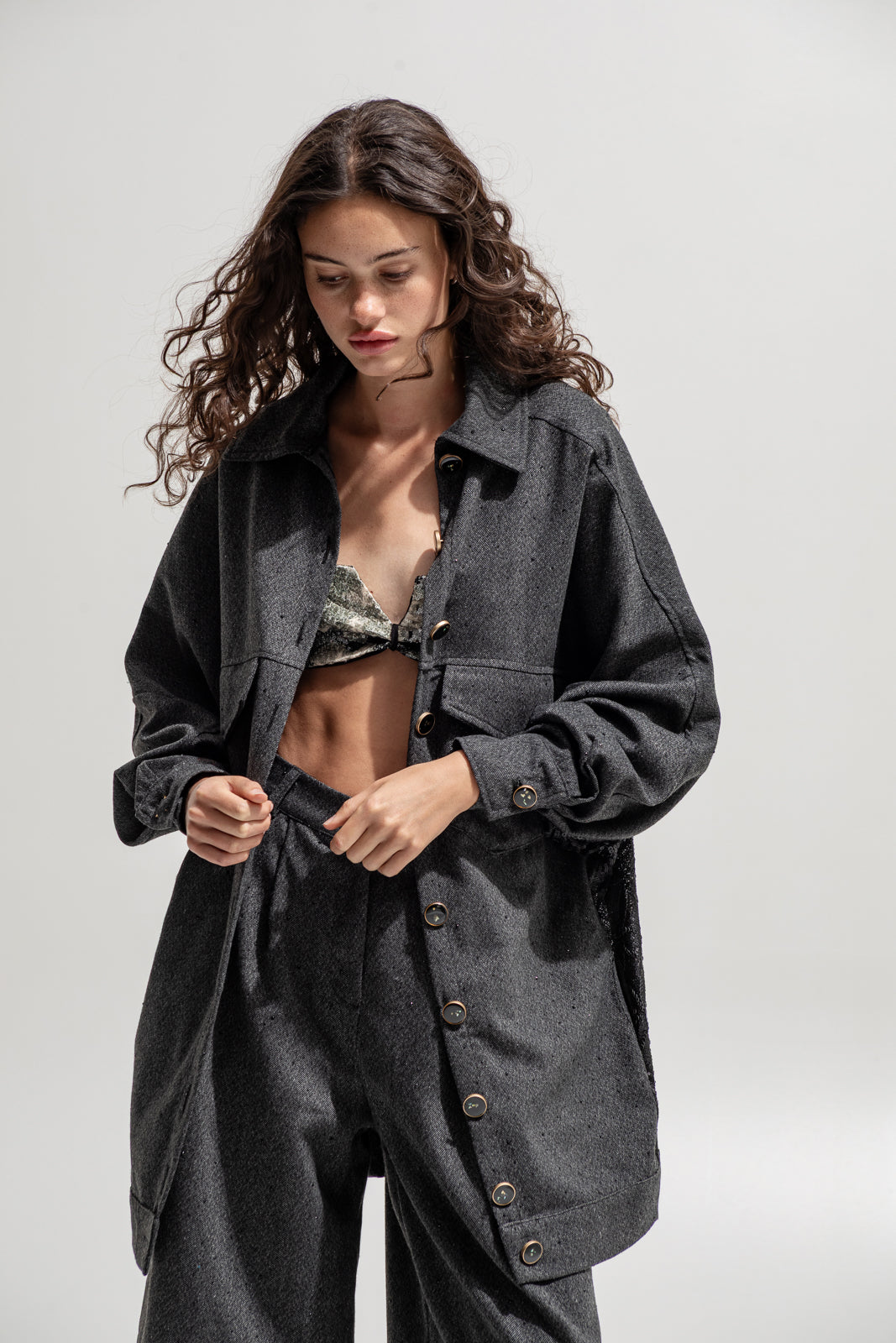 Wear it open over a bralette or buttoned up as a statement layer — either way, it’s built to own the streets.