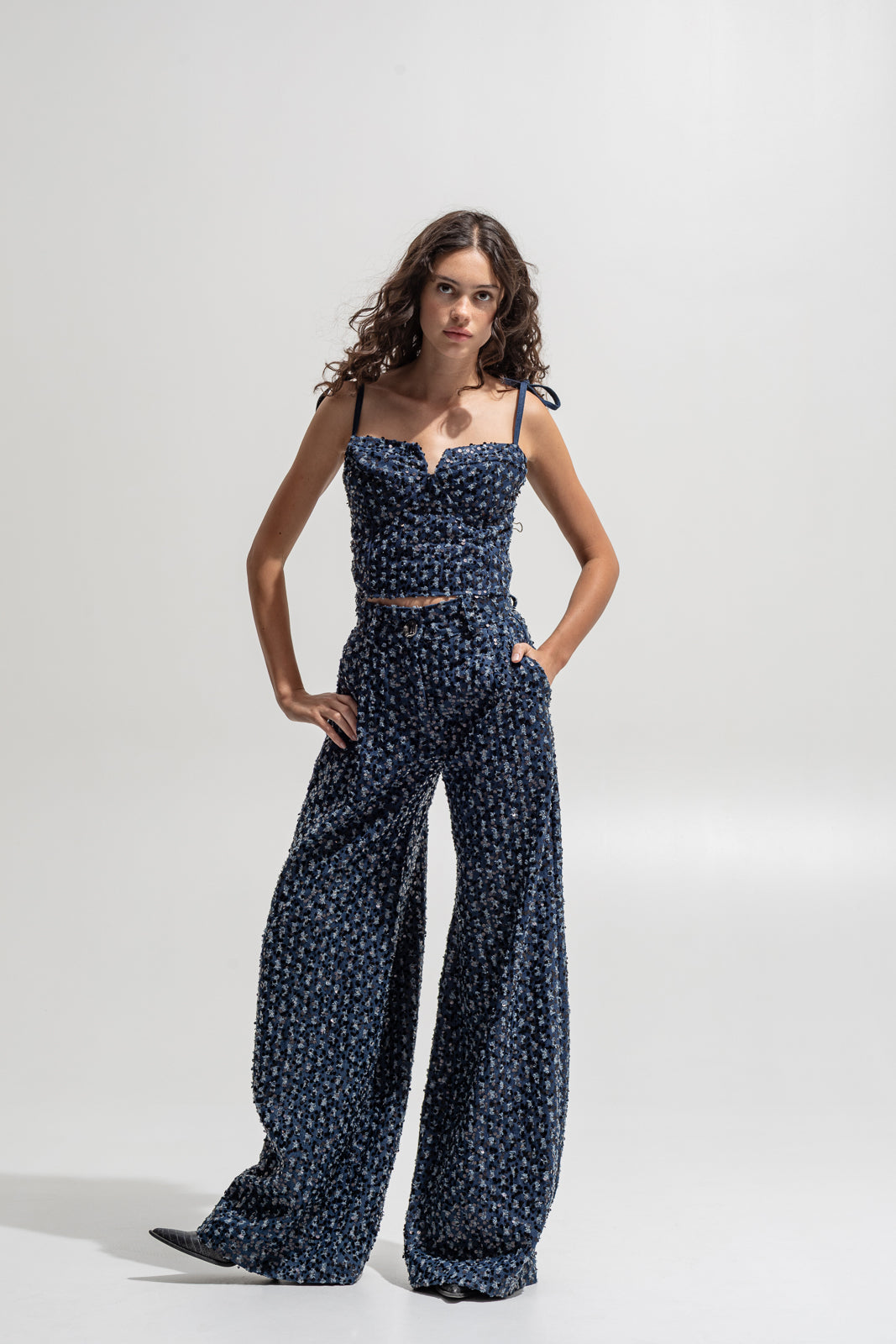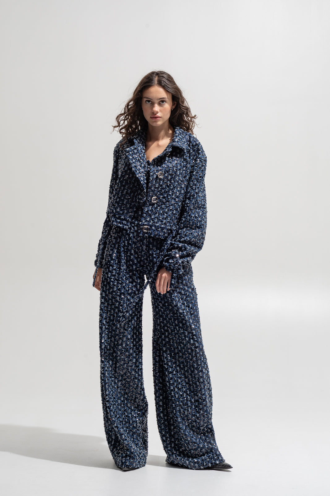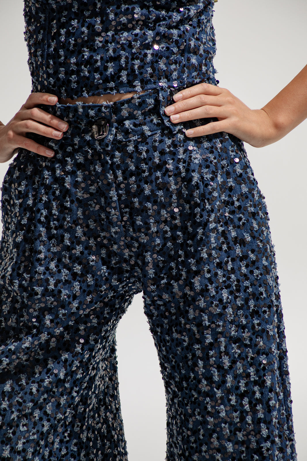 Denim base with all-over sequin embroidery