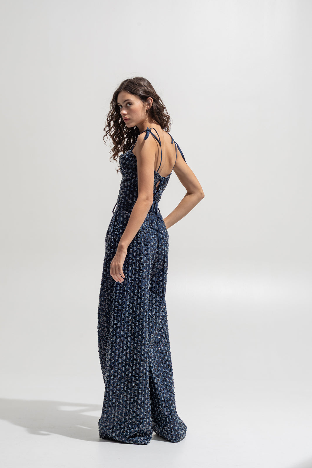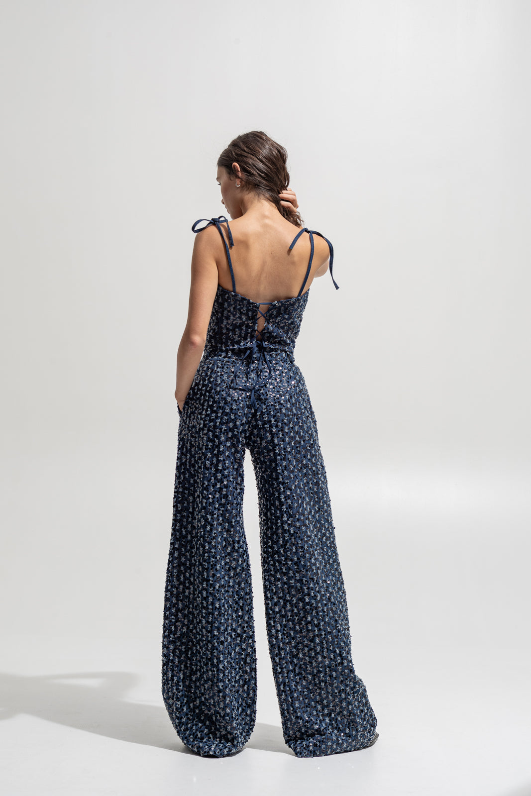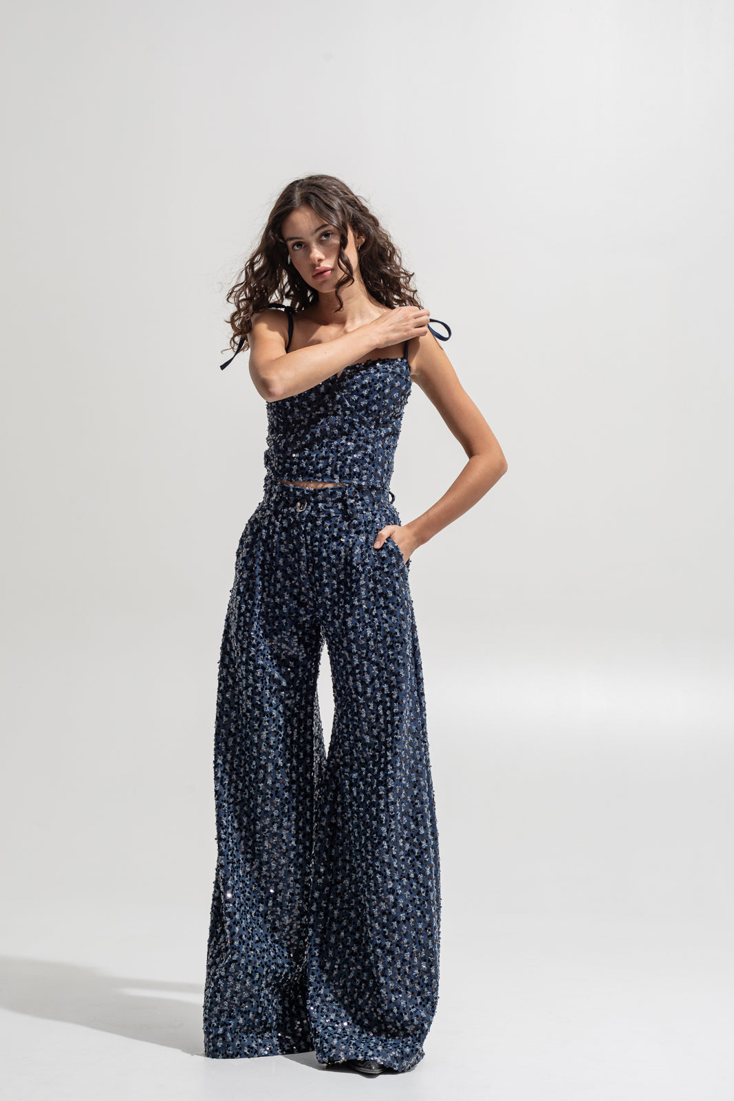 Denim base with all-over sequin embroidery