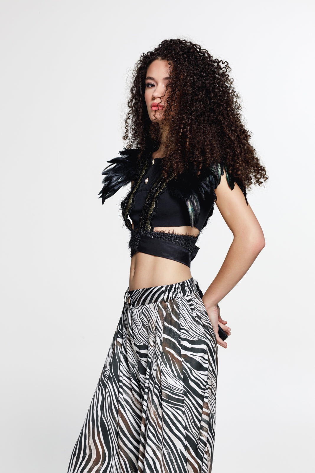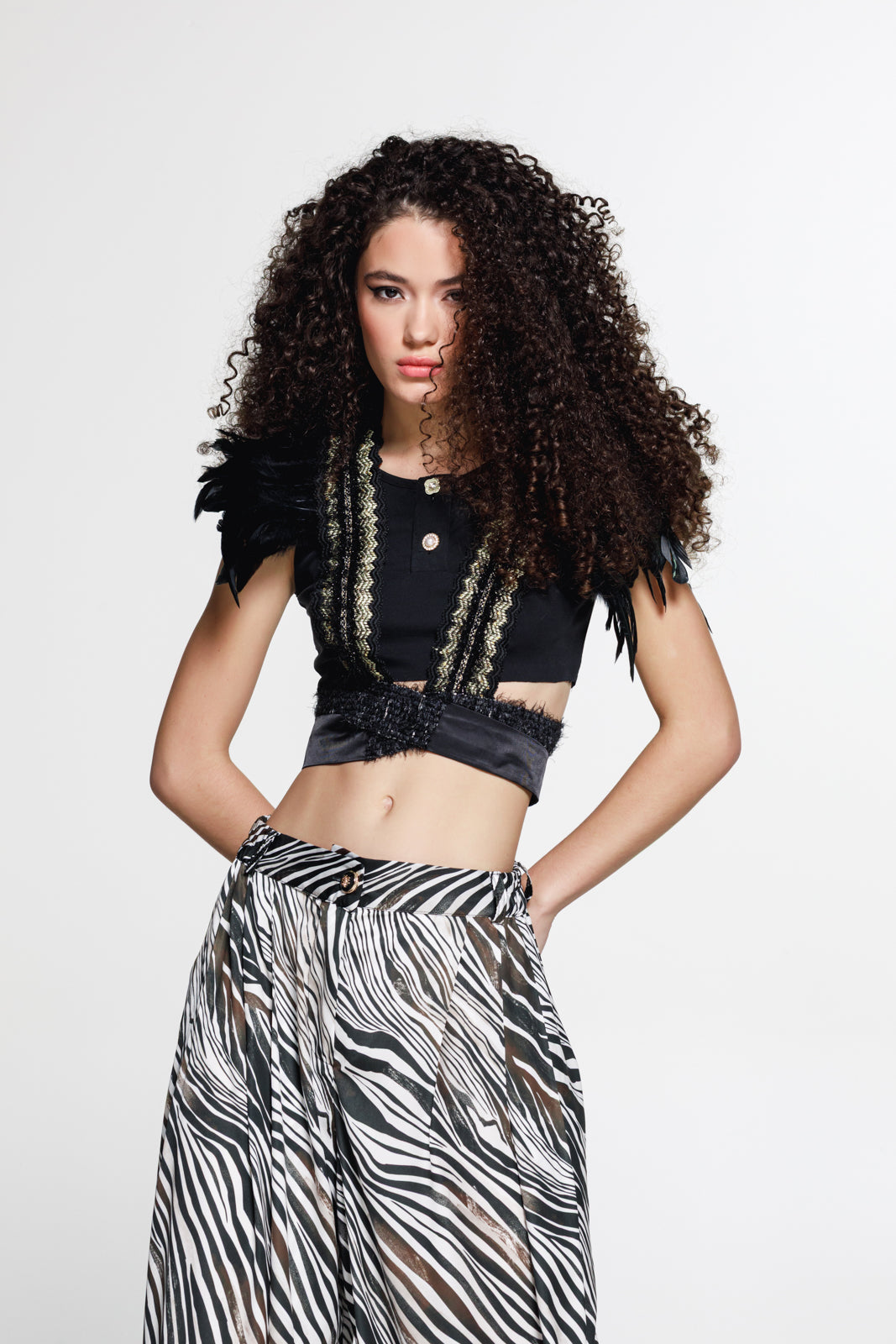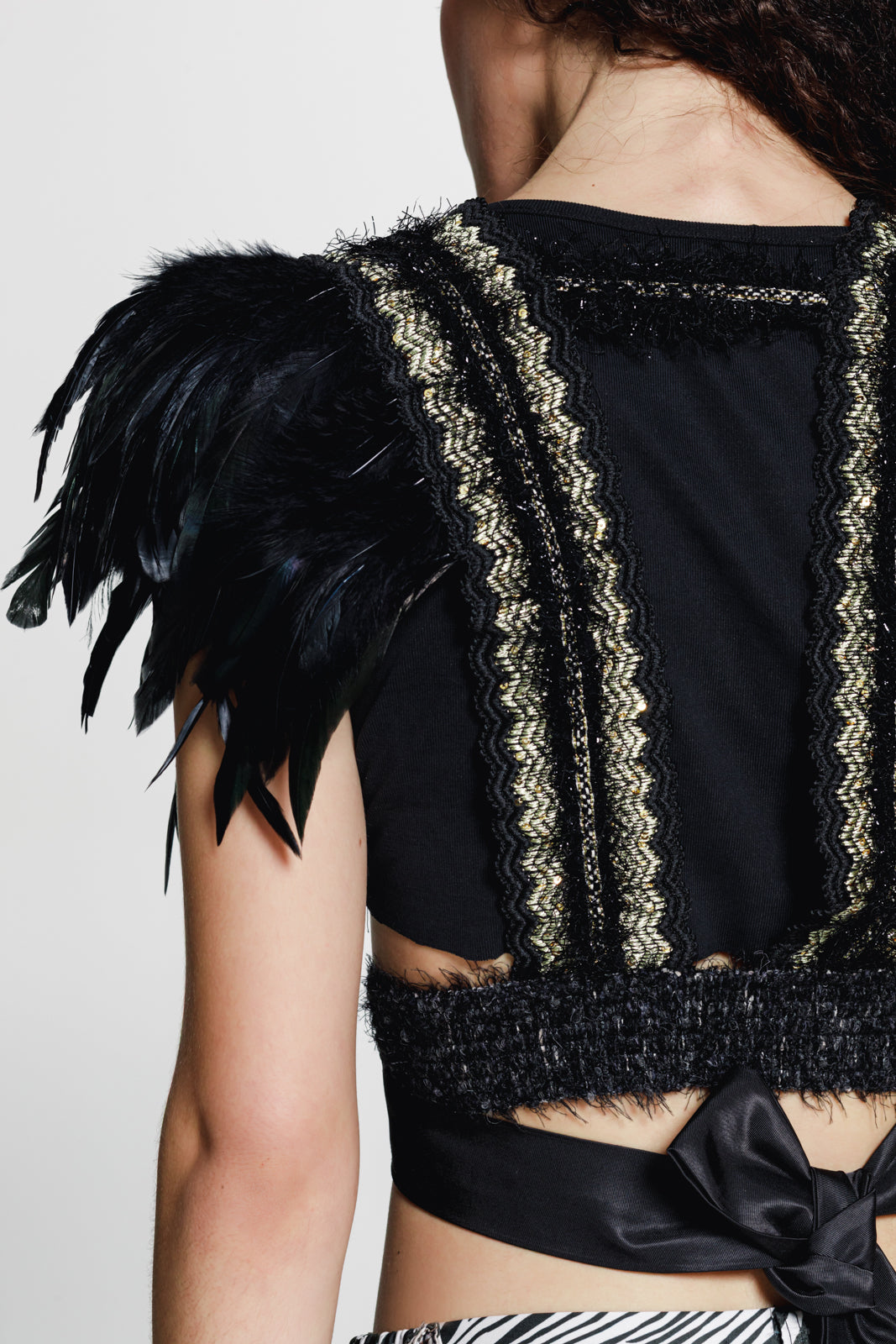 A statement cropped vest that blends vintage elegance with bold detailing. Crafted from black fabric and enriched with decorative trims, it features feathered shoulders that add texture and dramatic volume to the silhouette.