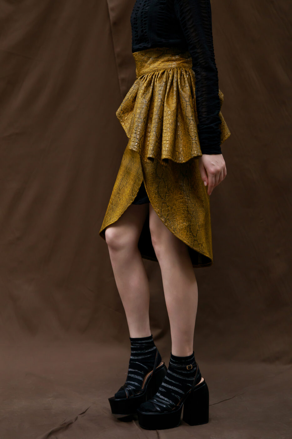 Geometric and statement-making, this faux-leather style is featured in a high-rise, midi, extra slim-fit silhouette with exaggerated ruffled detailing at the front for added shape. Back zip closure. Iconic and vintage inspired. Super slim fit in all sizes.