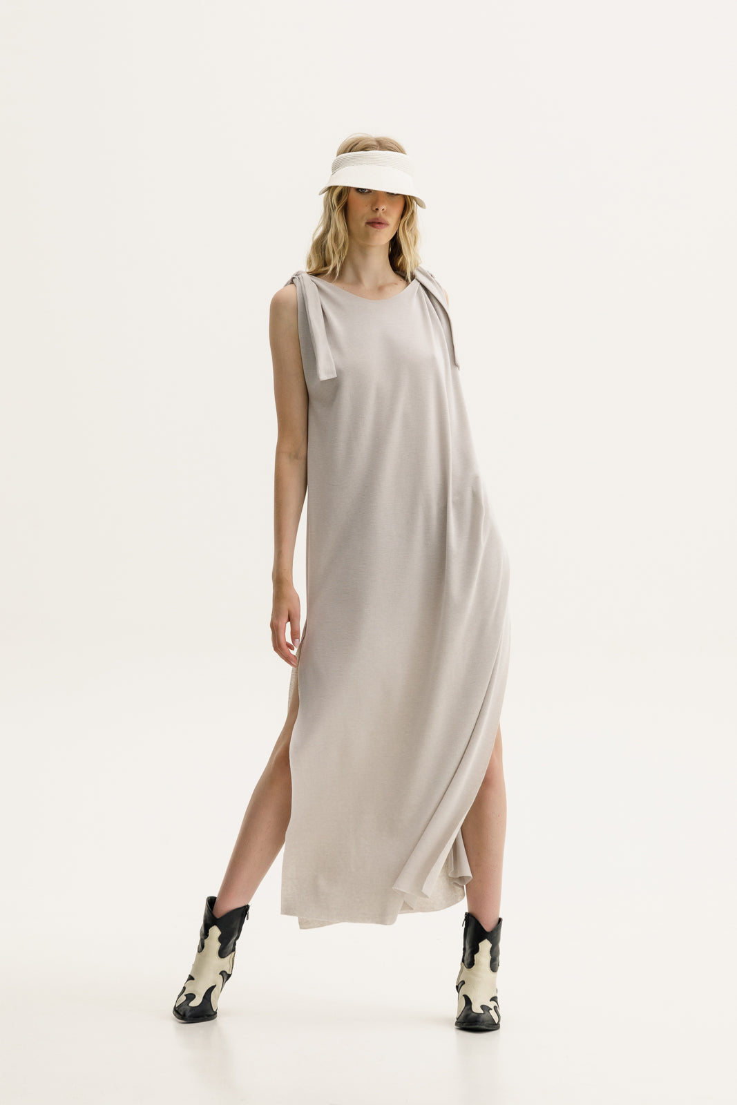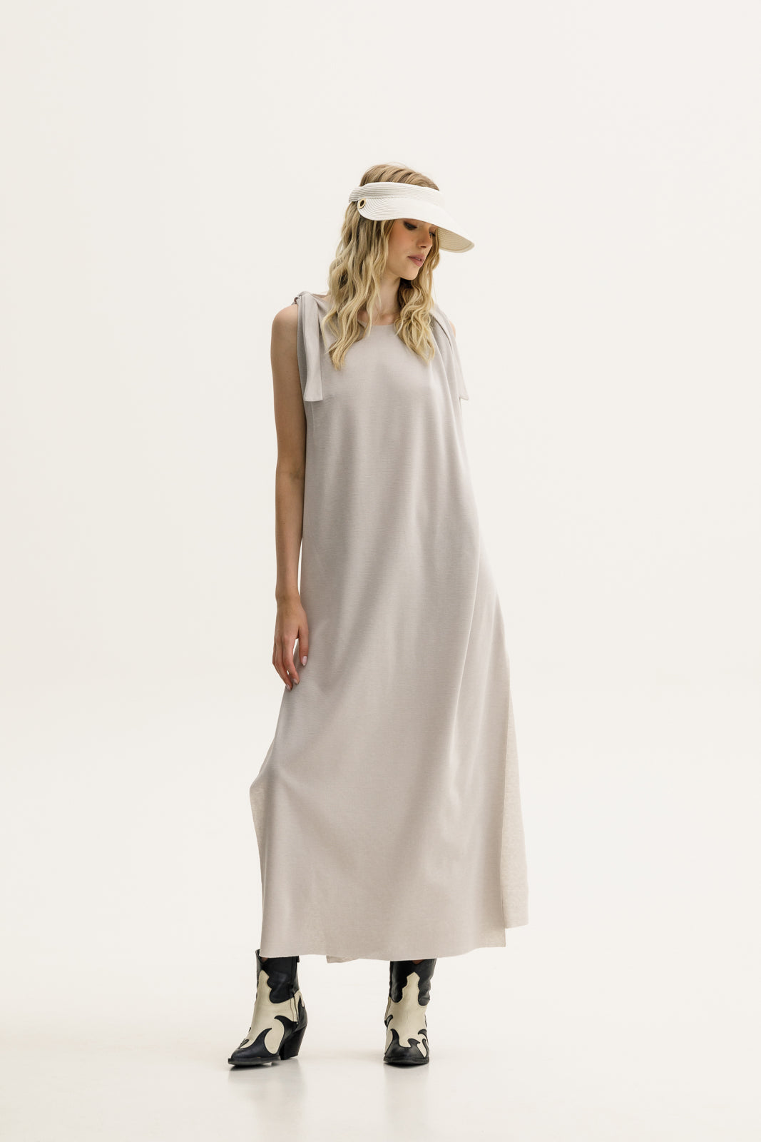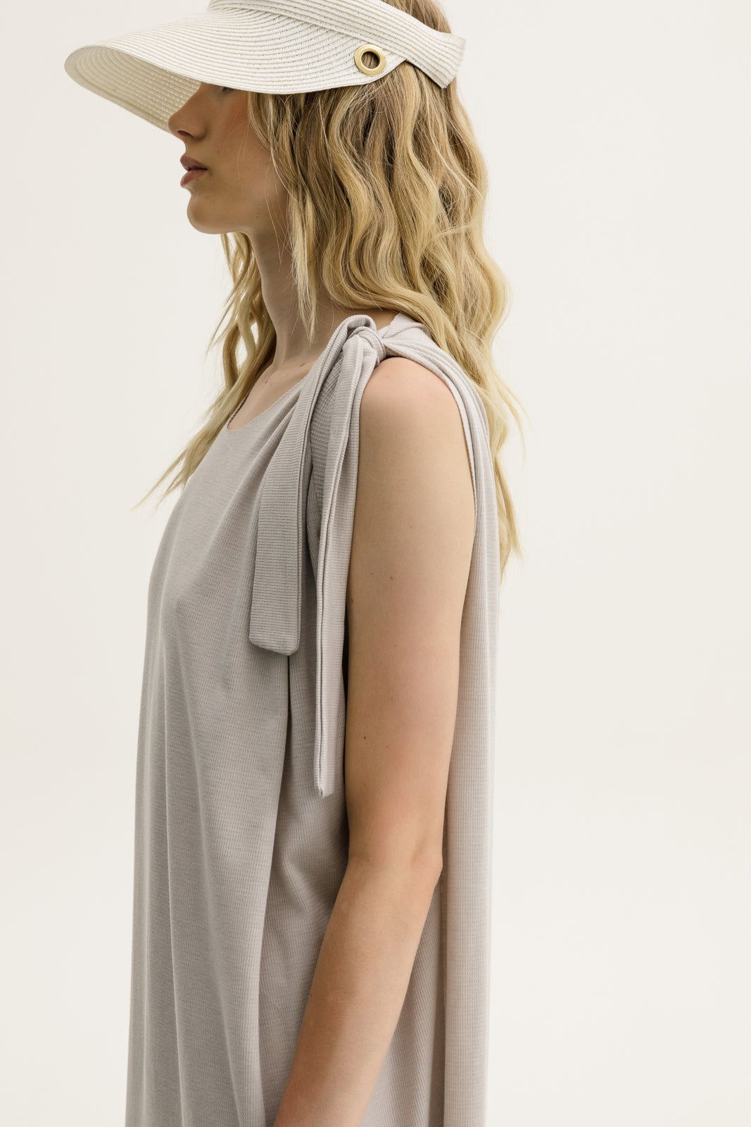 A sleeveless dream dress in a soft sand hue, featuring wide knotted ties at the shoulders and a modern round neckline. Its side slits add movement and just the right amount of edge. Deep side slits for extra ease and fluidity. Pair with cowboy boots for a cool-girl summer uniform or dress it up with a sleek heel.