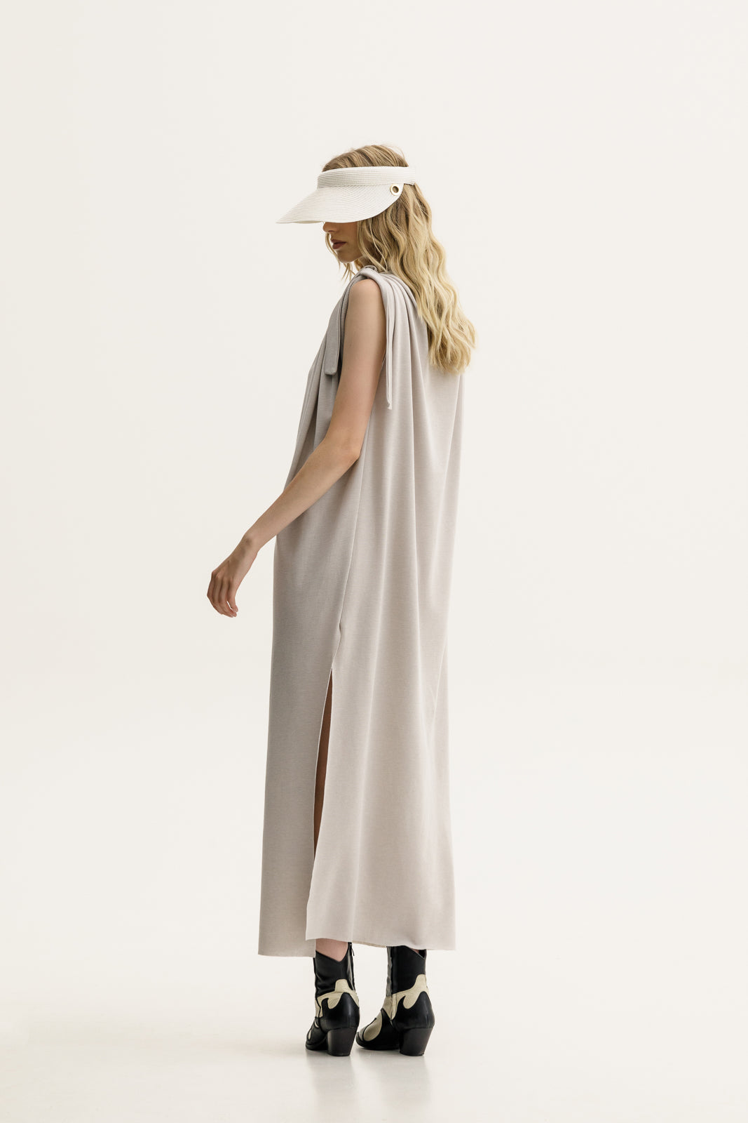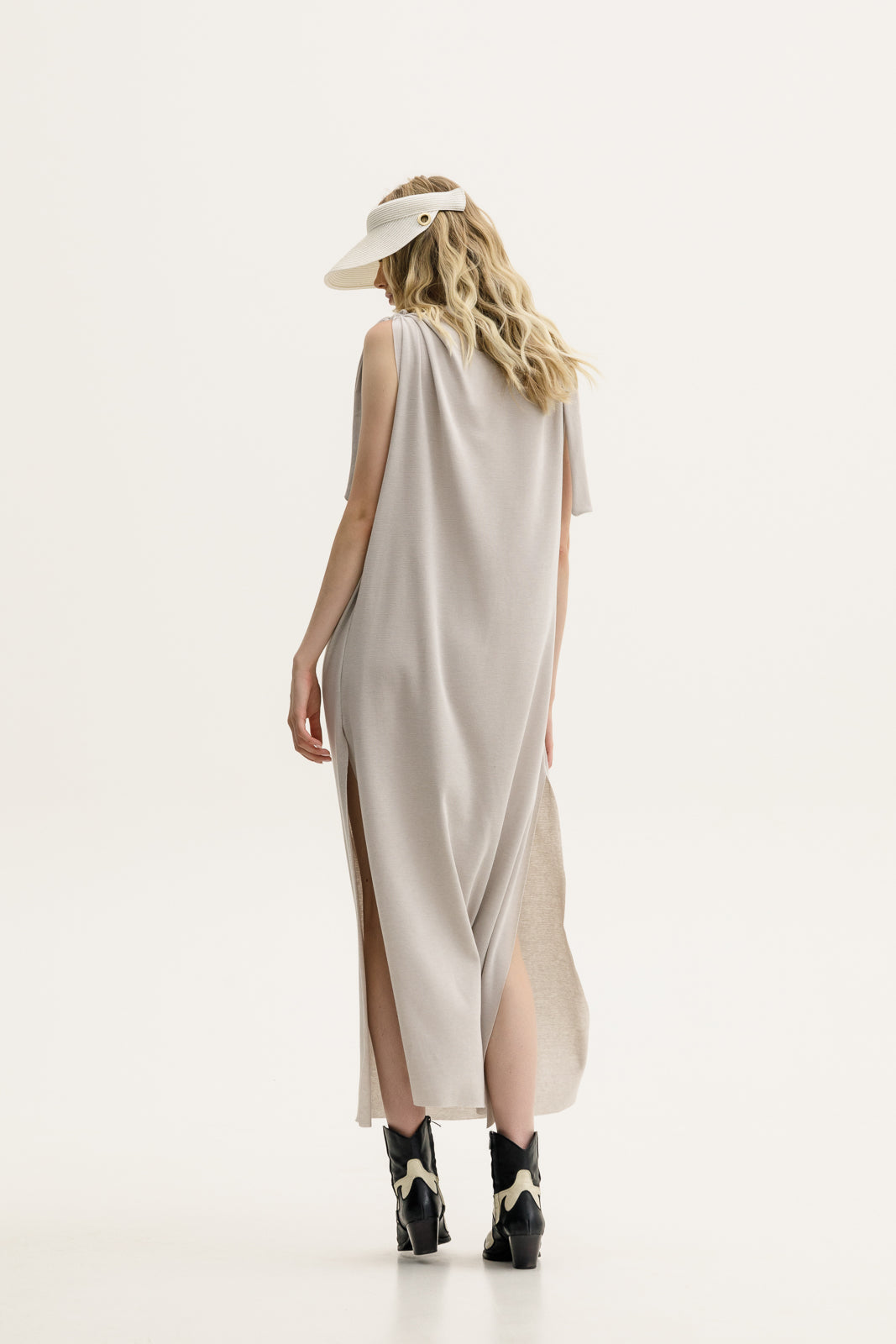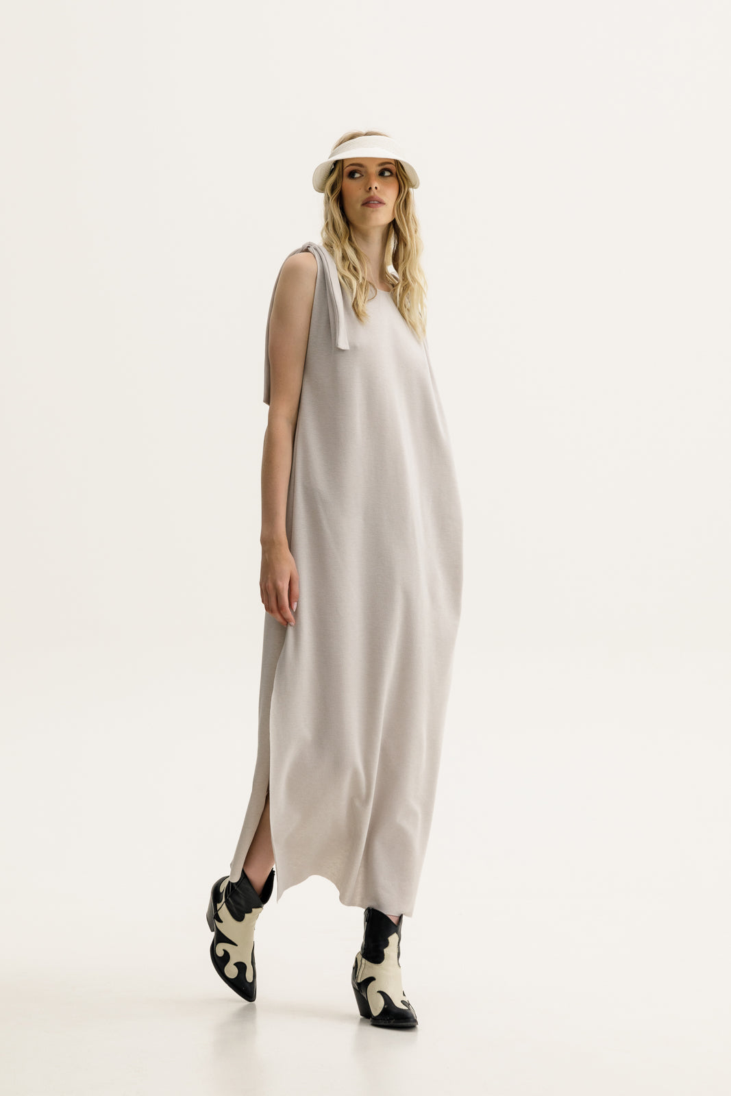 A sleeveless dream dress in a soft sand hue, featuring wide knotted ties at the shoulders and a modern round neckline. Its side slits add movement and just the right amount of edge. Deep side slits for extra ease and fluidity. Pair with cowboy boots for a cool-girl summer uniform or dress it up with a sleek heel.