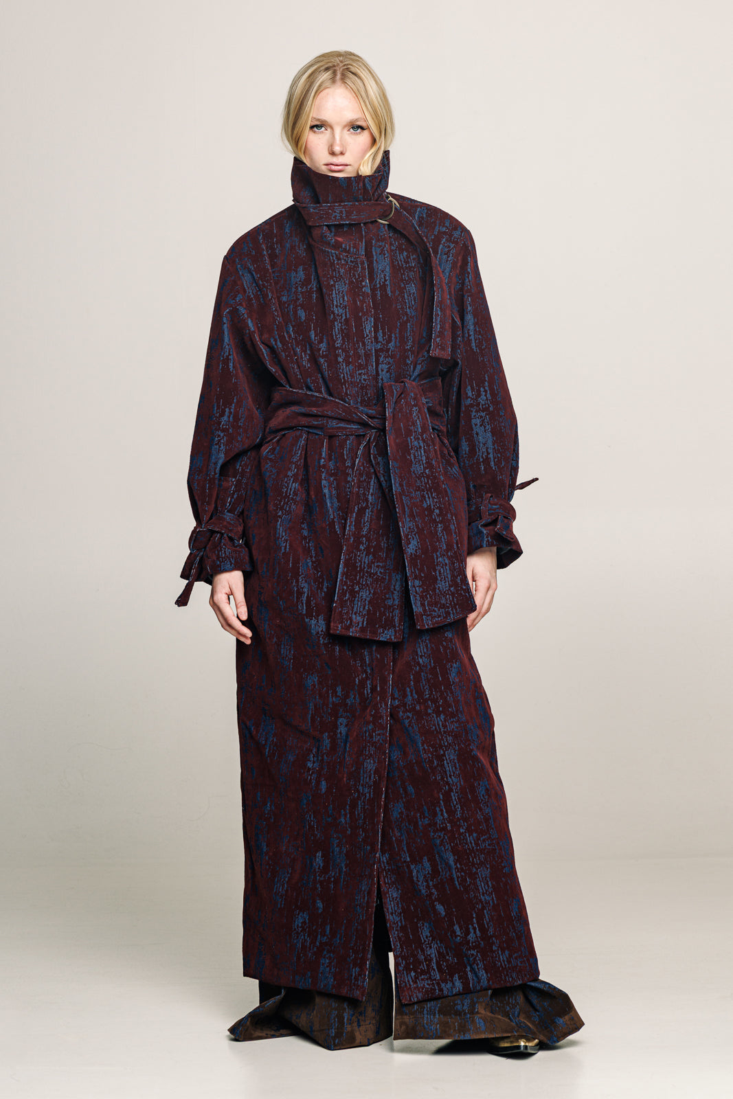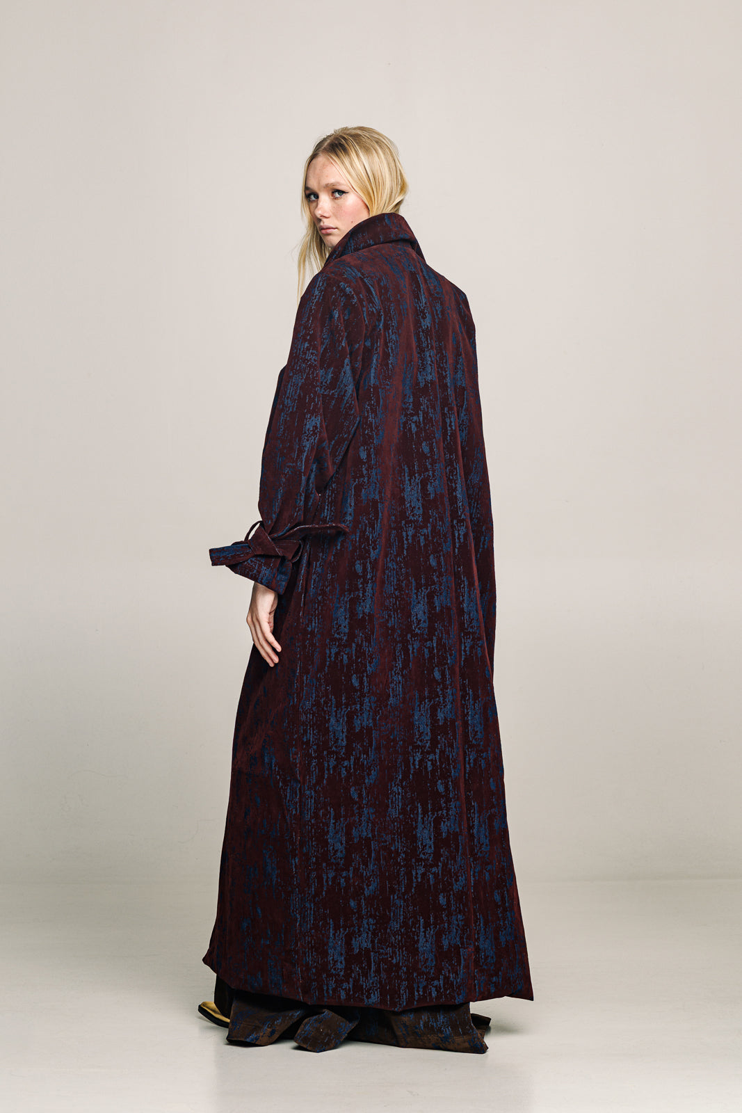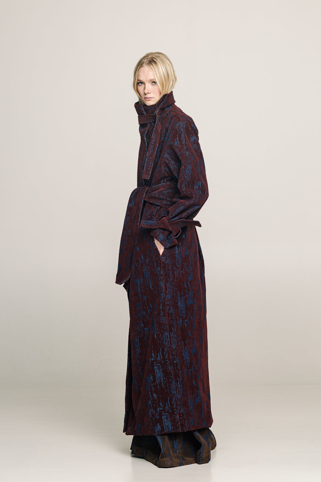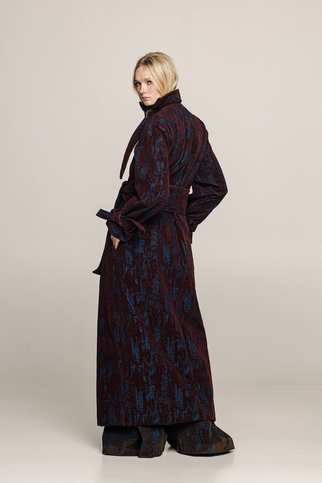 A full-length trench coat in denim with a deep bordeaux  velvet print designed to move with strength and ease.