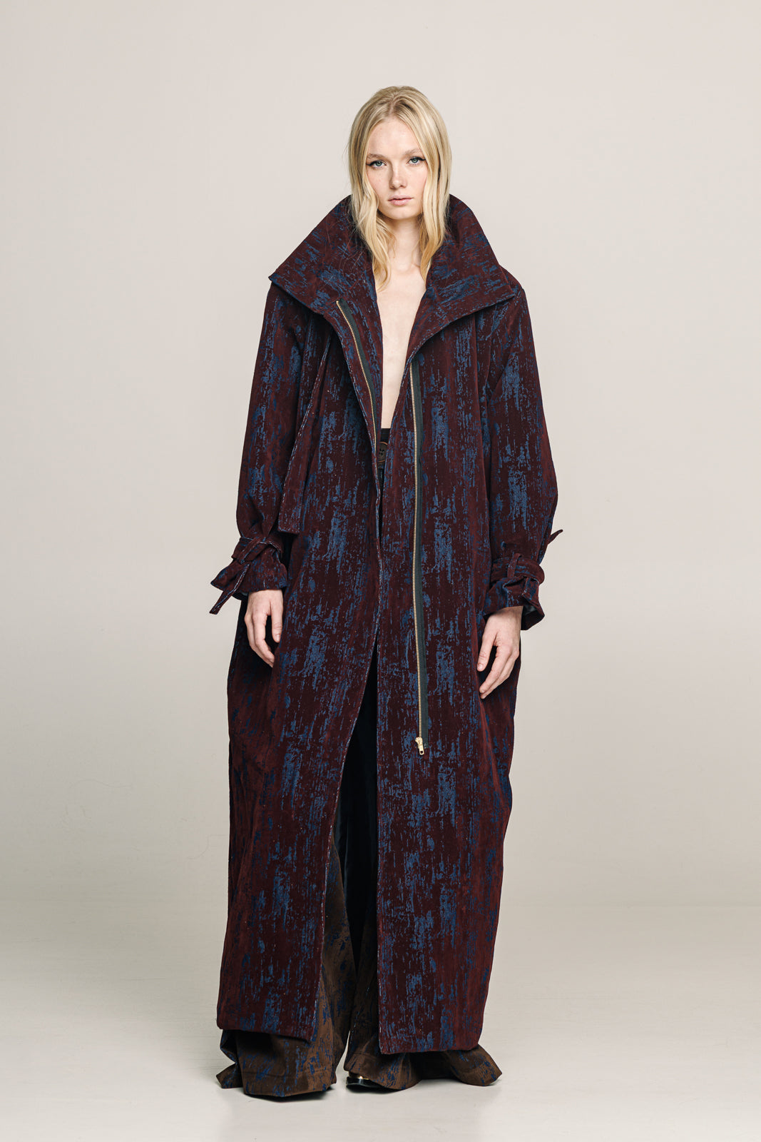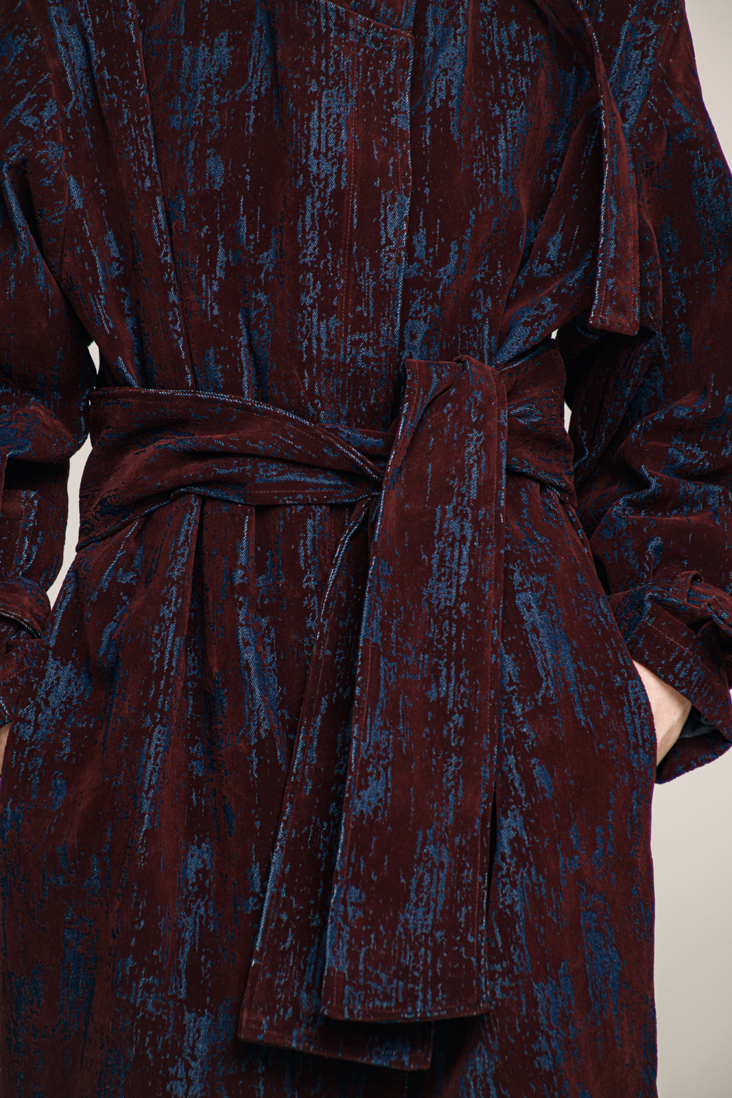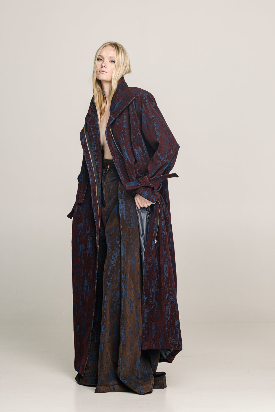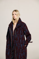 A full-length trench coat in denim with a deep bordeaux  velvet print designed to move with strength and ease.