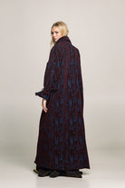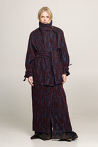 Crafted from soft cotton with a velvet-touch finish, it features a high collar with metal buckle, exaggerated sleeves and a wide belt that shapes the silhouette while keeping it free. Minimal yet commanding — made for women who don’t follow, but lead.
