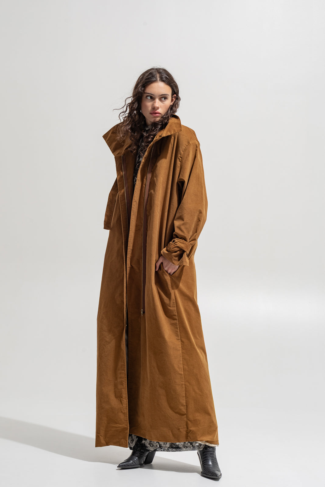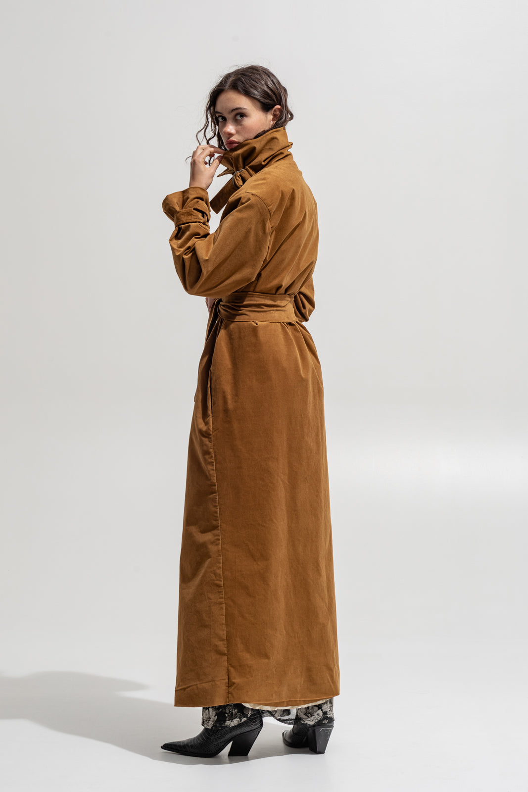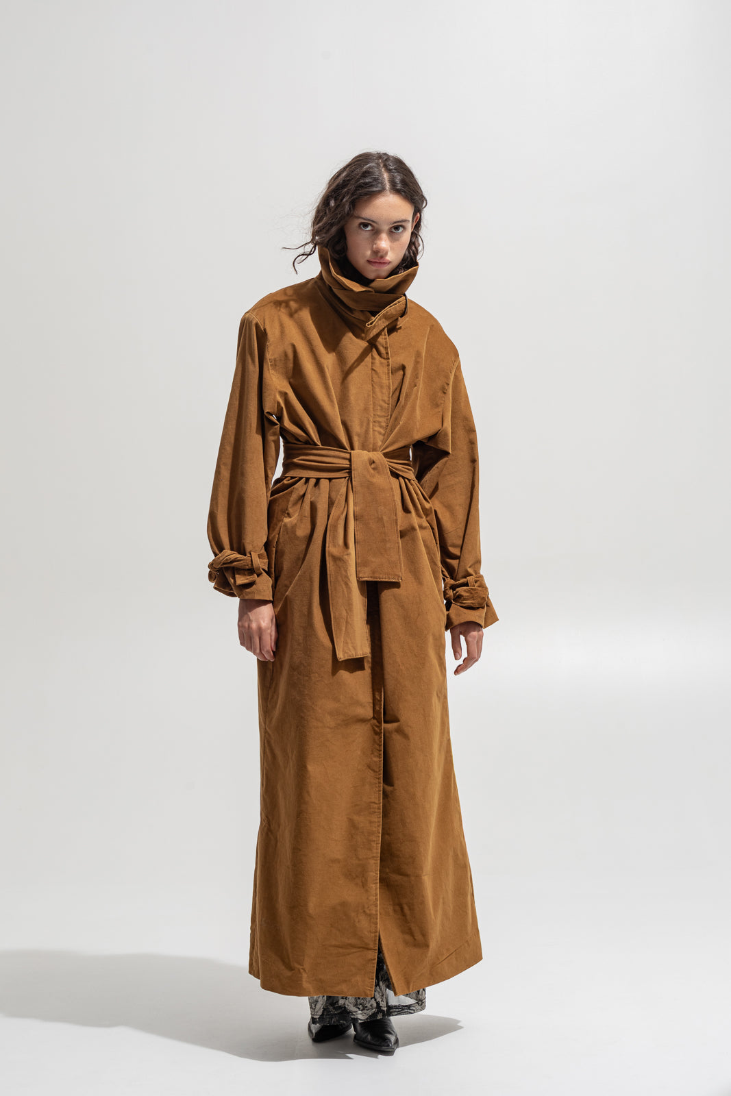 This full-length trench coat blends timeless tailoring with modern rebellion. Crafted from soft velvety cotton in a deep sand hue, it moves fluidly around the body while keeping a structured shape. The high collar, adjustable waist belt and dramatic volume make it a true statement piece — bold, effortless and made for the streets.