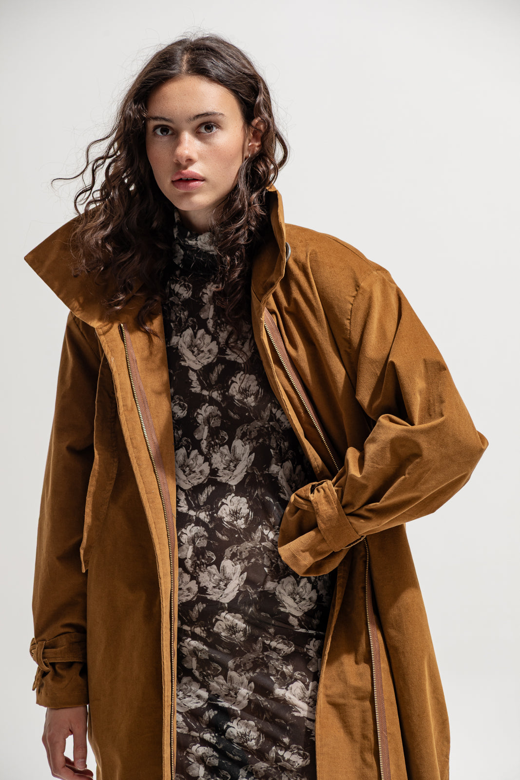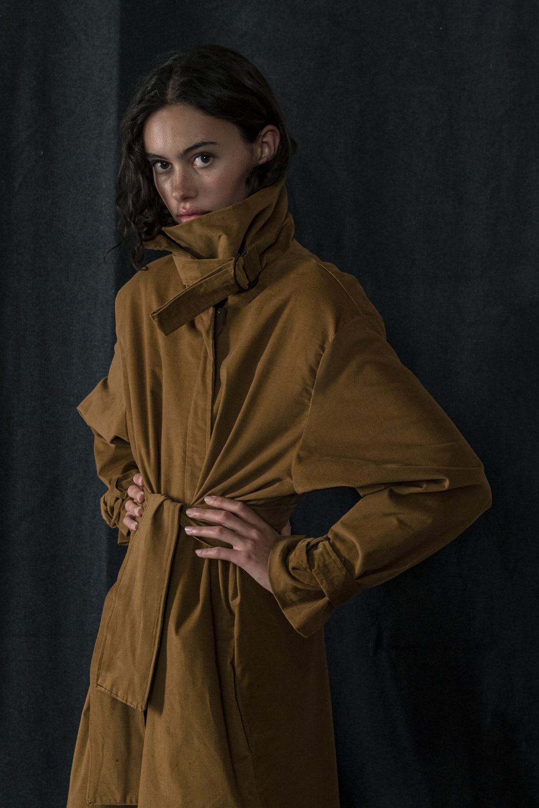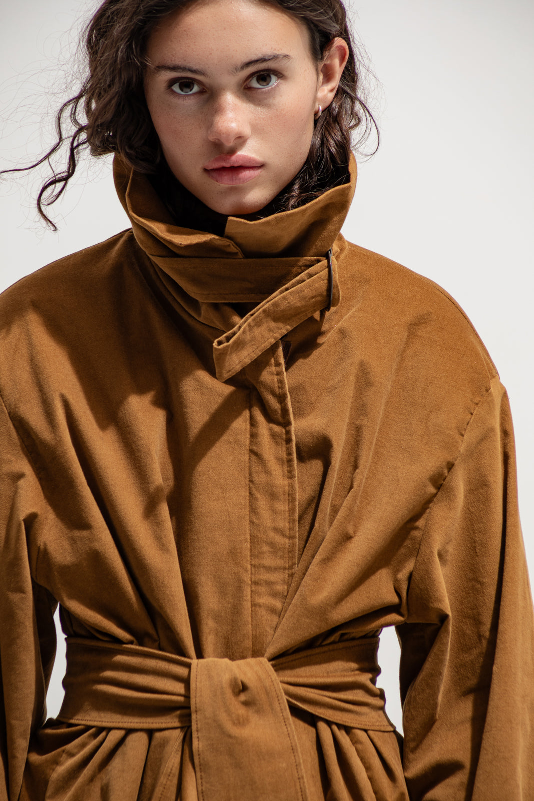 This full-length trench coat blends timeless tailoring with modern rebellion. Crafted from soft velvety cotton in a deep sand hue, it moves fluidly around the body while keeping a structured shape. The high collar, adjustable waist belt and dramatic volume make it a true statement piece — bold, effortless and made for the streets.