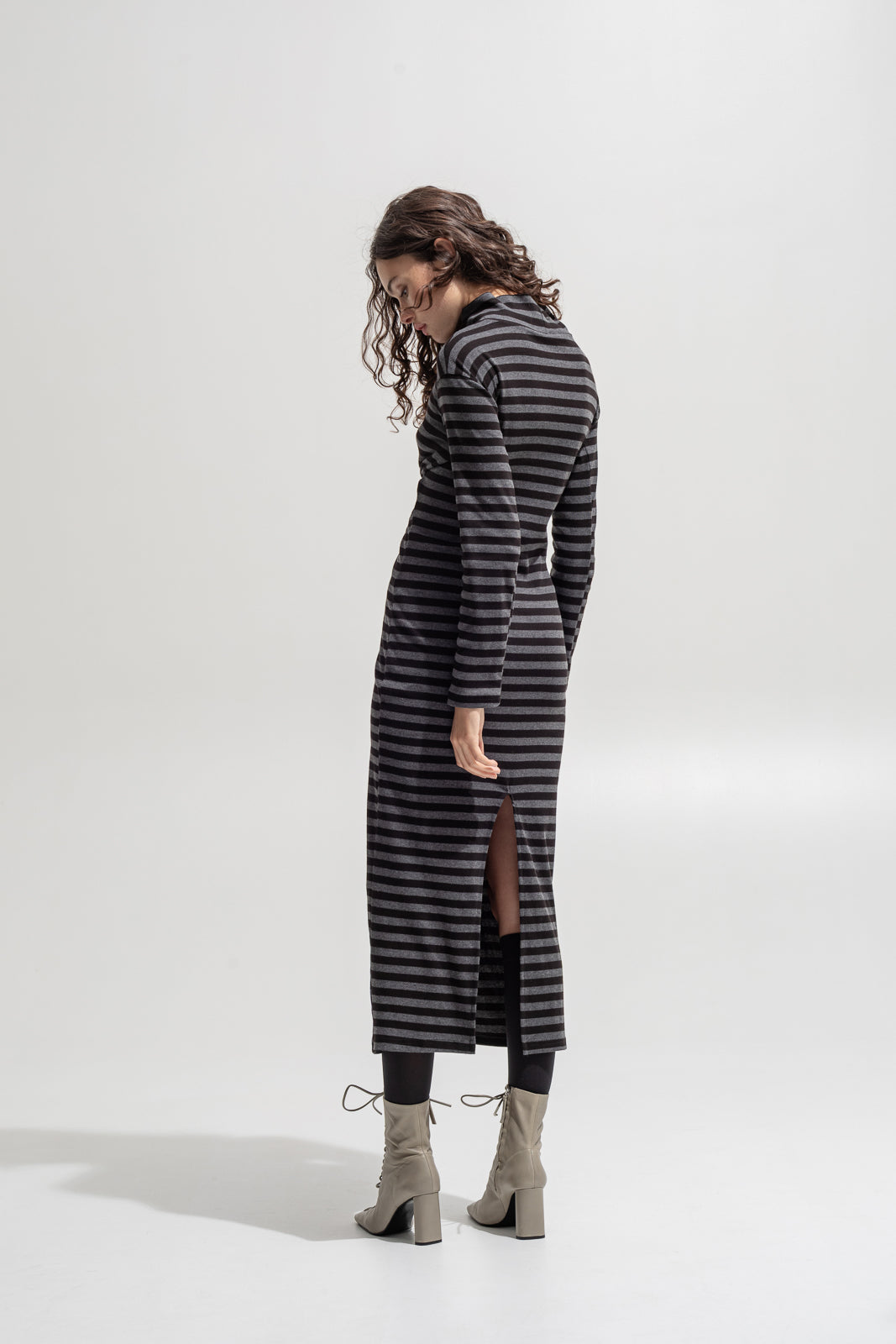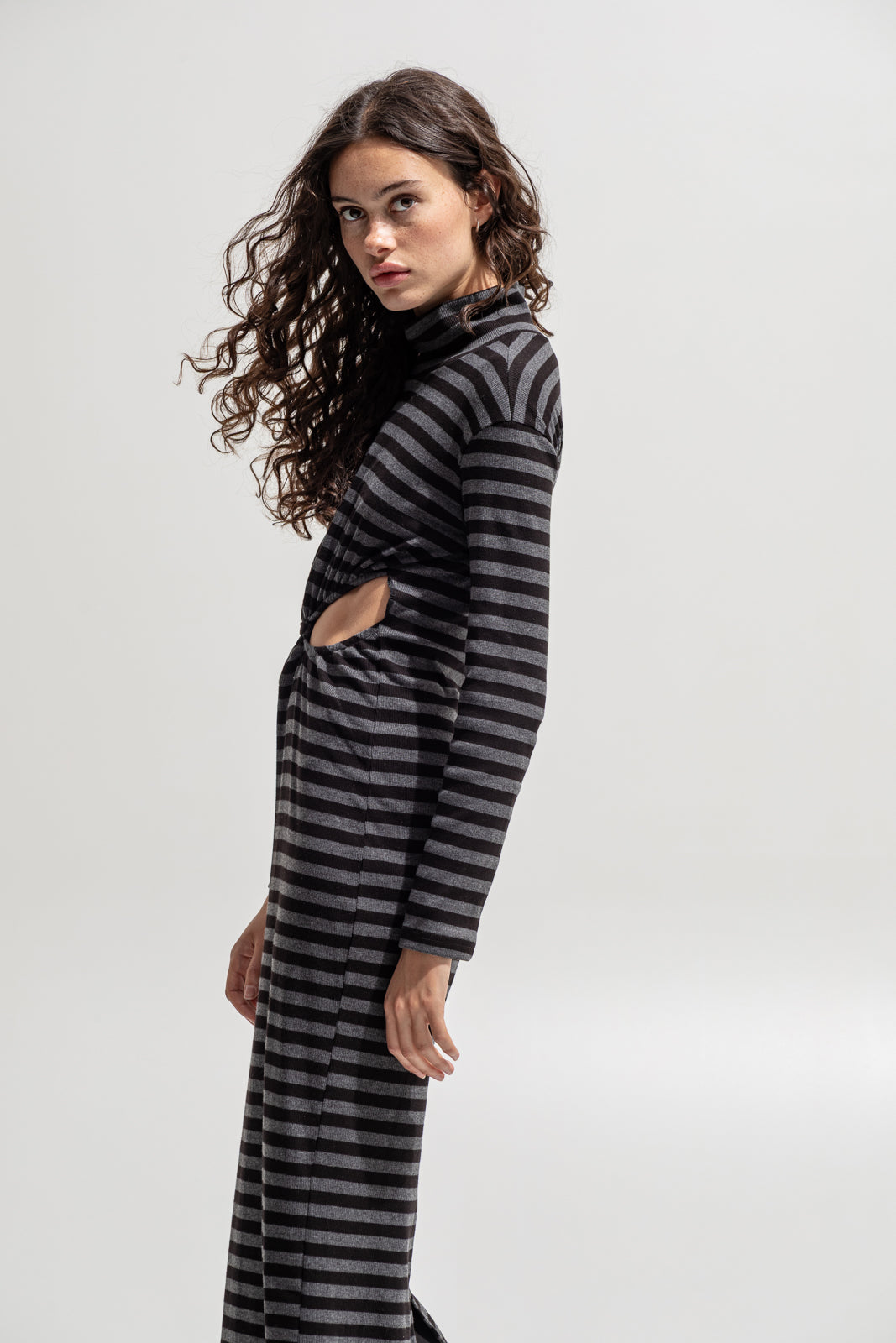A modern silhouette with a daring twist. This long-sleeve striped dress features a knotted front detail that creates flattering cut-outs at the waist — revealing just enough skin while keeping a sleek, body-skimming line. Designed in soft ribbed stretch fabric for comfort and movement, it’s finished with a high neckline and back slit for effortless wearability.
