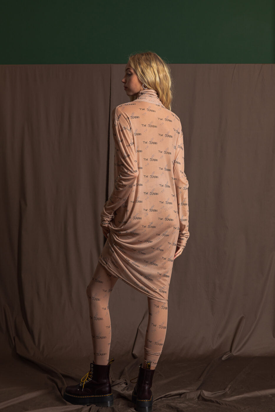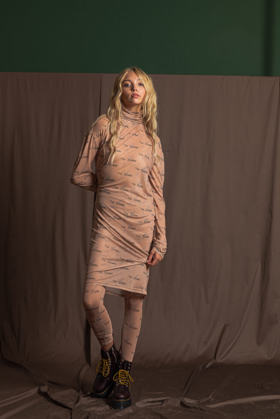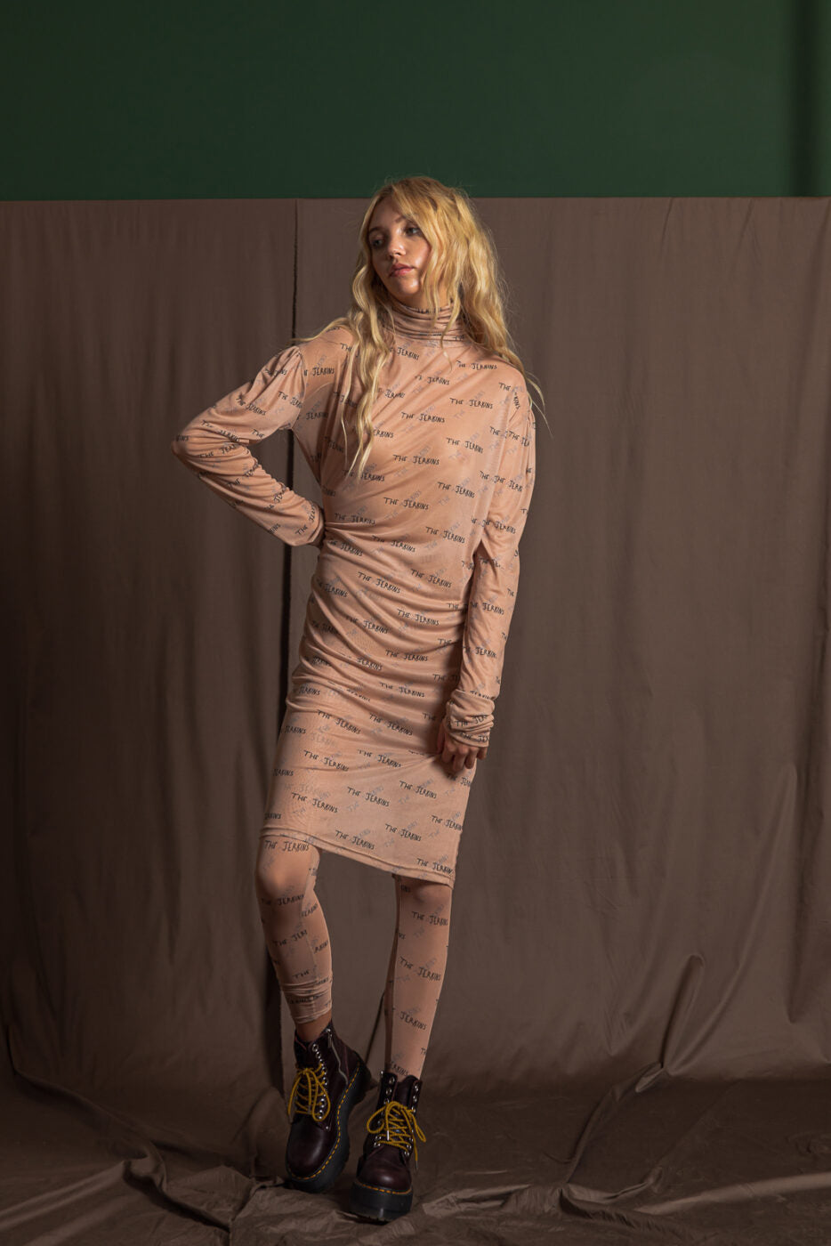 Perfect for layering, this sultry mesh long-sleeve dress is featured in a sheer design with logo print and a turtle-neckline. Relaxed fit, fluttery hemline and midi length.