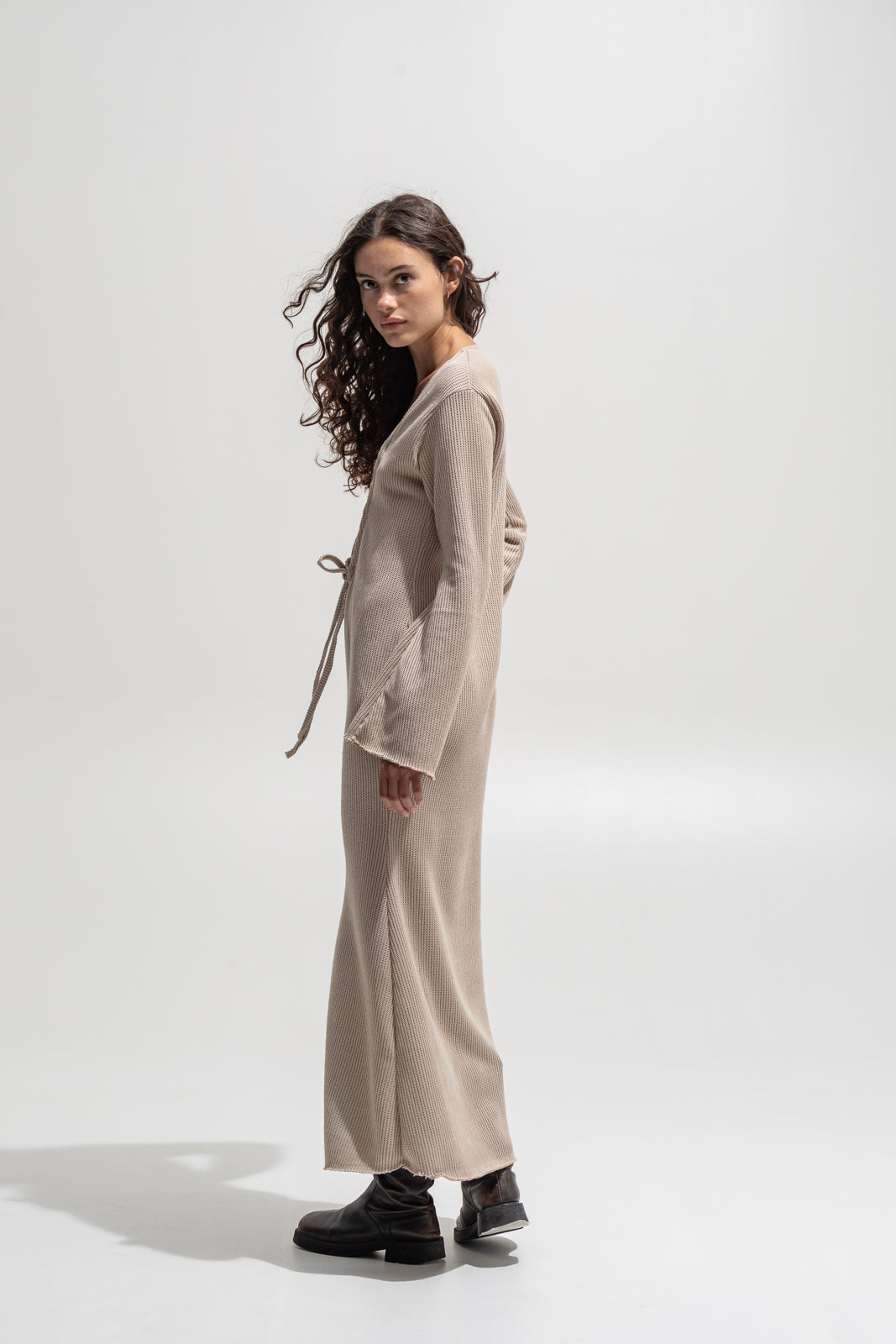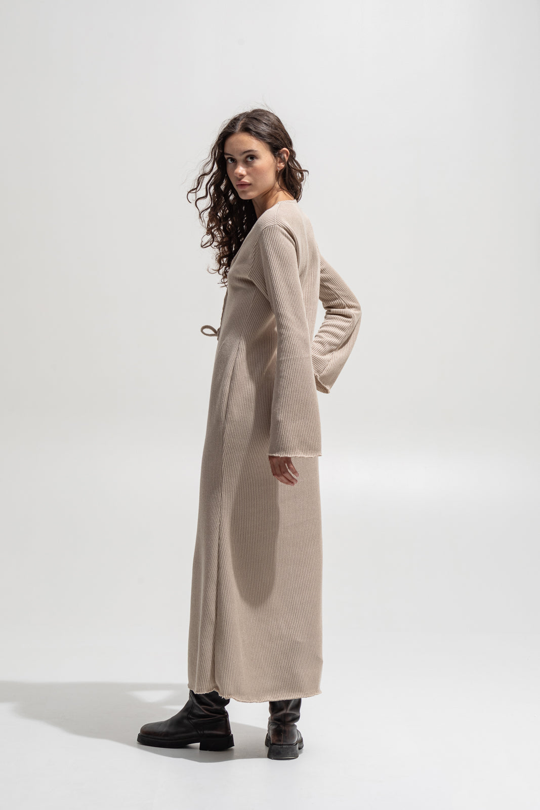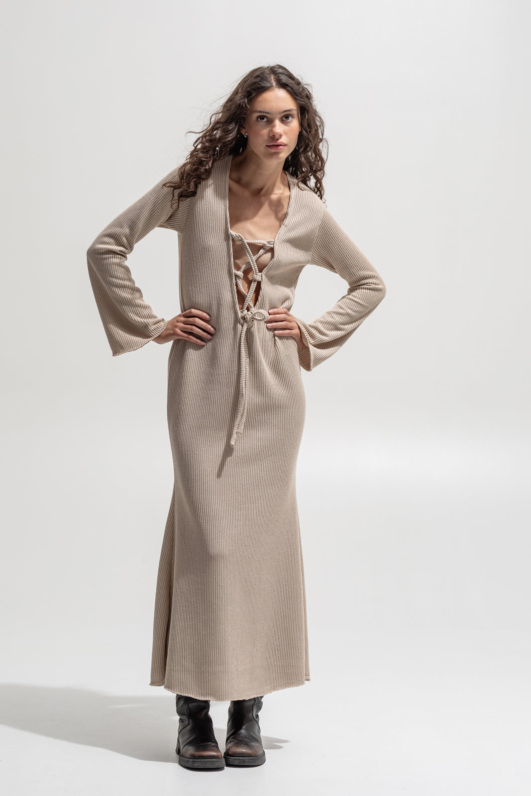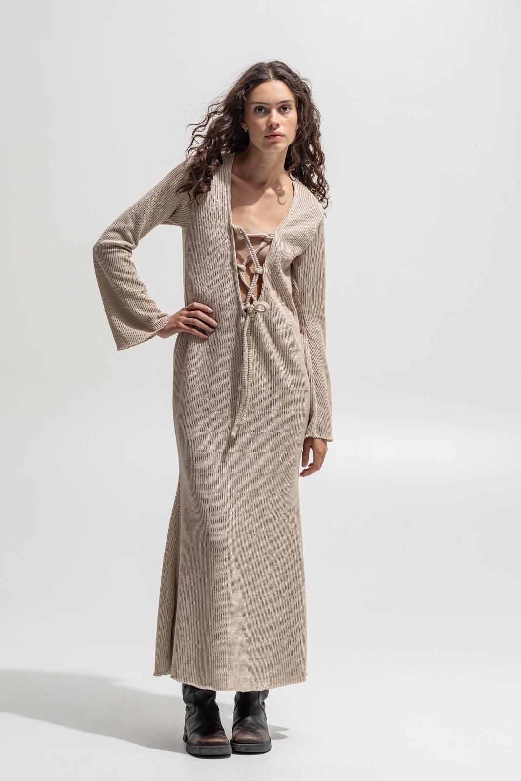 A minimal piece with a striking twist — this maxi knitted dress in soft vanilla offers both comfort and edge. Featuring a plunging neckline with bold lace-up rope detail and slightly flared sleeves, it combines laid-back ease with contemporary allure. The ribbed knit fabric sculpts the silhouette while keeping it casual and wearable.