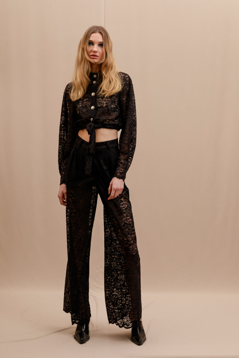 Stunning with a romantic edge, these trousers are the perfect elevated staple in any wardrobe. High-rise, wide-leg silhouette.