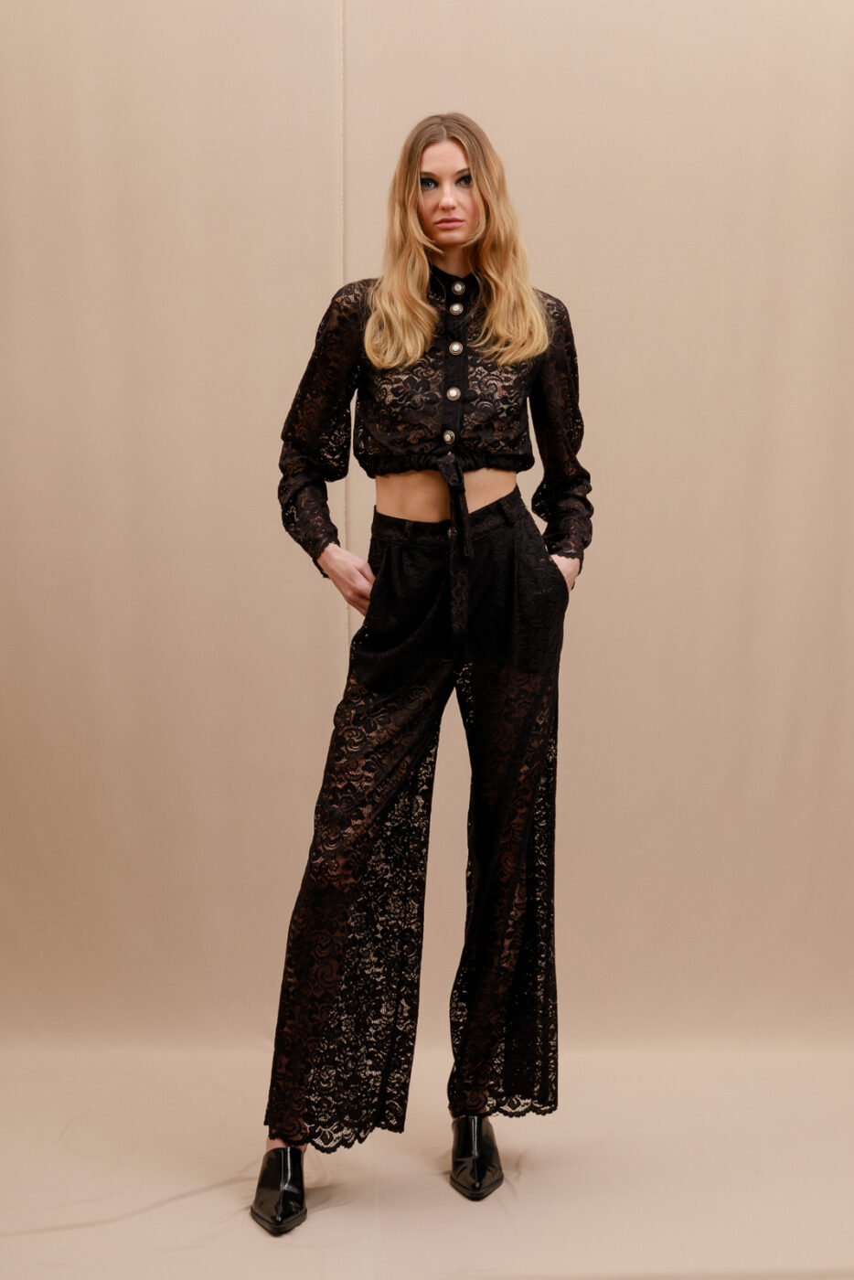 Lightweight and transparent lace fabrication. Zip-fly and button closures. Side pockets.