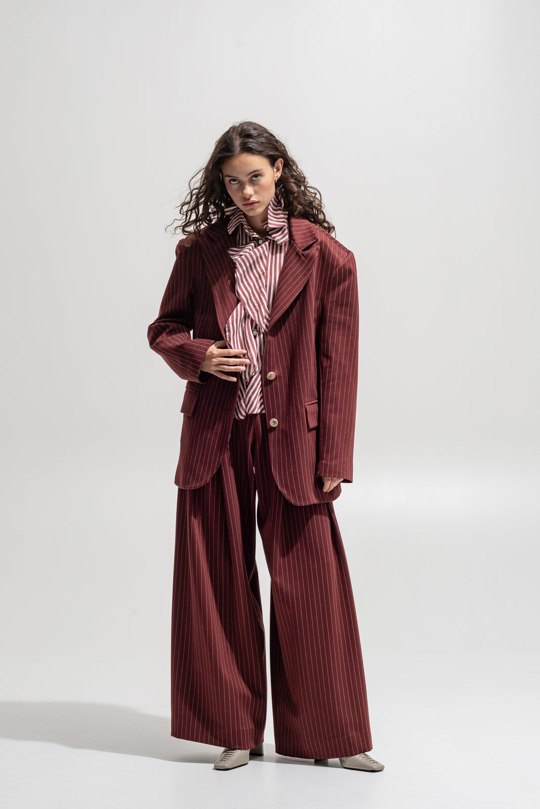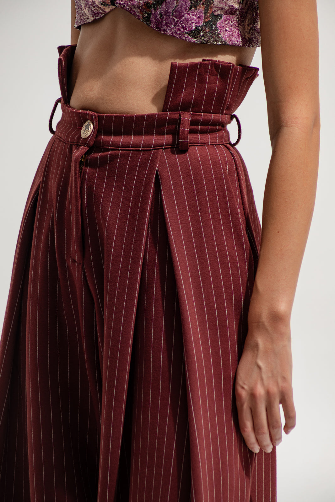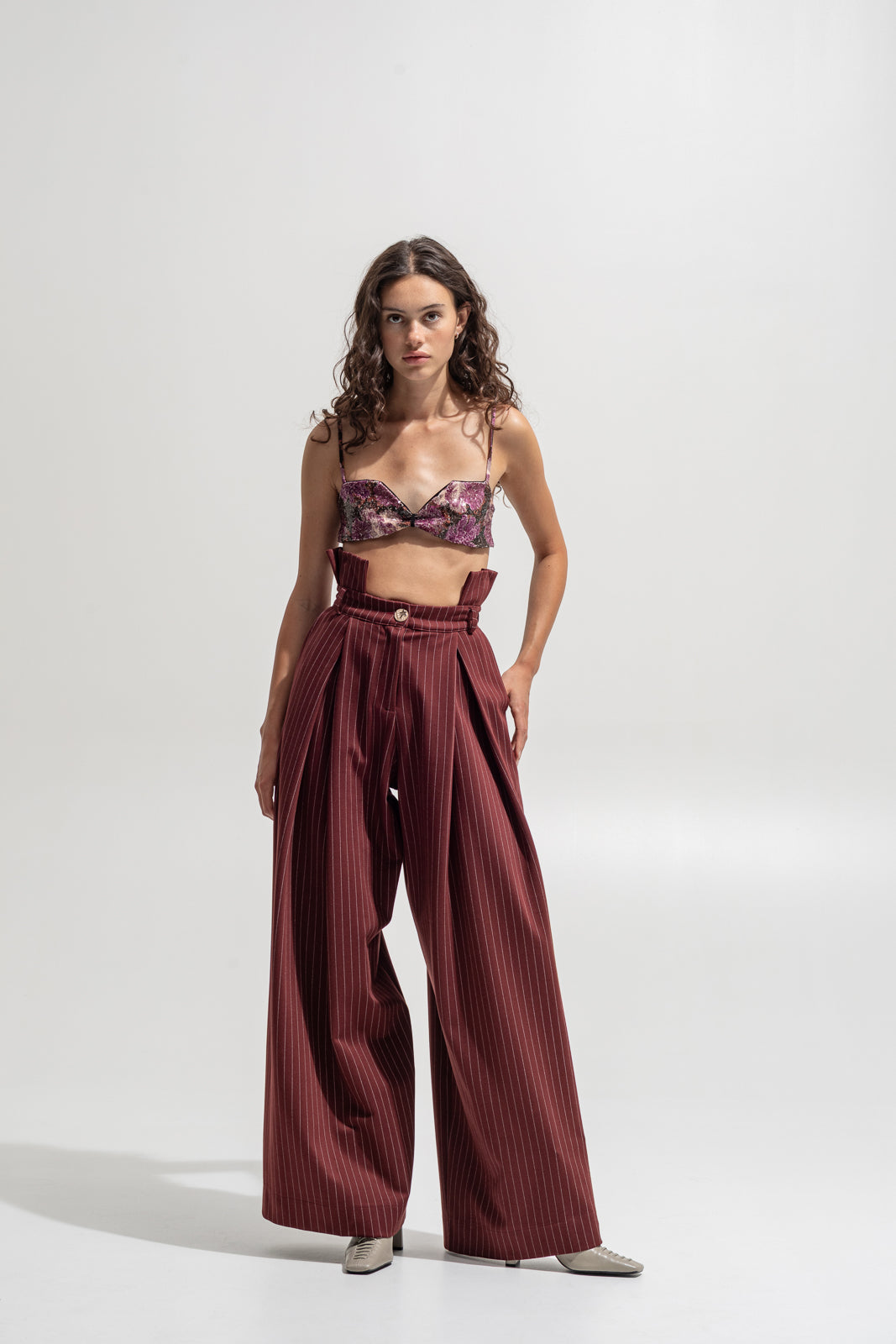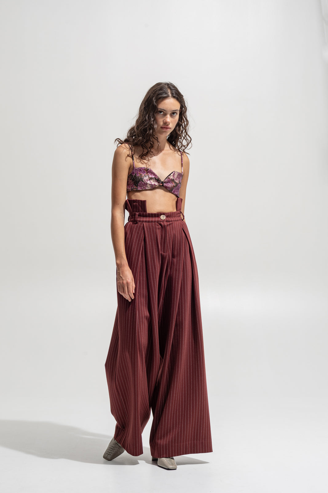 Make a bold entrance with these high-waist wide-leg pants in deep burgundy with subtle pinstripes. Designed with exaggerated pleats and a sculptural waistband detail, they bring drama and sophistication to every look. The flowing, oversized silhouette ensures effortless movement while elongating the figure, making them the ultimate statement piece for modern power dressing.