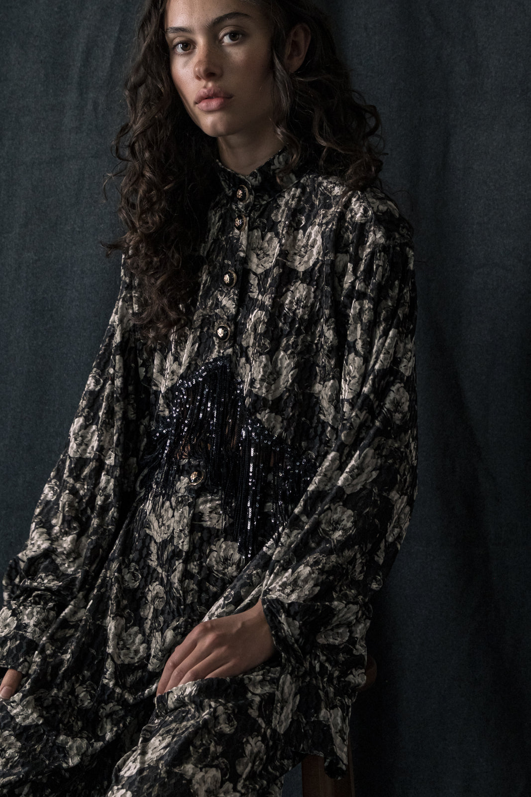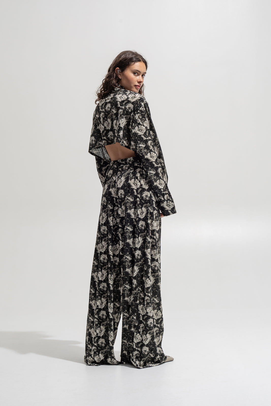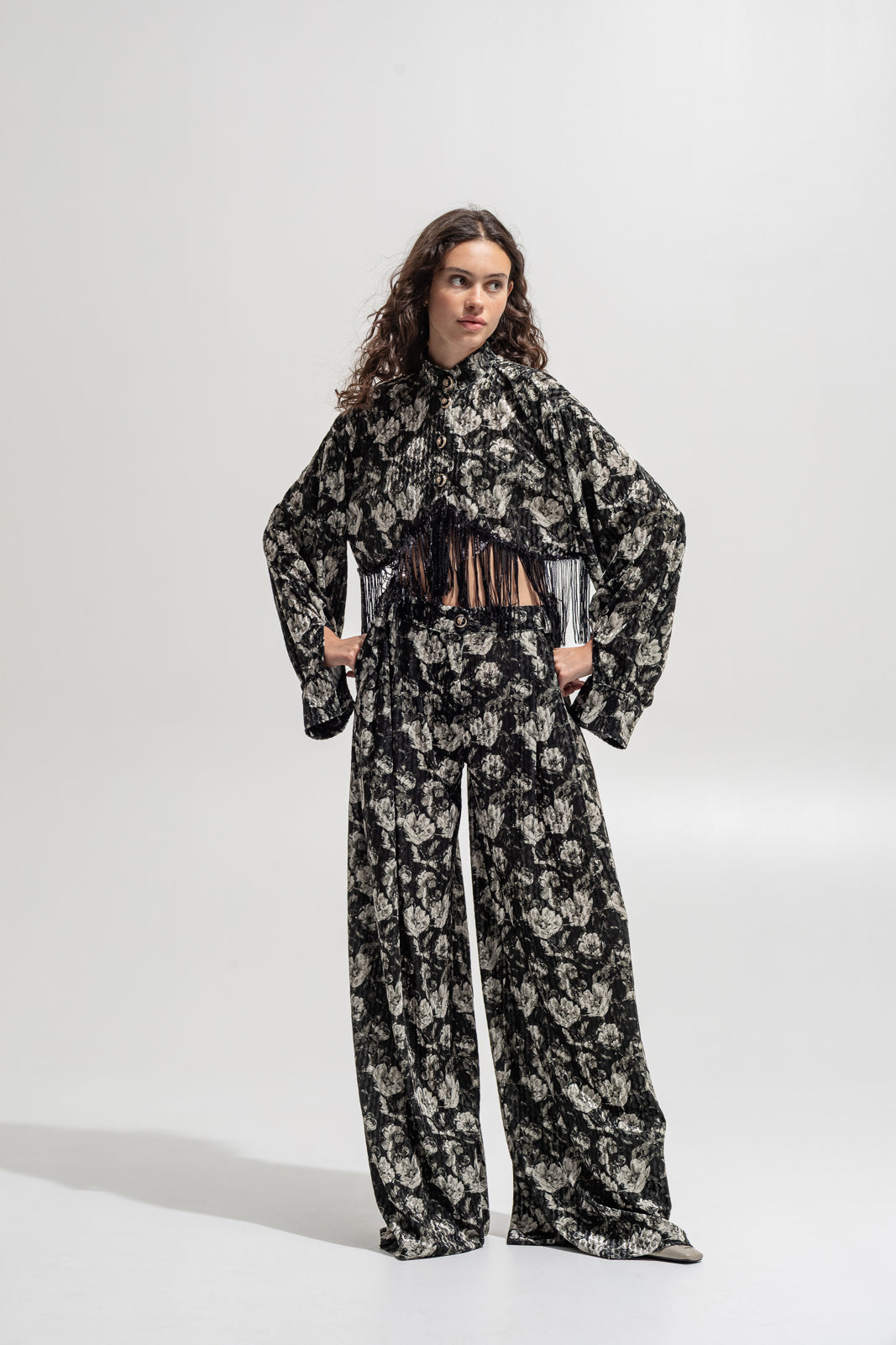 Crafted from embossed floral velvet in shades of black and silver-grey, this piece blends texture, drama, and movement.