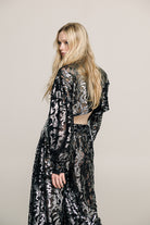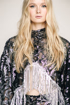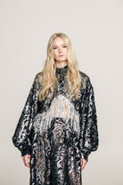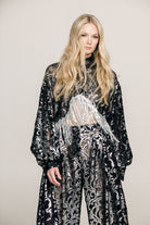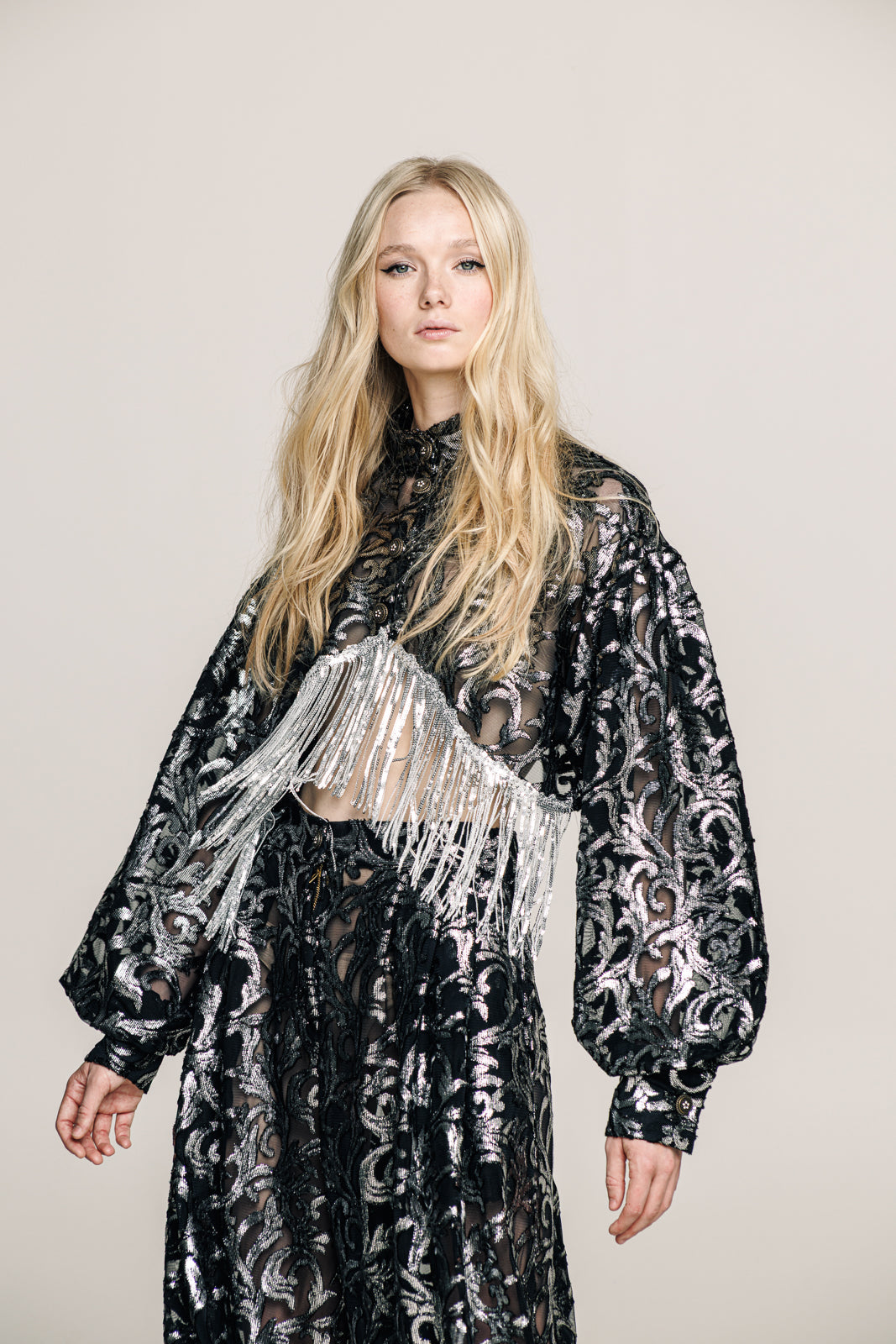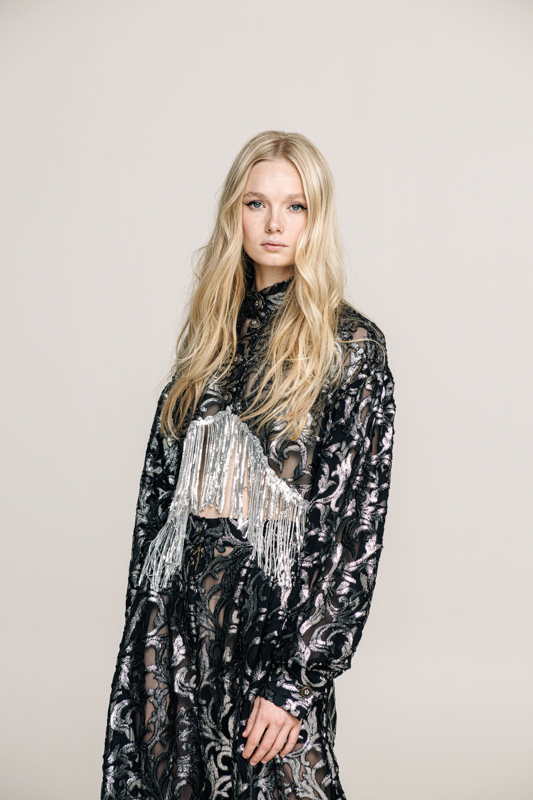 A statement sheer shirt crafted from luxurious black tulle, fully embroidered with metallic silver baroque motifs that catch the light beautifully. Designed with dramatic balloon sleeves, structured cuffs, and front button detailing, it blends opulence with bold attitude. The cascading silver-beaded fringe across the chest adds movement and sparkle with every step. A true high-impact piece for evenings out, parties, or any moment you want to turn heads.