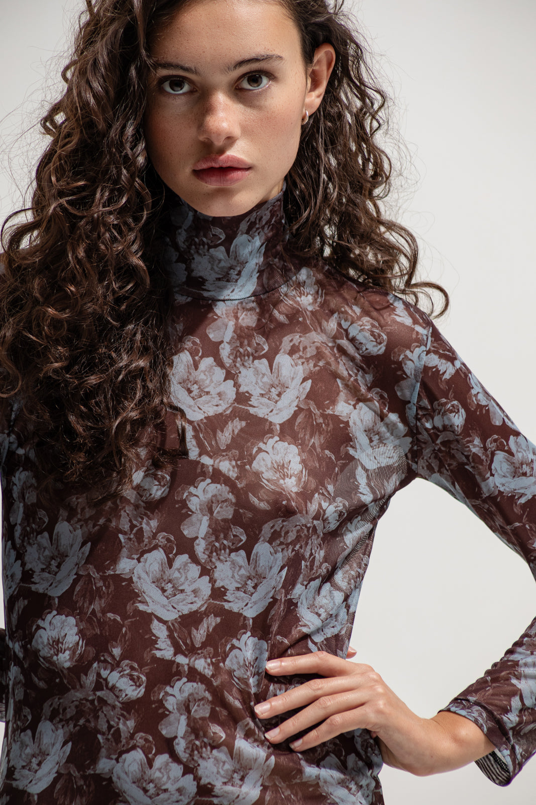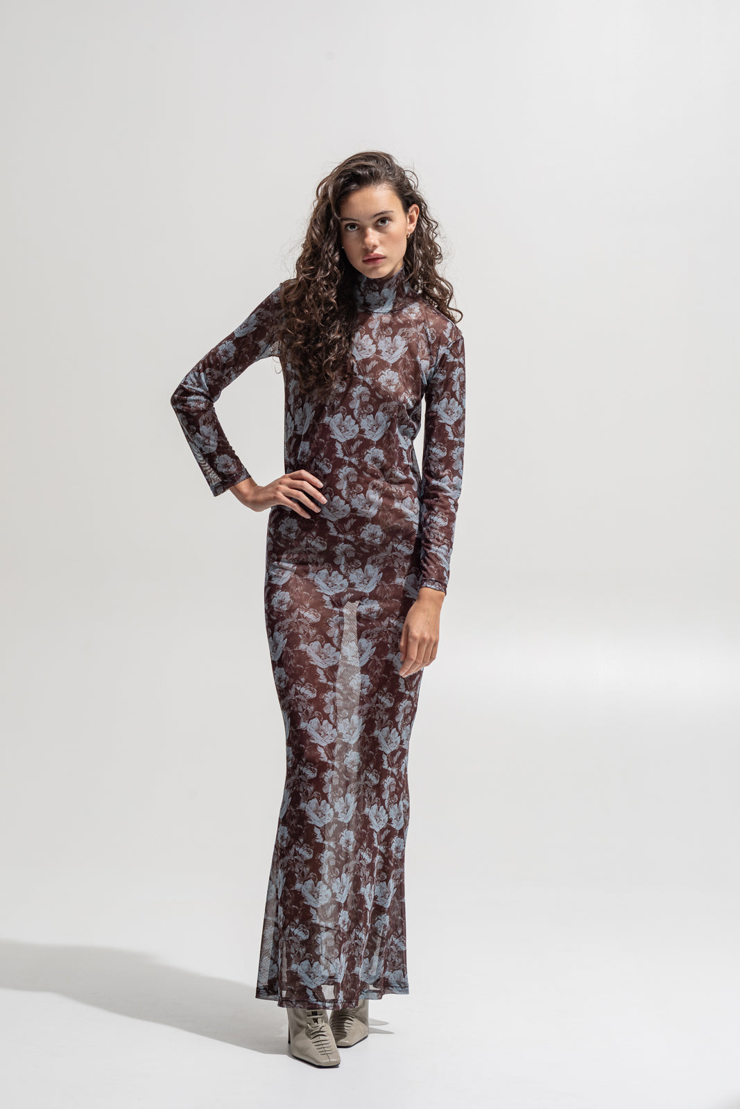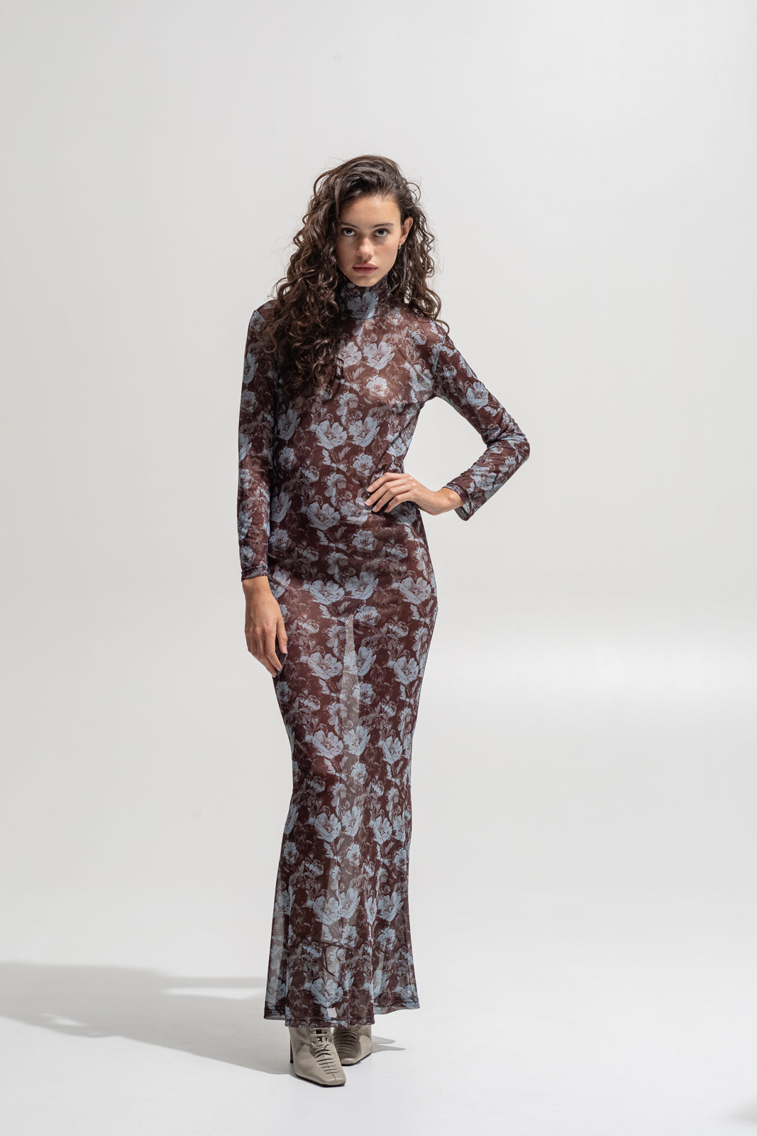 This mesh floral dress combines burgundy and ice-blue tones in a soft transparent fabric that follows the body’s lines with subtle stretch.