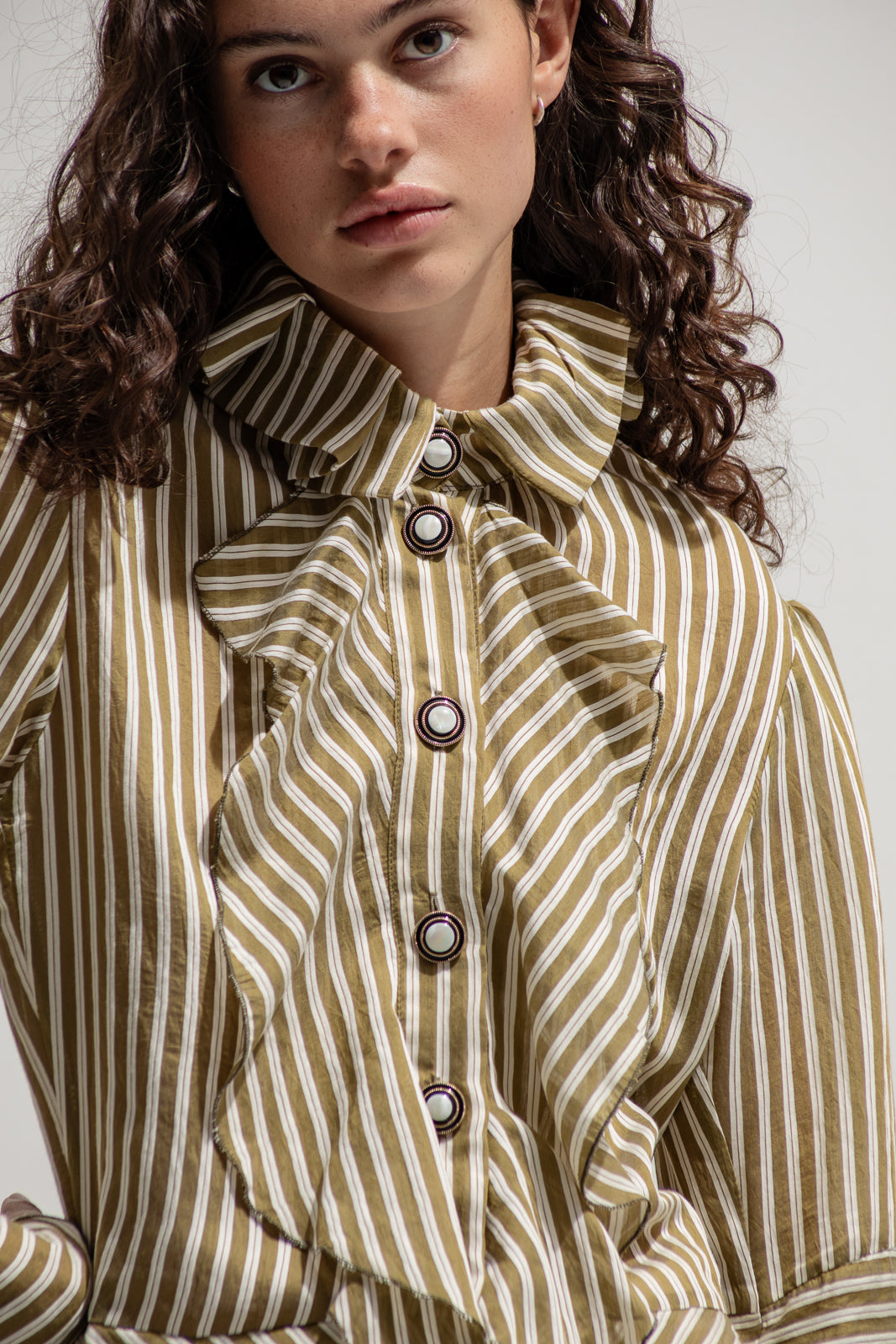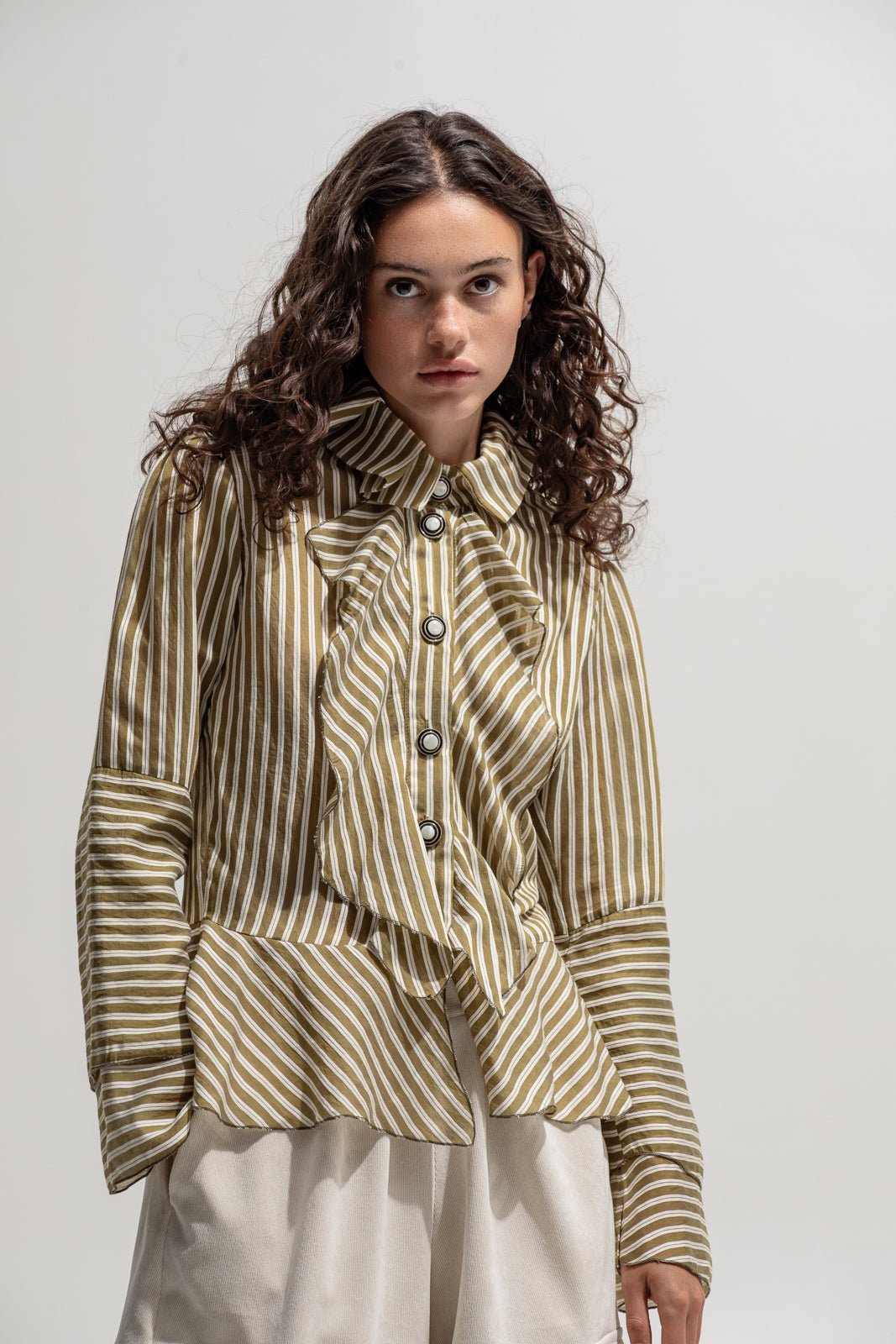 Made from lightweight cotton blend in olive and white stripes, it stands out with its sculptural collar and ruffled front placket.