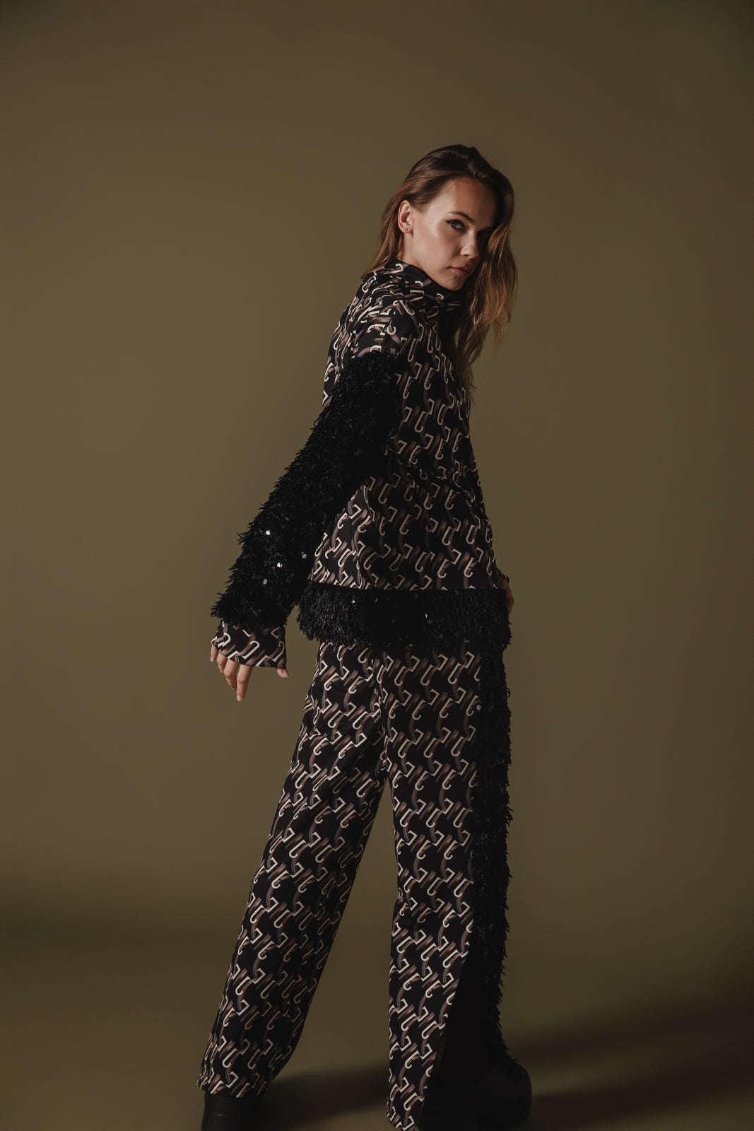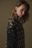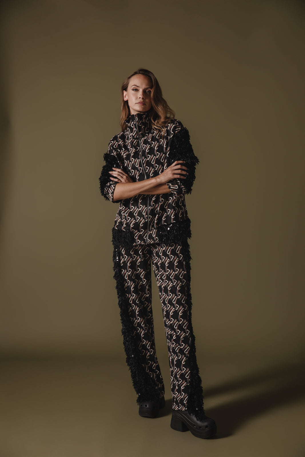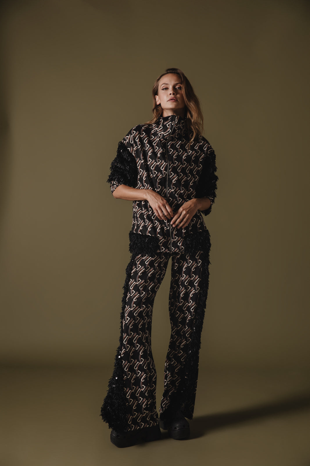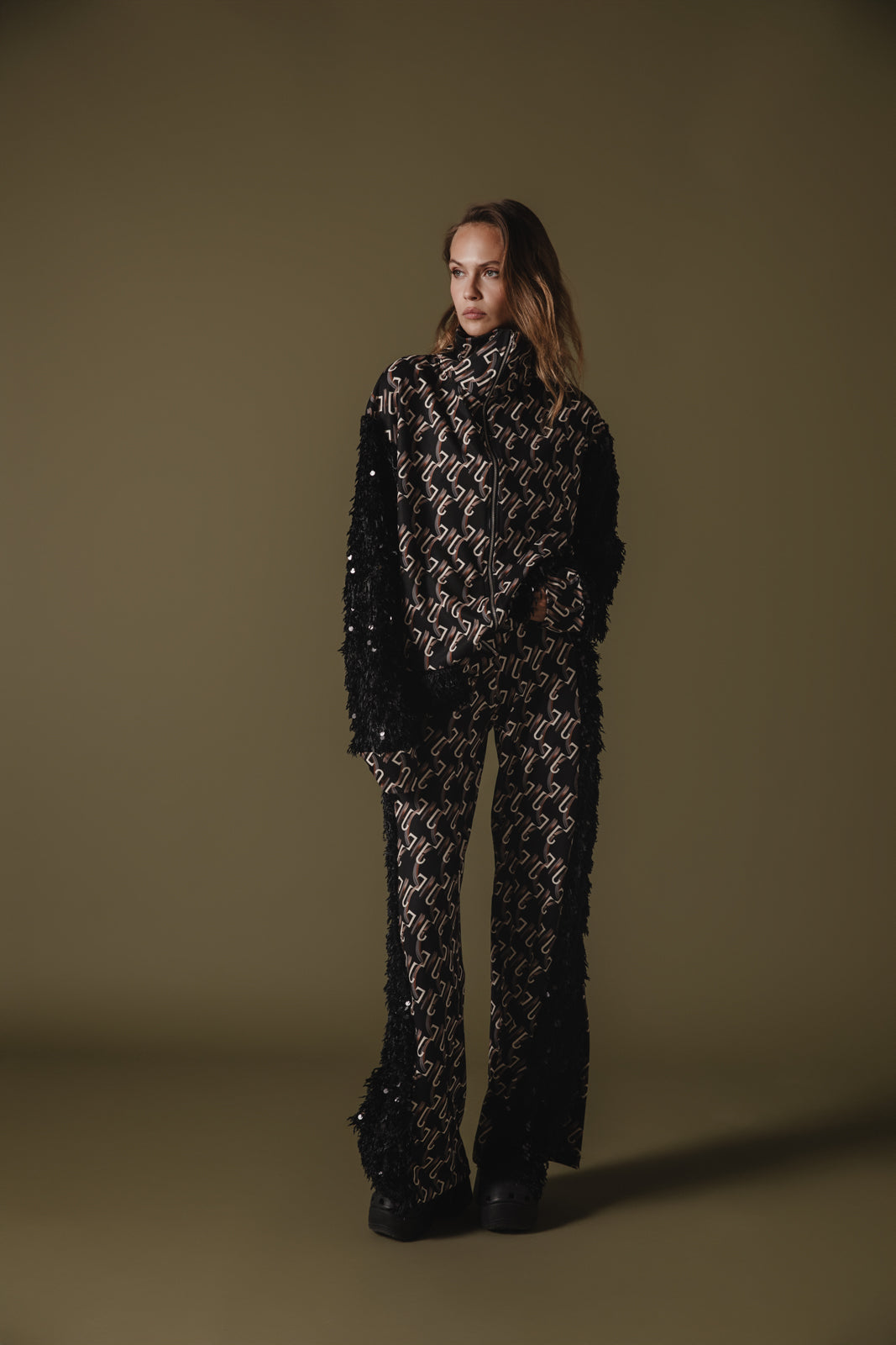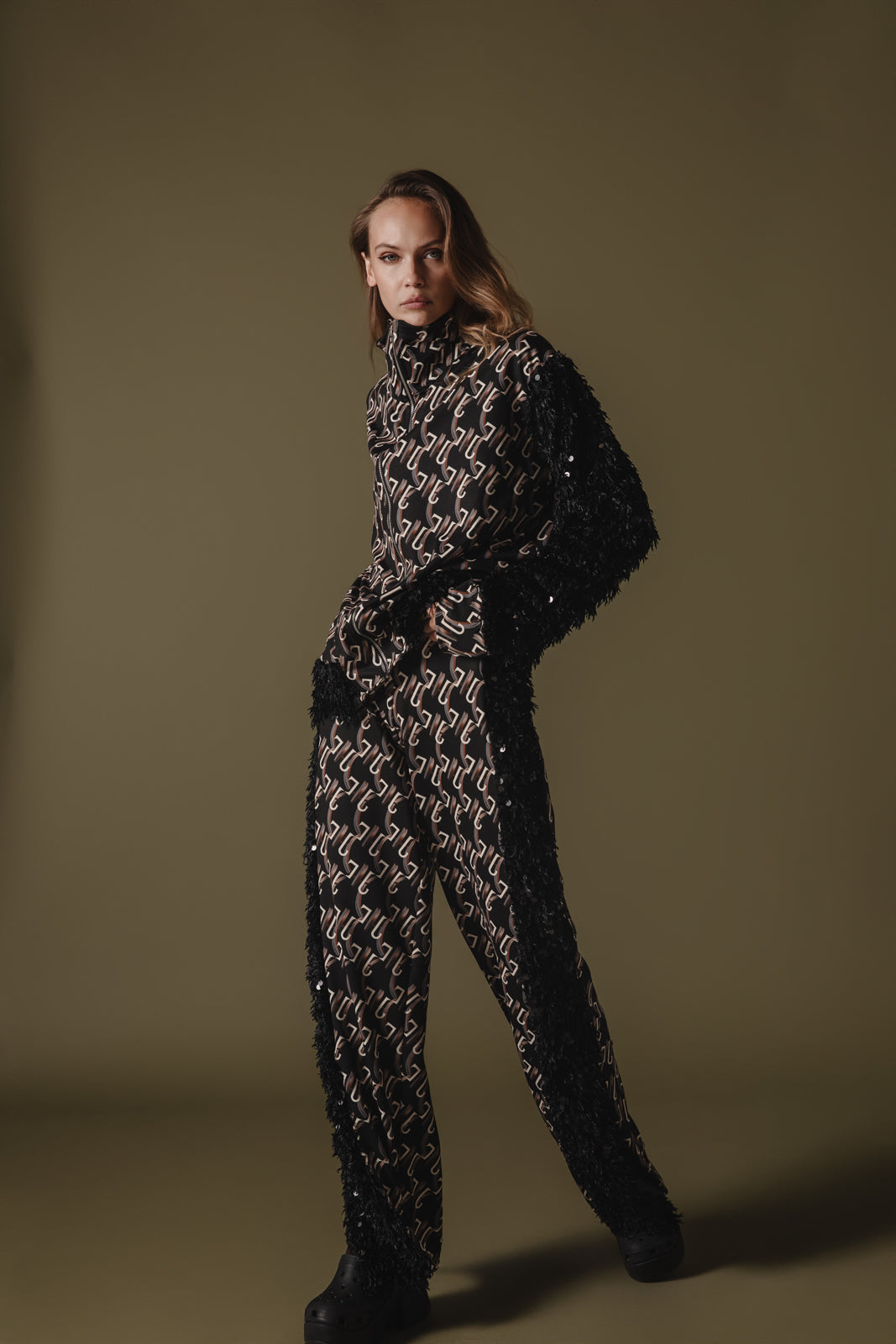 This bomber jacket has a unique custom logo pattern that consists of interlocking shapes, giving it a chic, modern design. The color palette is mostly neutral, with the base being black and the logo pattern in a lighter shade. It features contrasting black textured fabric on the sleeves, decorated with sequins, adding a dramatic flair to the otherwise sleek design.