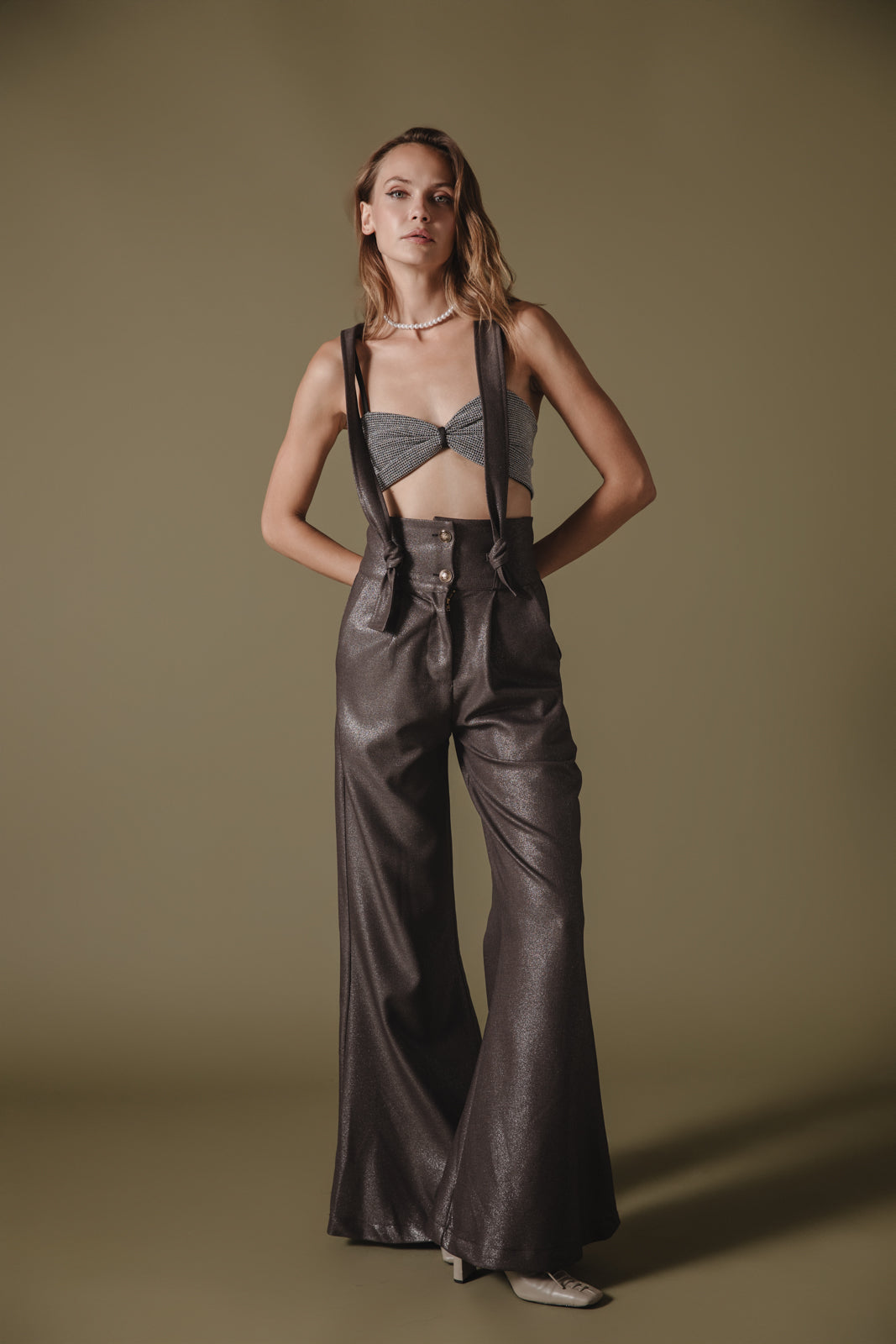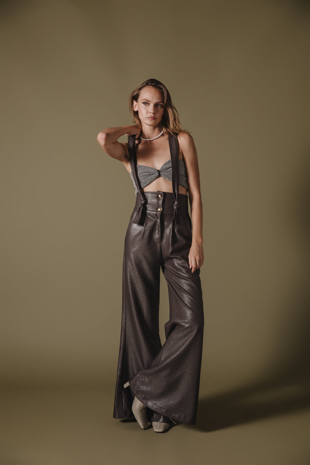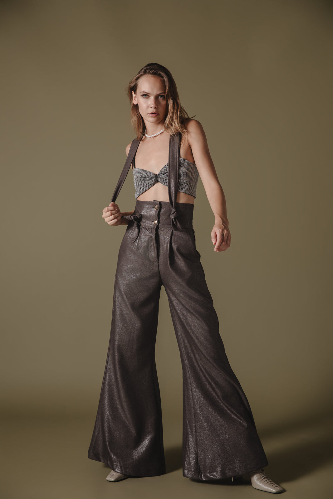 These high-waisted metallic wide-leg pants offer a bold, fashion-forward look. Featuring statement suspenders and a buttoned front, they bring a touch of modern sophistication to any outfit. The shimmering fabric and relaxed silhouette make them perfect for both day and evening wear, combining comfort with style. Pair them with a fitted top to emphasize the dramatic volume of the trousers for a striking ensemble.
