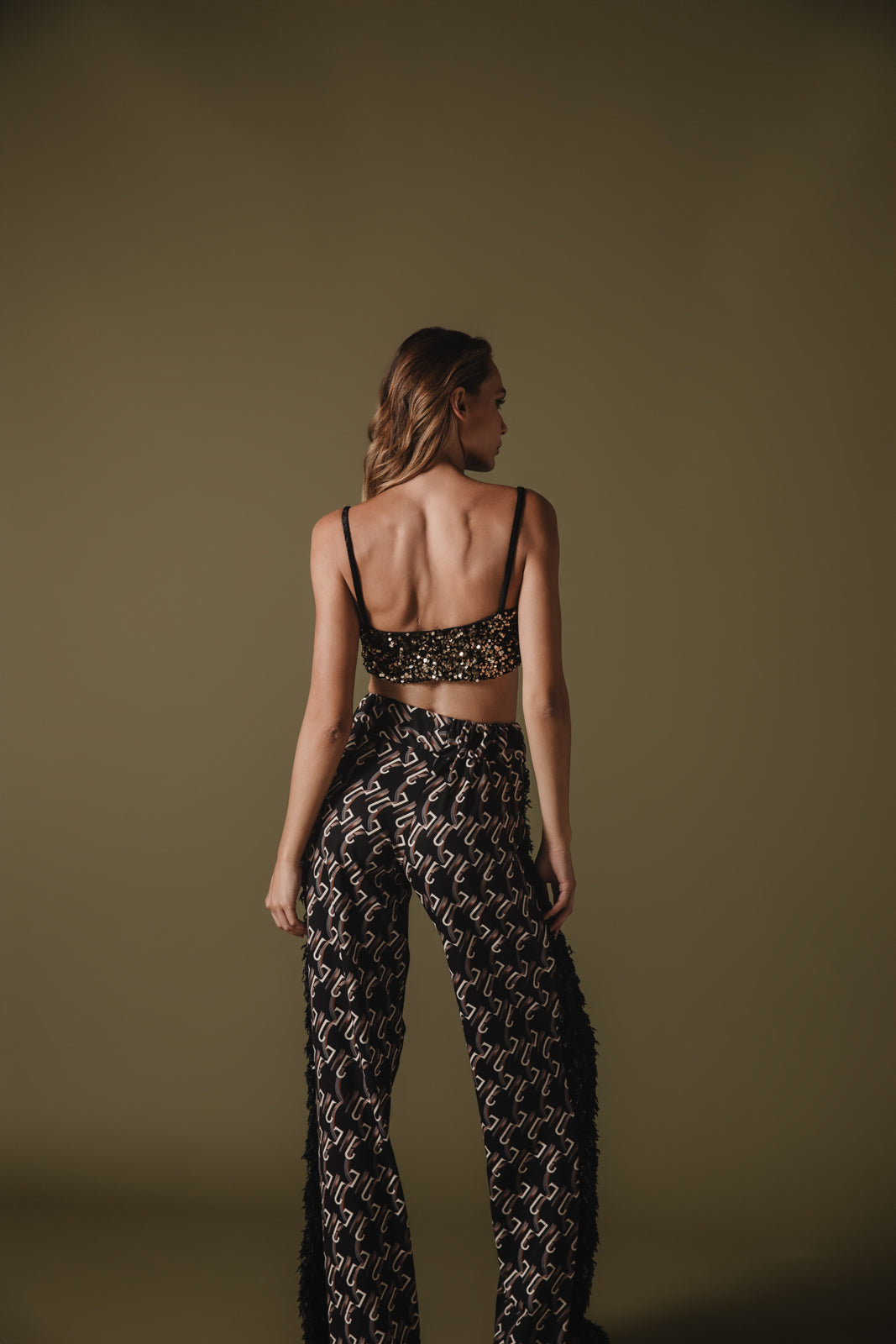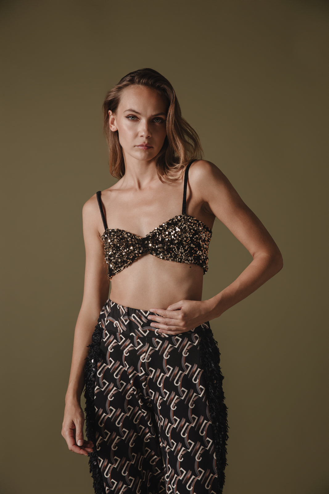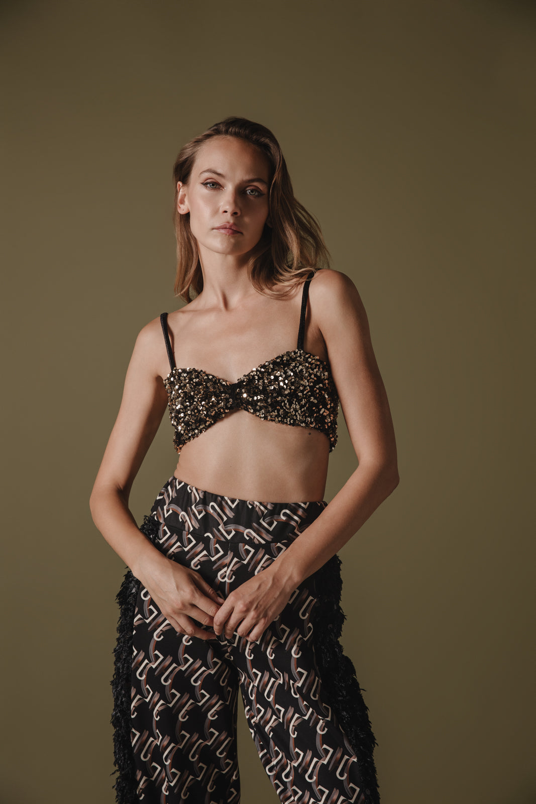 Shine bright in this eye-catching gold sequin bralette, designed for those who love a touch of glamour. Featuring a chic knotted front and shimmering gold sequins, this piece adds a bold statement to any outfit. Pair it with high-waisted trousers or layer under a jacket for a night out. Perfect for adding sparkle to your wardrobe.