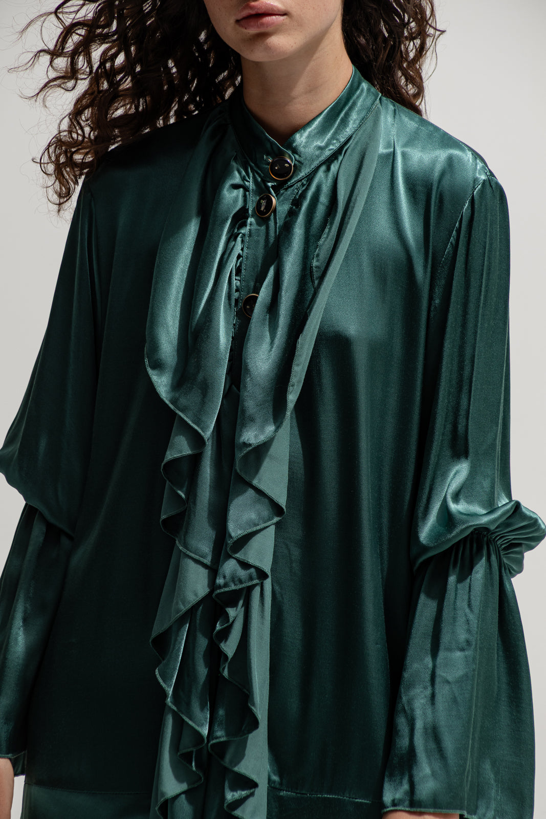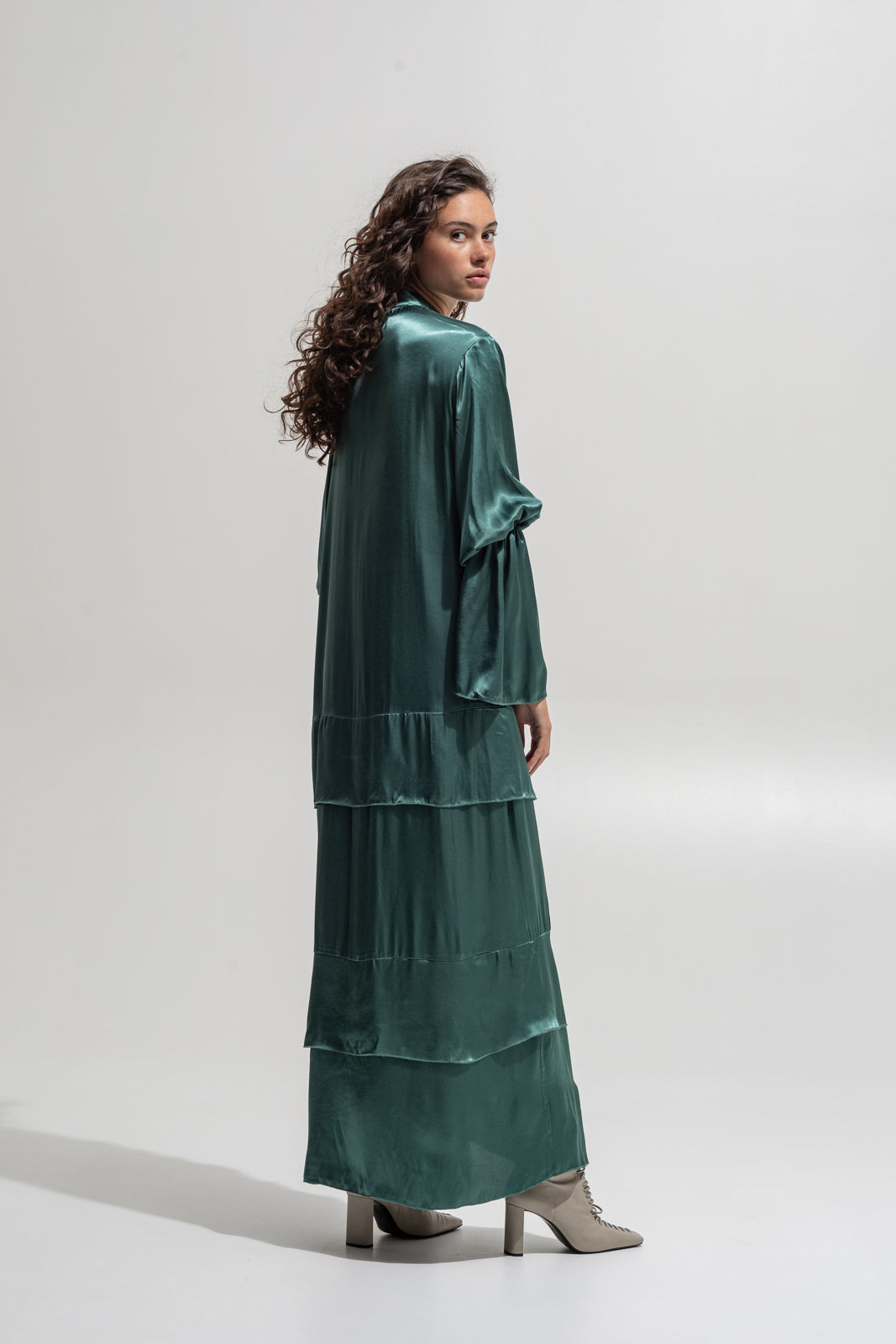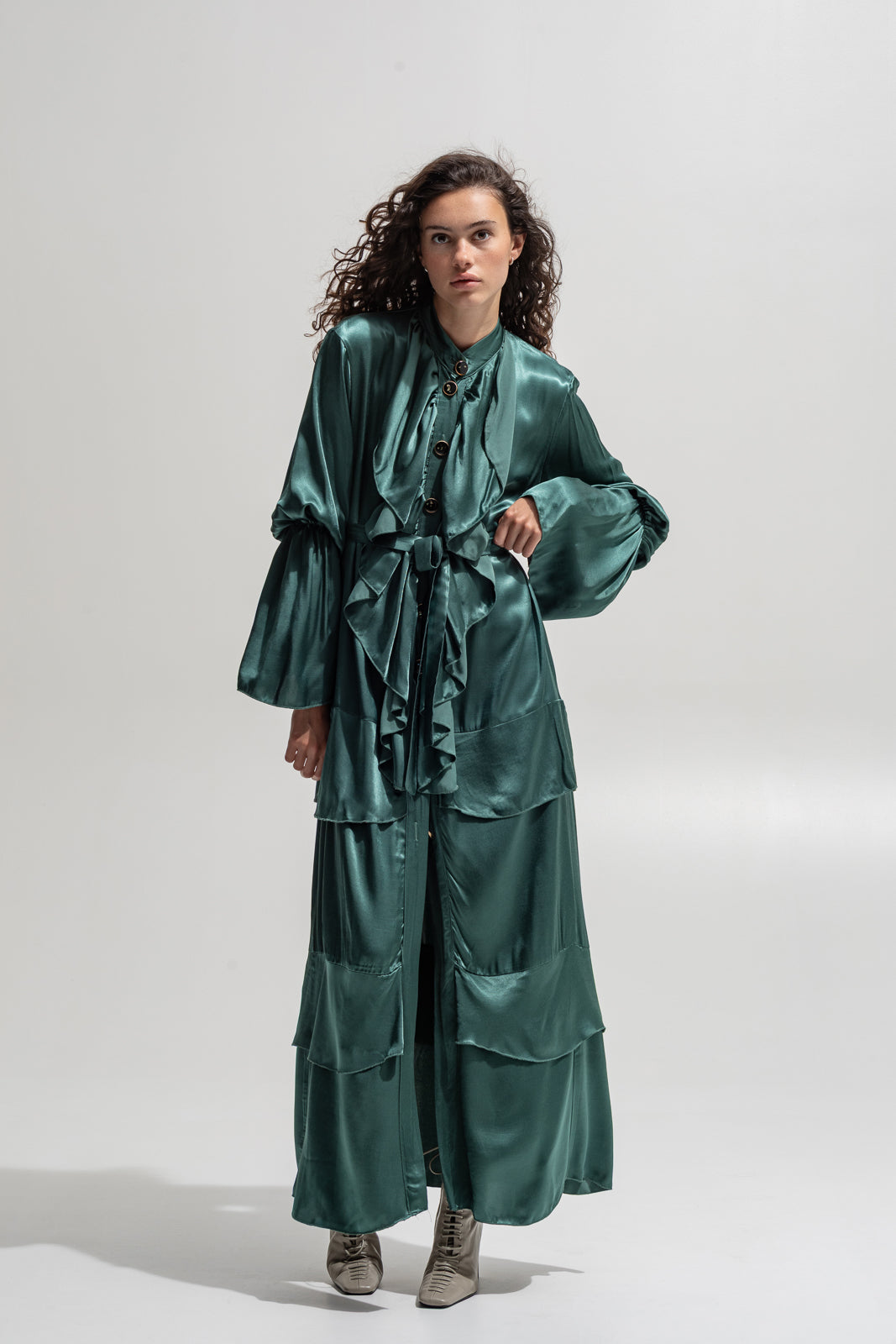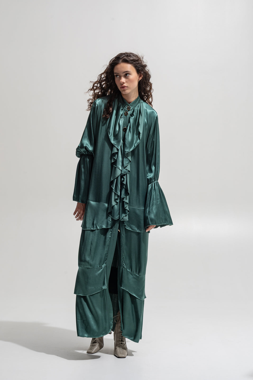 Channel timeless elegance with this emerald satin maxi dress, designed in a flowing silhouette that moves with ease. Crafted from lustrous satin, it features dramatic ruffle detailing cascading down the front, a high neckline with statement buttons, and voluminous sleeves gathered at the cuffs for a romantic touch. The detachable waist belt allows for a defined fit, giving versatility to the styling.