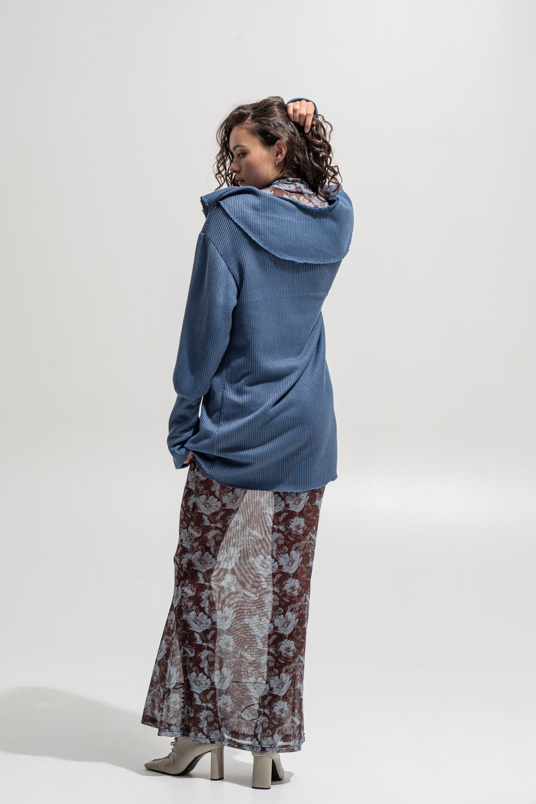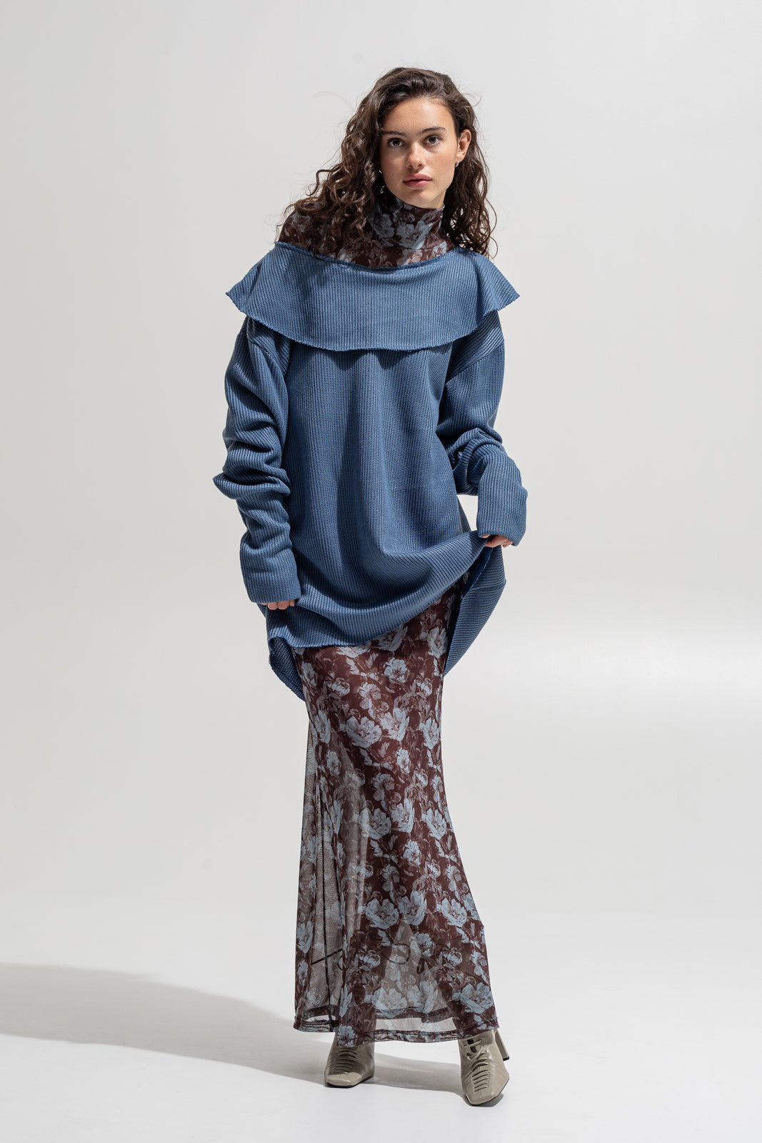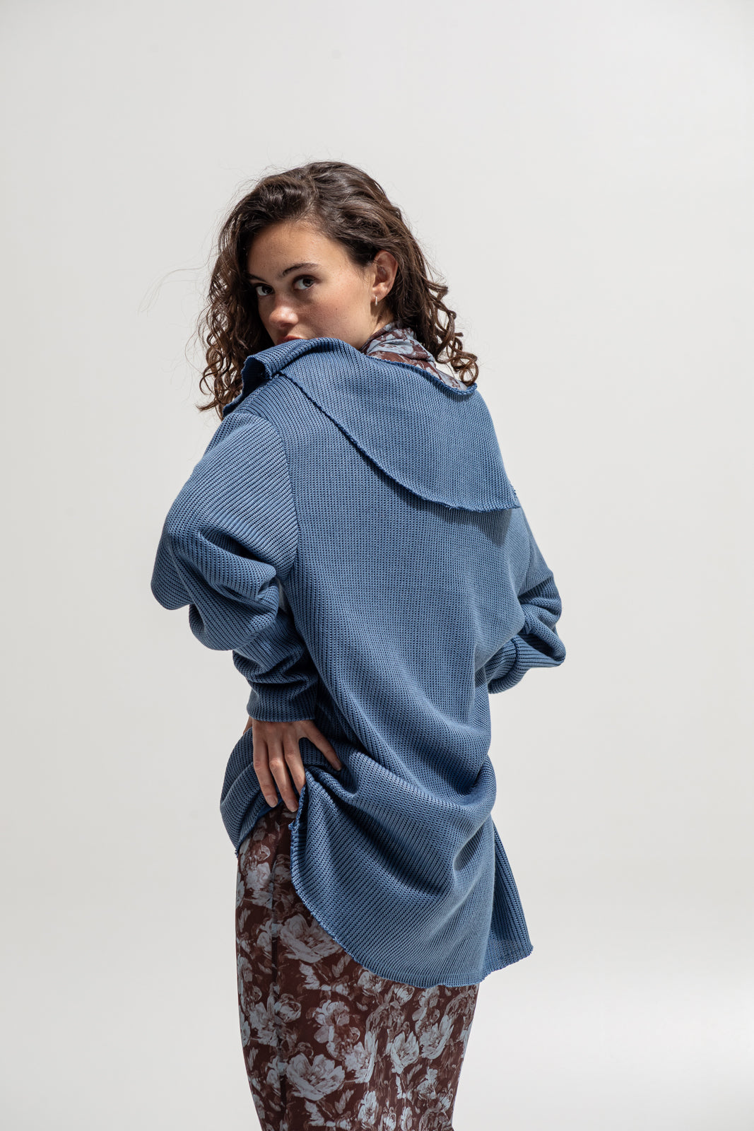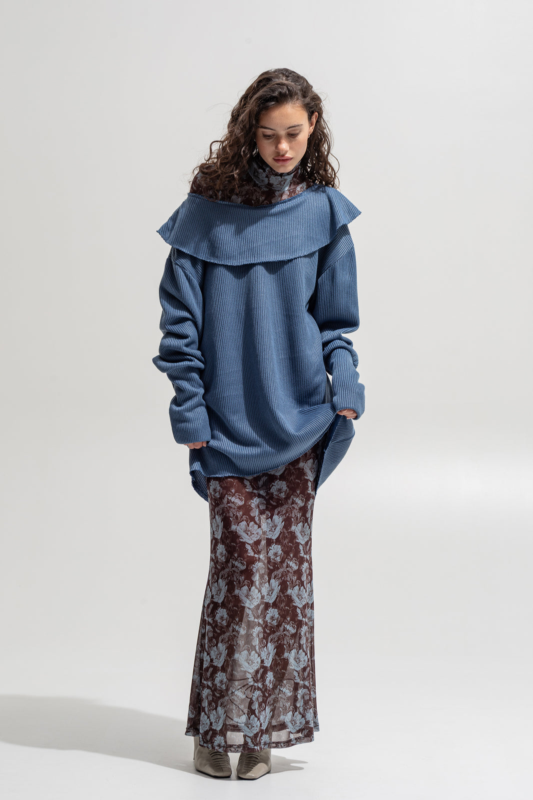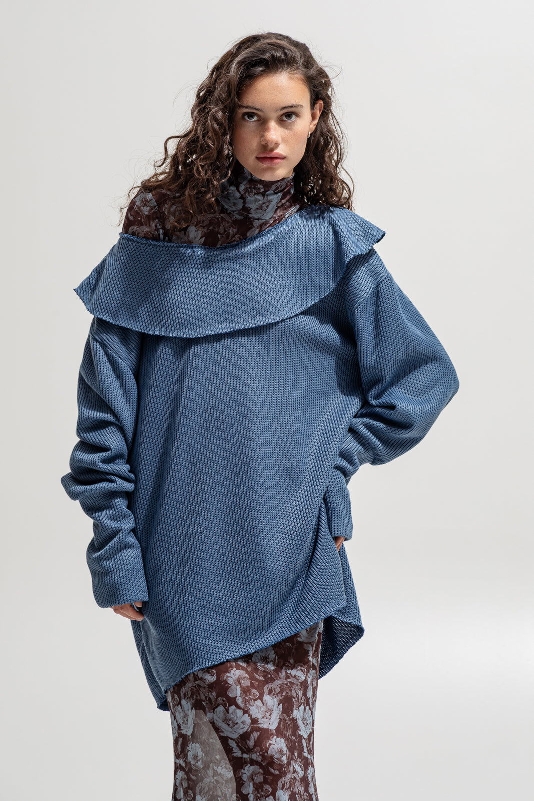 A cozy yet statement piece. Designed in an oversized fit with long sleeves and soft waffle-knit texture, this sweatshirt features a bold wide collar that drapes over the shoulders, creating a unique feminine silhouette. Perfect for layering over dresses, shirts, or styling with trousers for both casual and edgy looks.