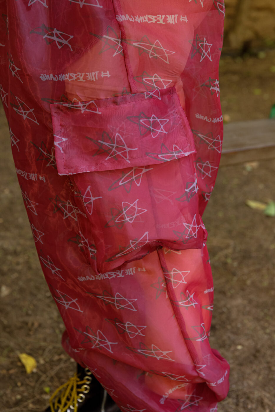 Cargo-cute in a different point of view, these pants feature a transparent, staple, printed fabrication, flattering panel waist and plenty of pockets.