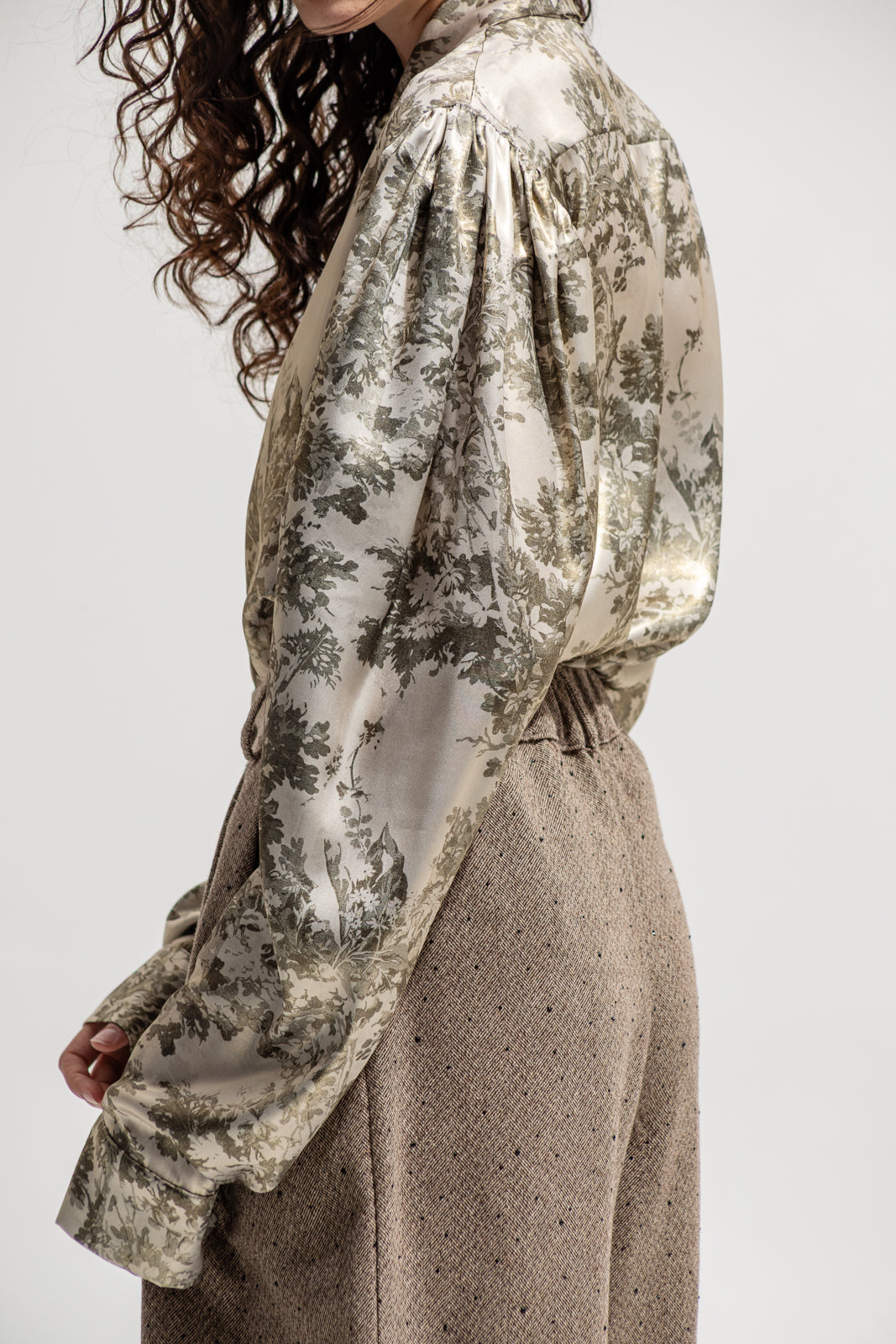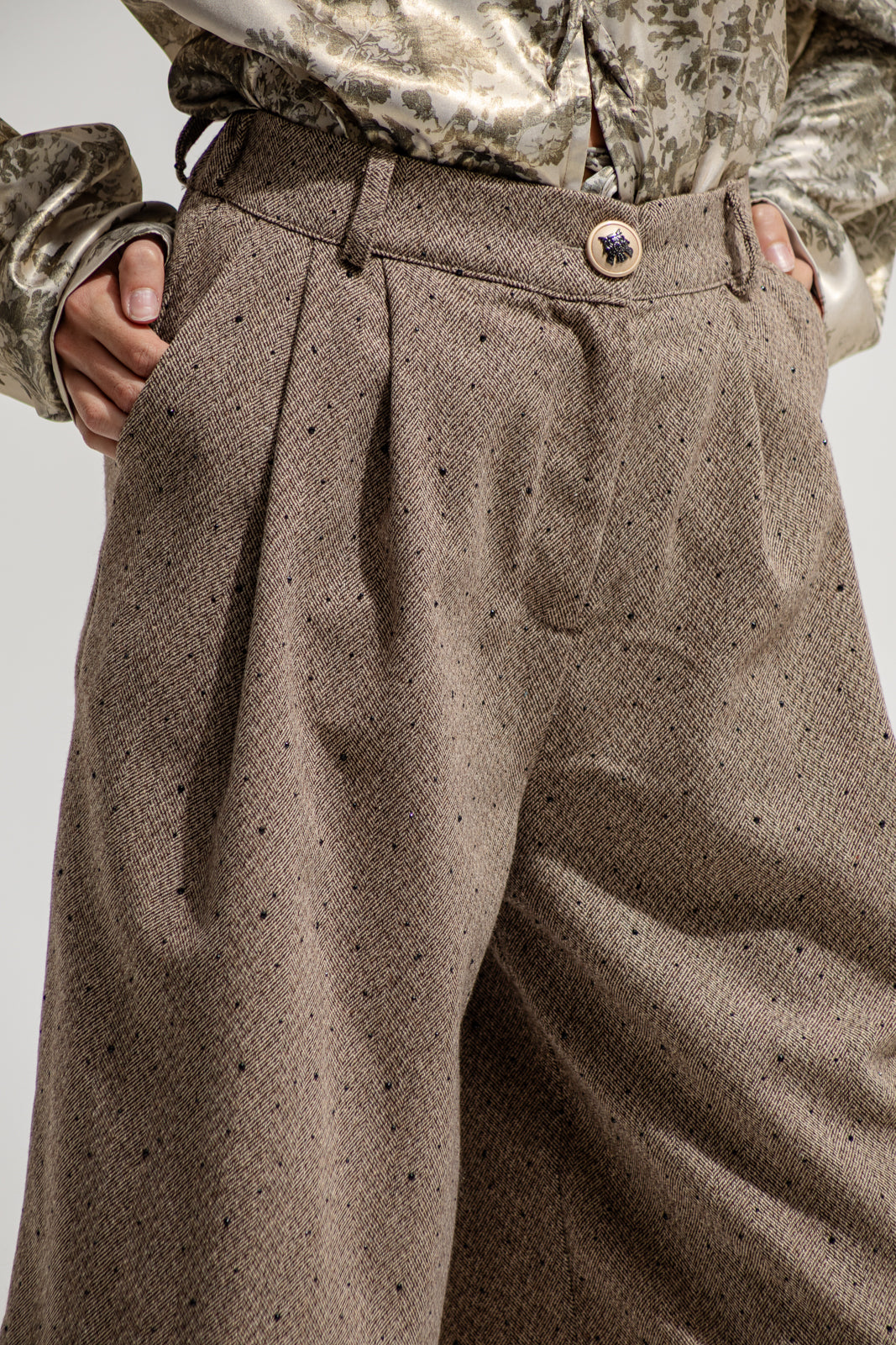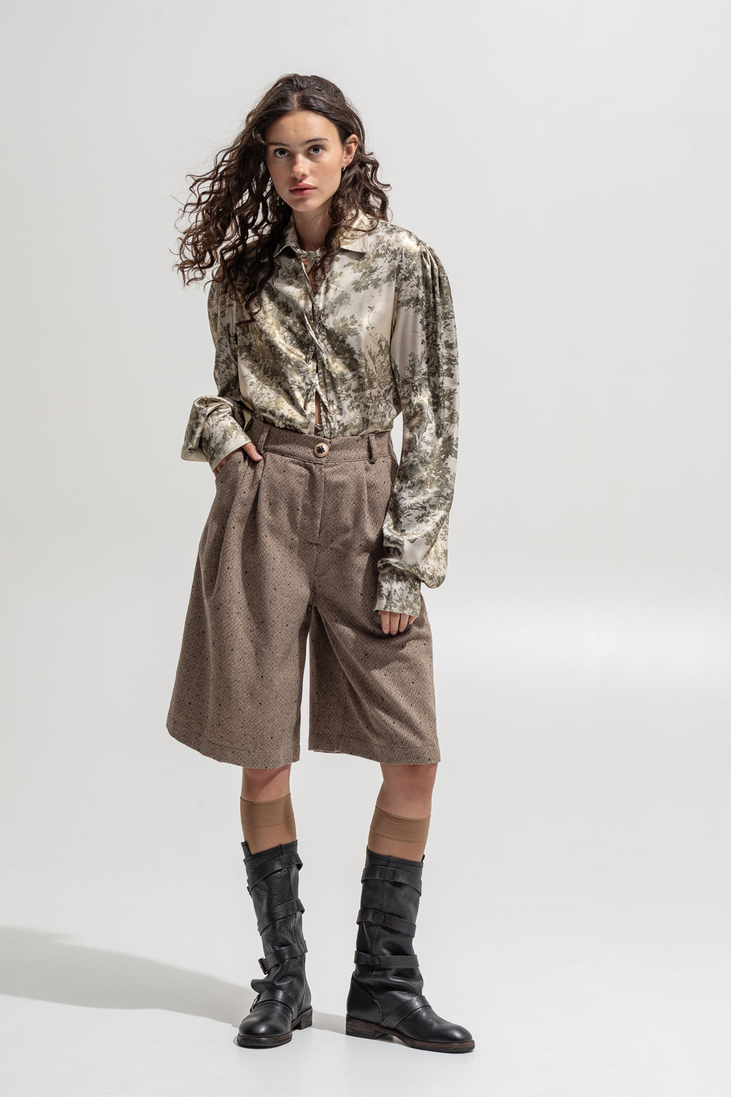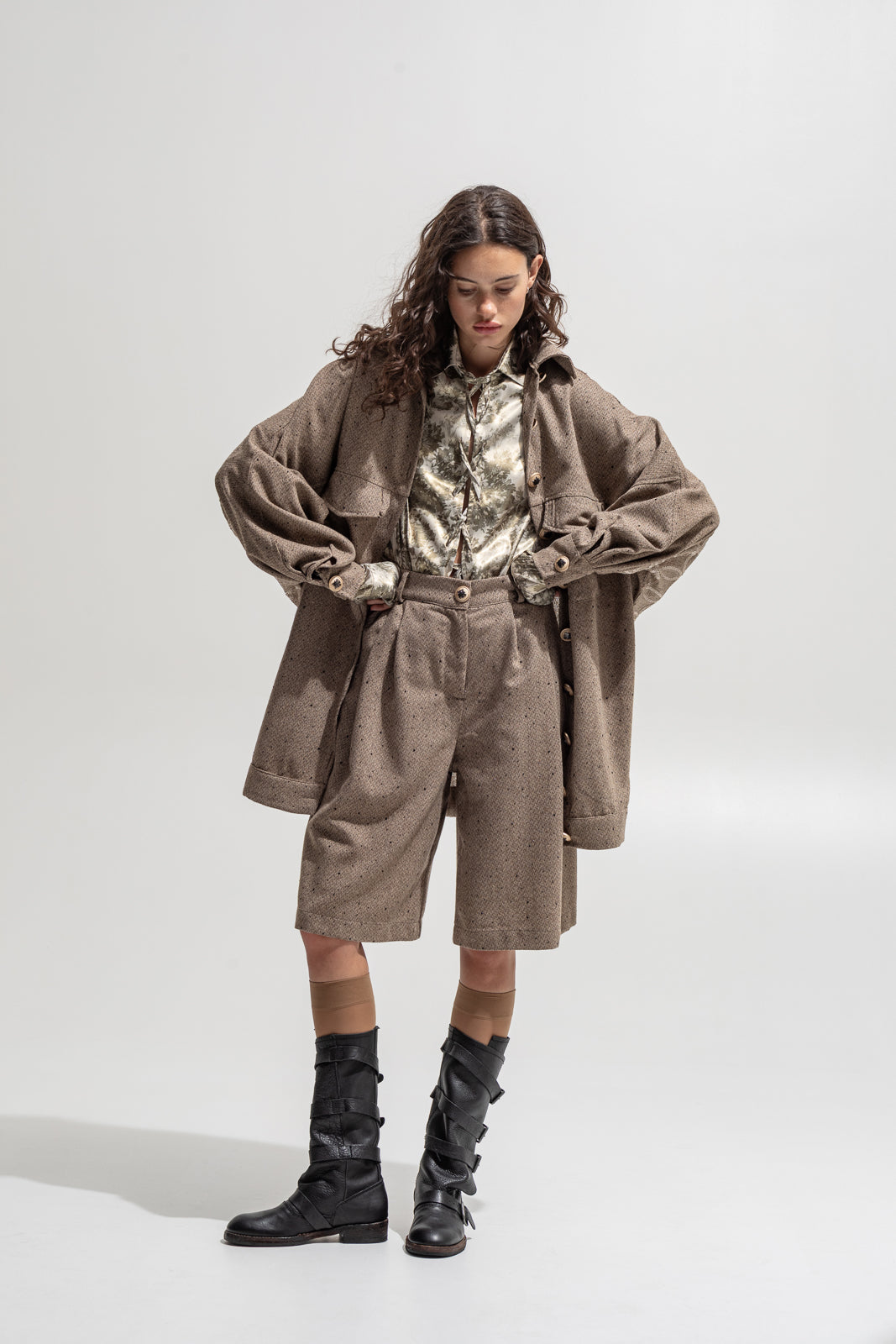 These high-waisted wool-blend bermudas redefine structured comfort — crafted in warm beige herringbone with subtle black specks and soft pleats at the front. Designed to sit at the waist with a relaxed leg, they bring that effortless balance between refined and raw. Pair them with the matching jacket or a satin shirt for the ultimate gang uniform look.